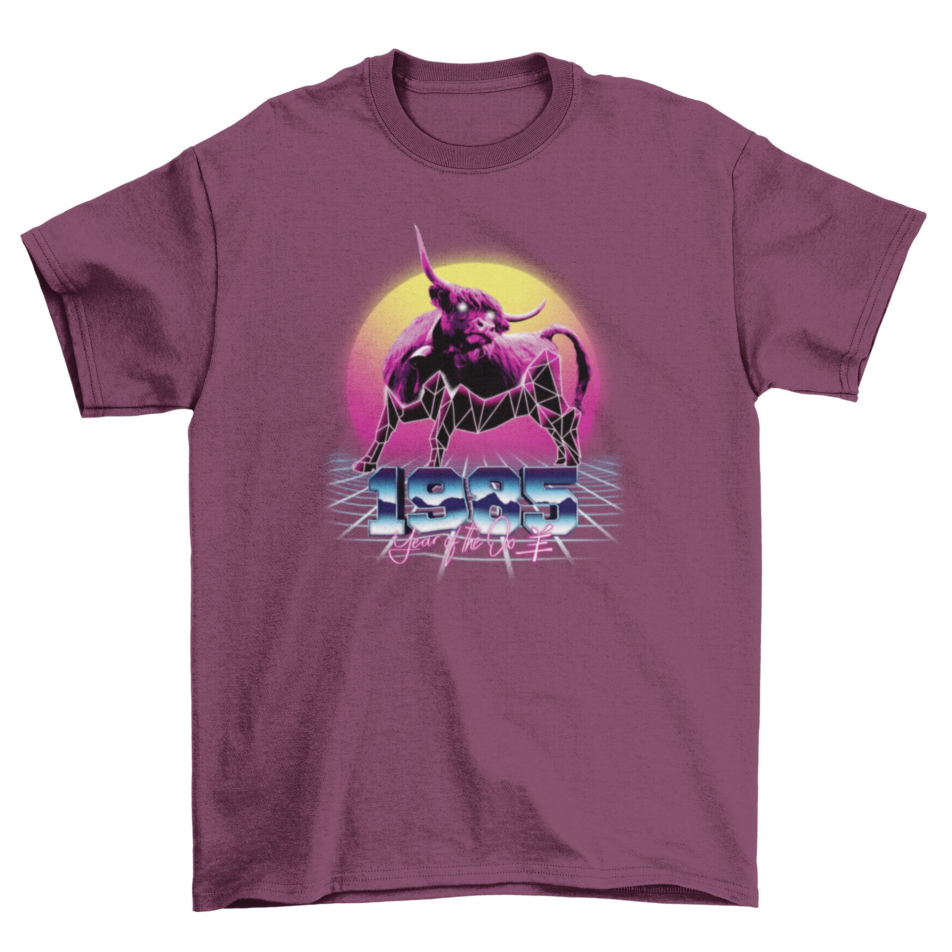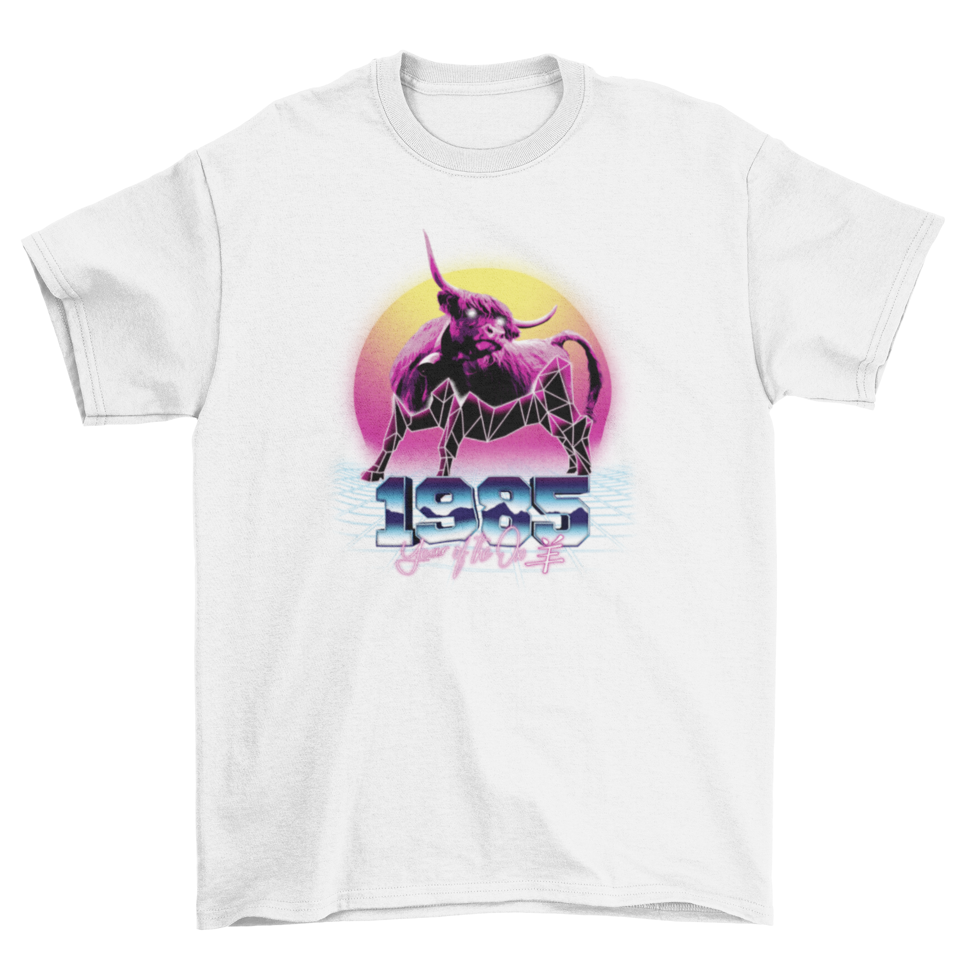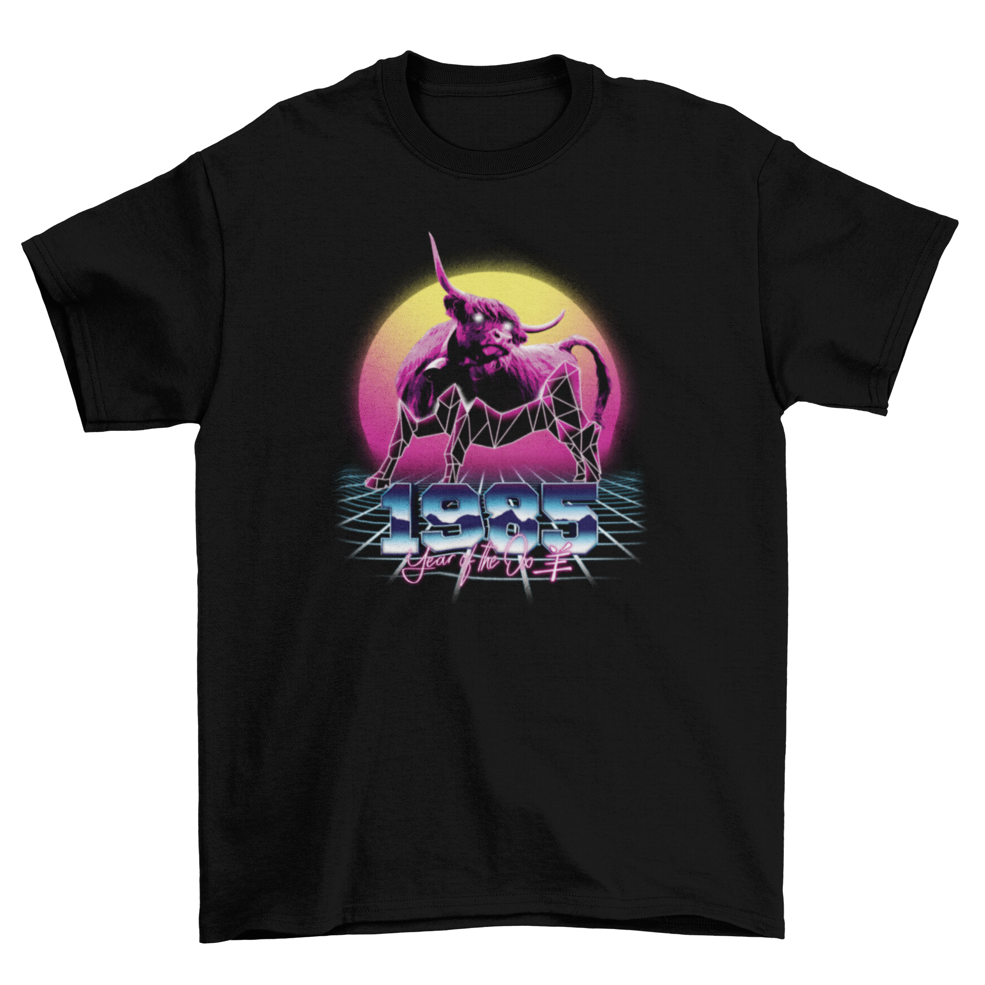 Introducing our exclusive Chinese Zodiac 1985 Year of the Bull retrowave horoscope t-shirt, a perfect blend of style and cultural significance. This unique t-shirt is designed for those who appreciate astrology and the rich traditions of the Chinese Zodiac. The vibrant design features a striking bull graphic, symbolizing strength and determination, along with the quote '1985 Year of the Bull'.