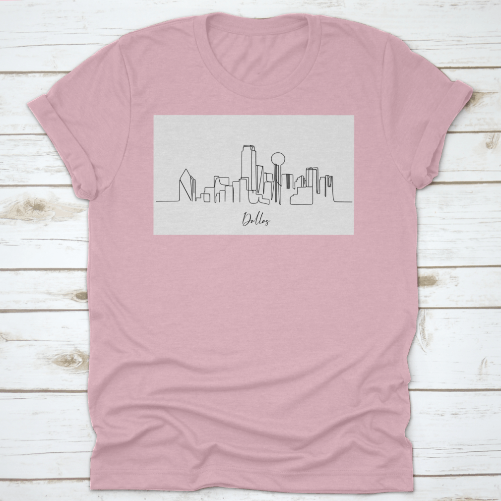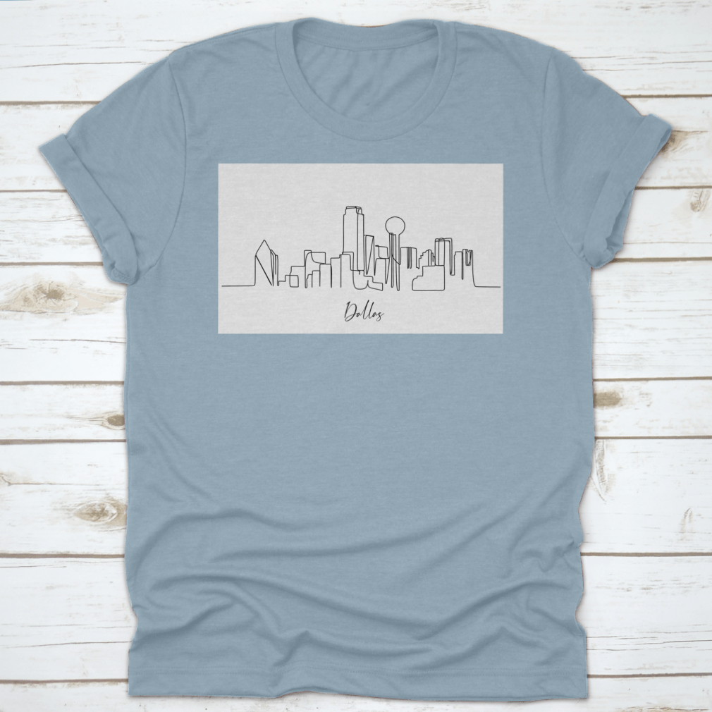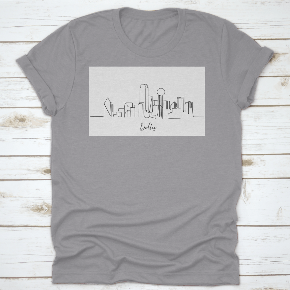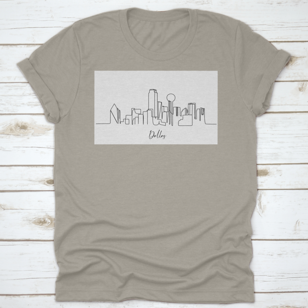 A stylish line art shirt featuring the iconic skyline of Dallas, Texas, showcasing its unique architectural landmarks.