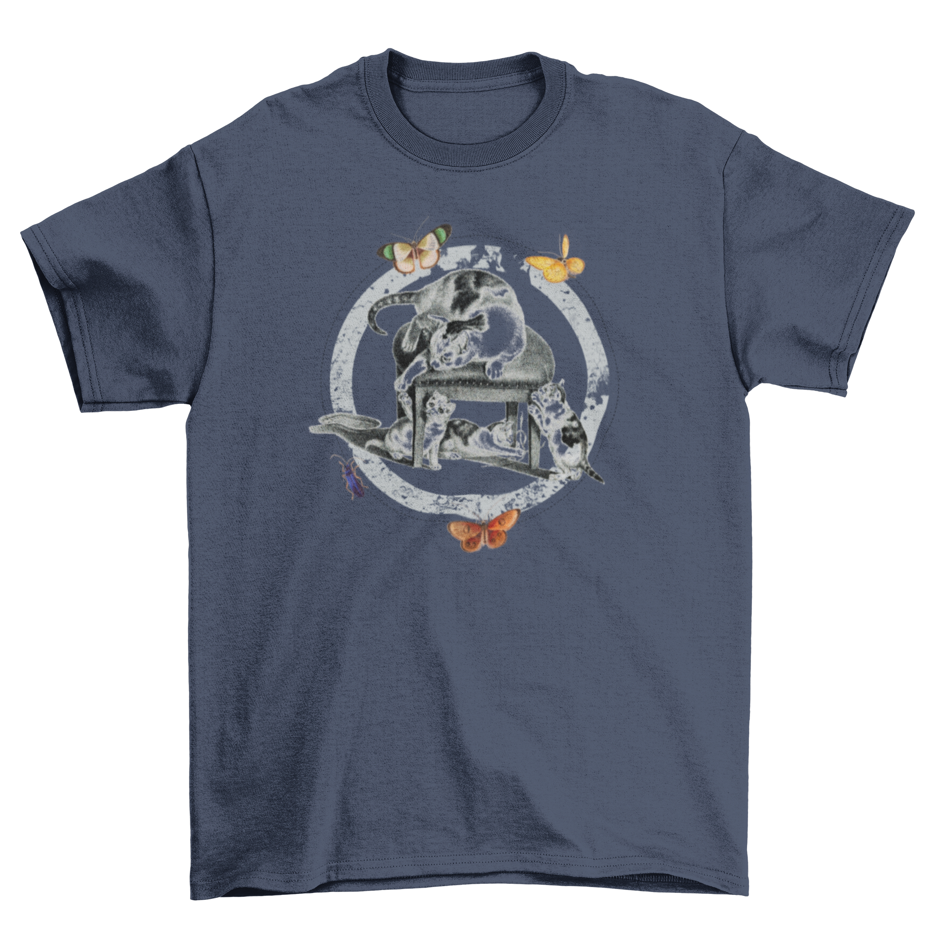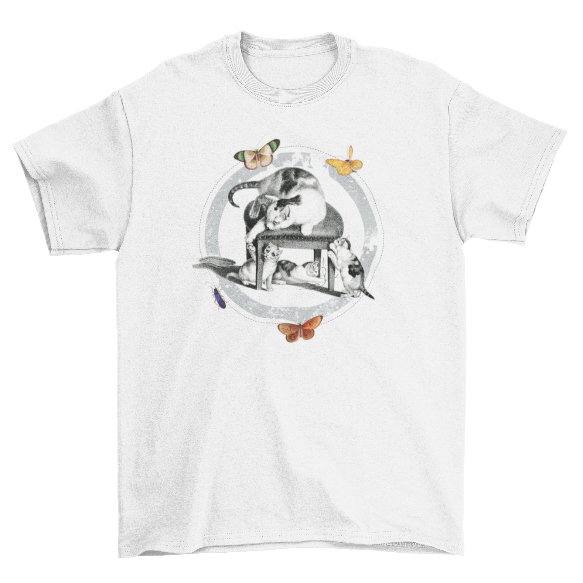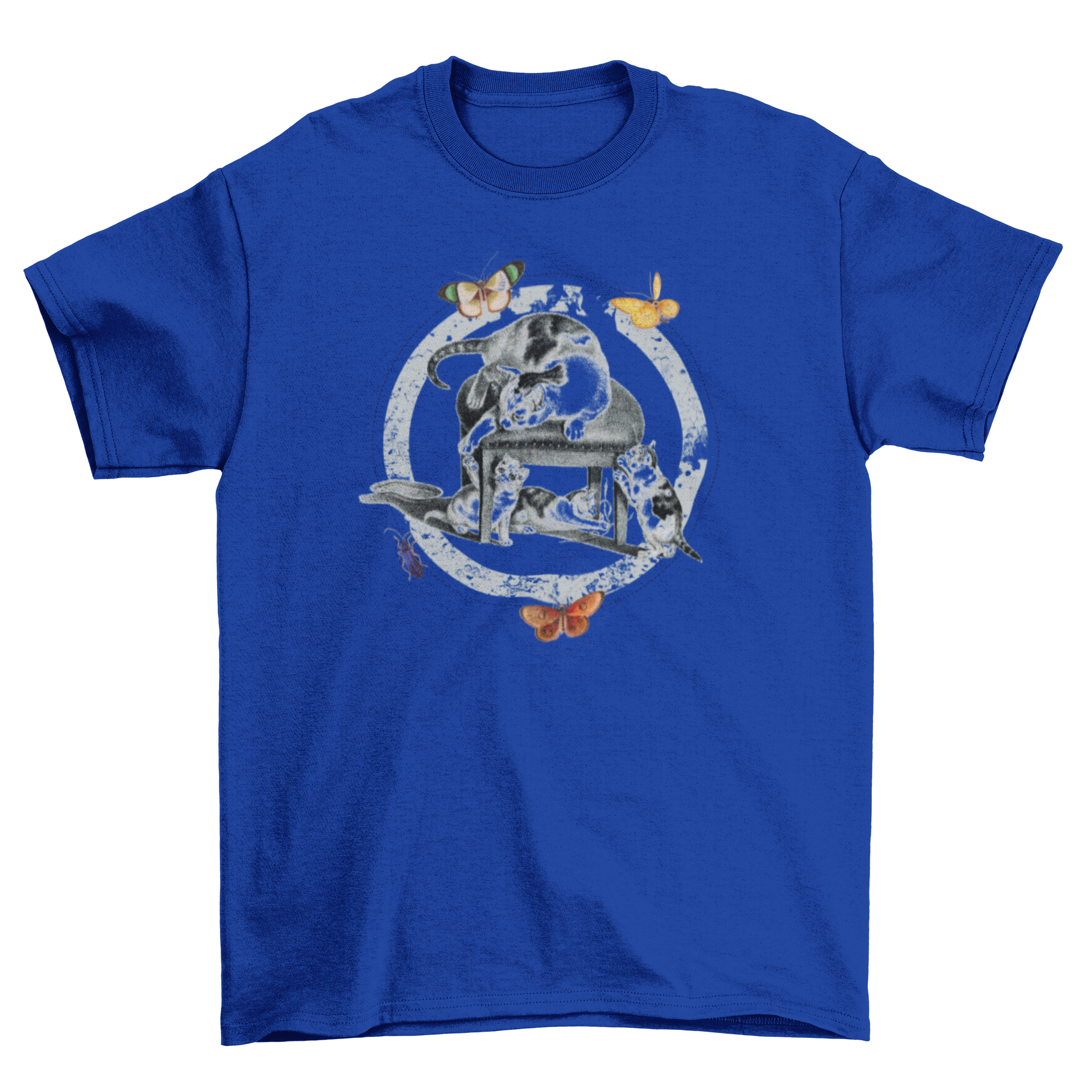 The standout feature of this t-shirt is its adorable design. The playful cats are depicted in various poses, interacting with vibrant butterflies, creating a fun and lively aesthetic. This design is not only cute but also trendy, making it suitable for a variety of occasions. Whether you're heading out for a casual day with friends or simply lounging at home, this tee will keep you looking stylish.