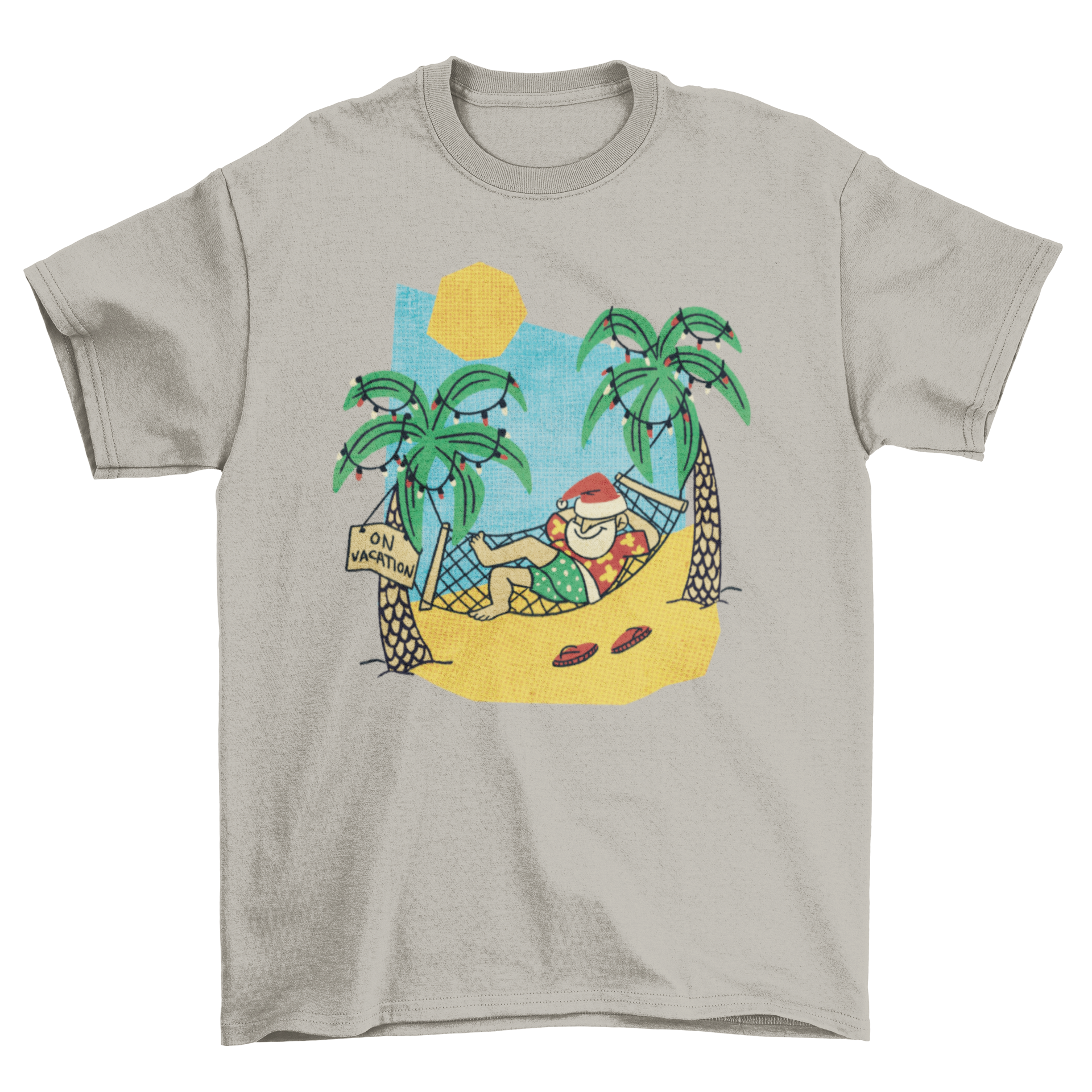 Cartoon-style t-shirt design featuring Santa relaxing on a beach, wearing sunglasses and enjoying summer vibes.
