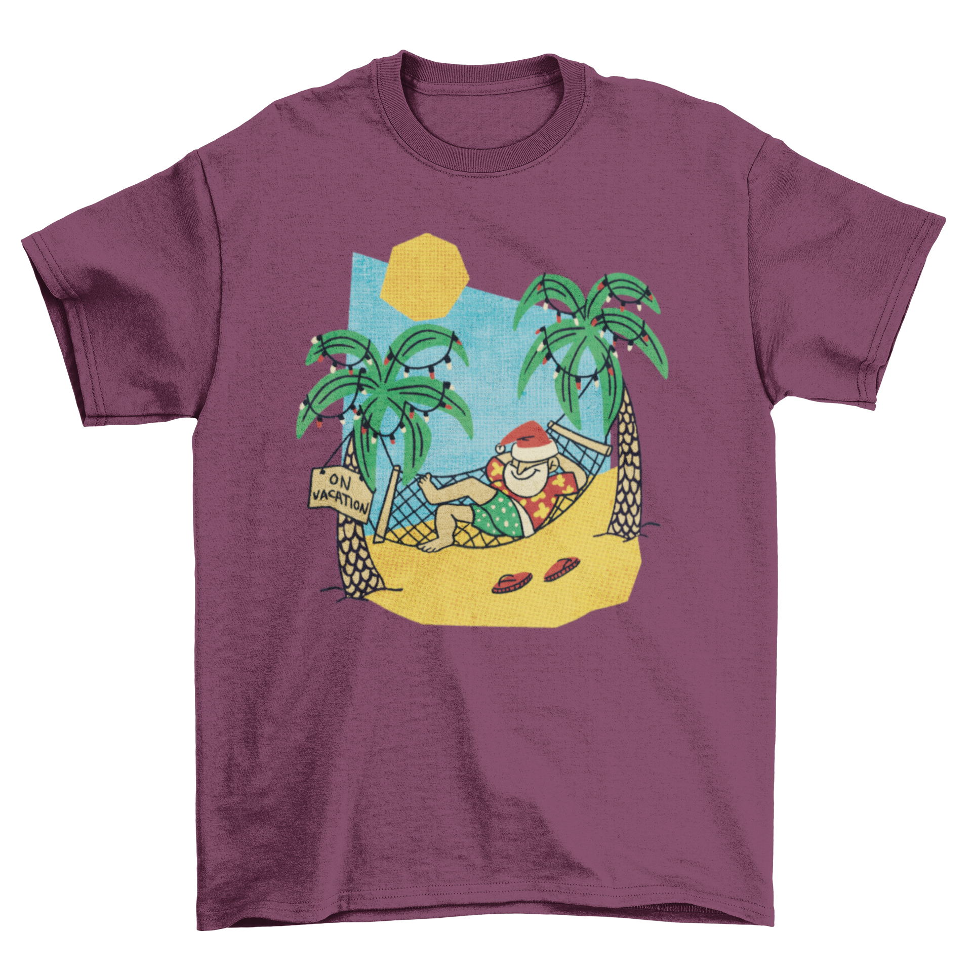 This t-shirt design stands out with its playful and colorful illustration of Santa, who is not just about winter festivities anymore. Our Cool Fashion Santa is depicted lounging on the beach, embodying the spirit of summer vacations. This design is perfect for those who want to celebrate the holidays in a fun and unconventional way.