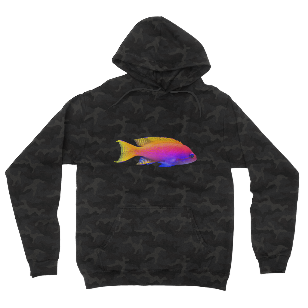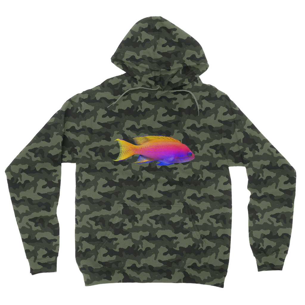 Introducing the Colorful Fish Camouflage Adult Hoodie, a must-have addition to your wardrobe that combines style and comfort effortlessly. This hoodie features a striking all-over camouflage design that not only keeps you on-trend but also adds a unique flair to your casual outfits. Made from a blend of 70% cotton and 30% polyester, this hoodie is designed to provide a soft and comfortable fit, making it perfect for everyday wear.