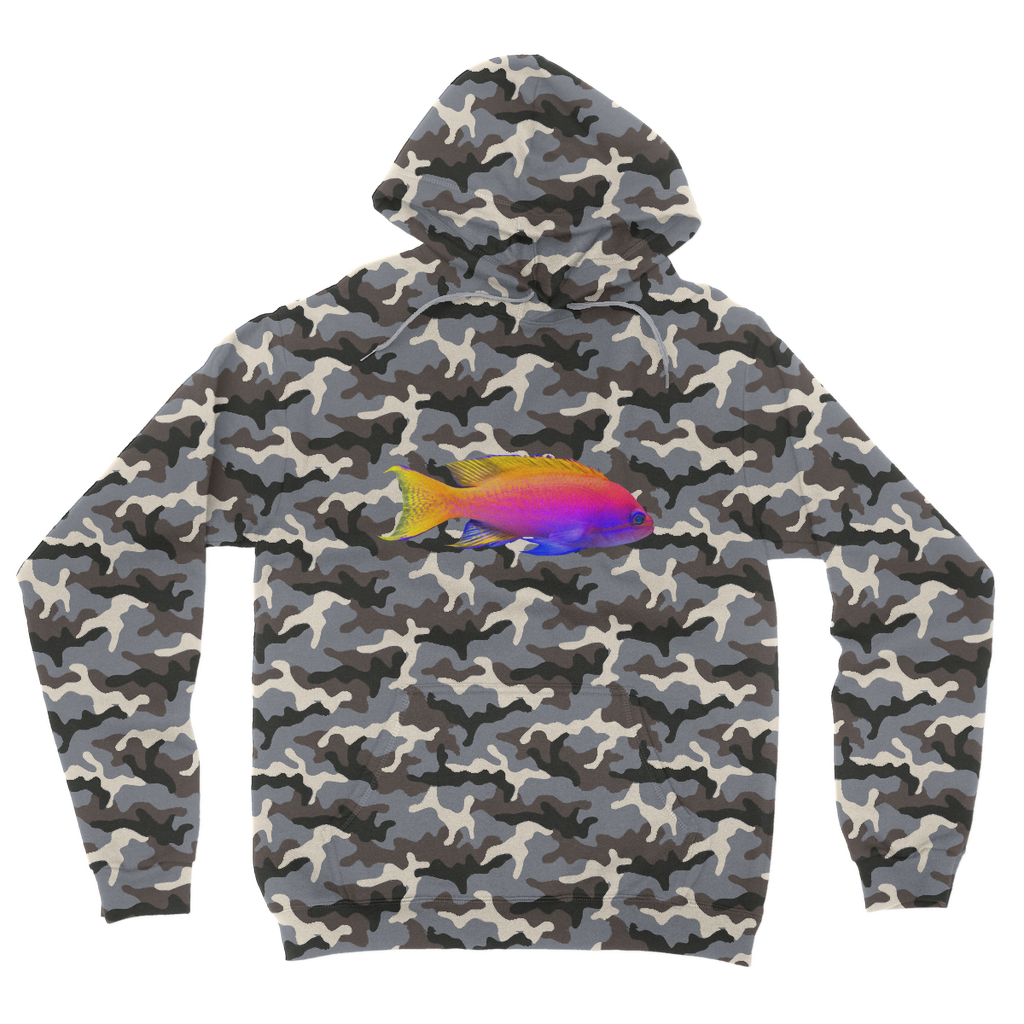 Elevate your casual wardrobe with the Colorful Fish Camouflage Adult Hoodie today and enjoy the perfect blend of style, comfort, and responsible production!