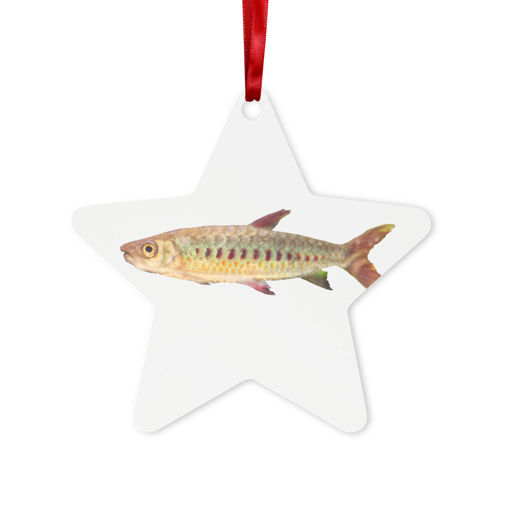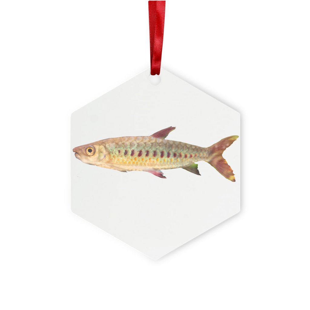 Colorful Fish Metal Hanging Ornament with red ribbon and gold string, available in hexagon and star shapes, beautifully packaged in a white box.
