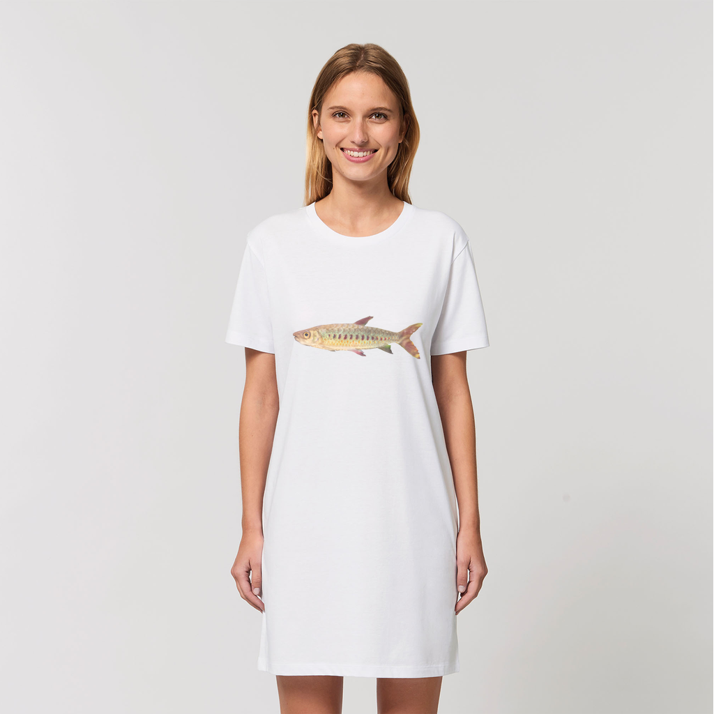 A vibrant Colorful Fish Organic T-Shirt Dress made from 100% organic cotton, featuring a playful fish print design, perfect for casual wear.