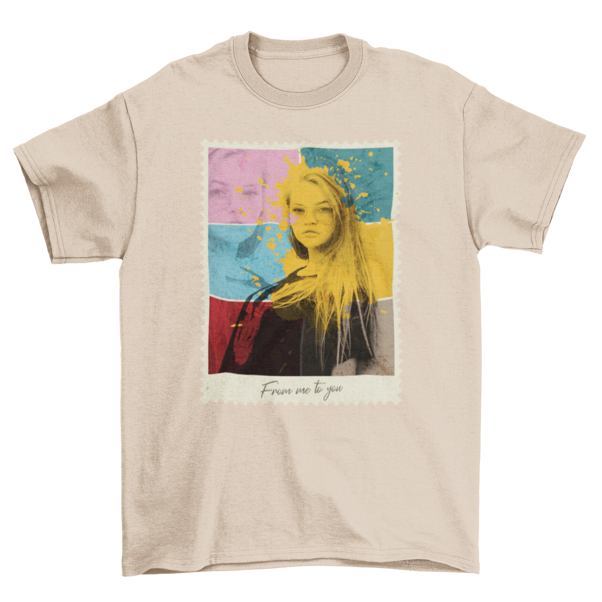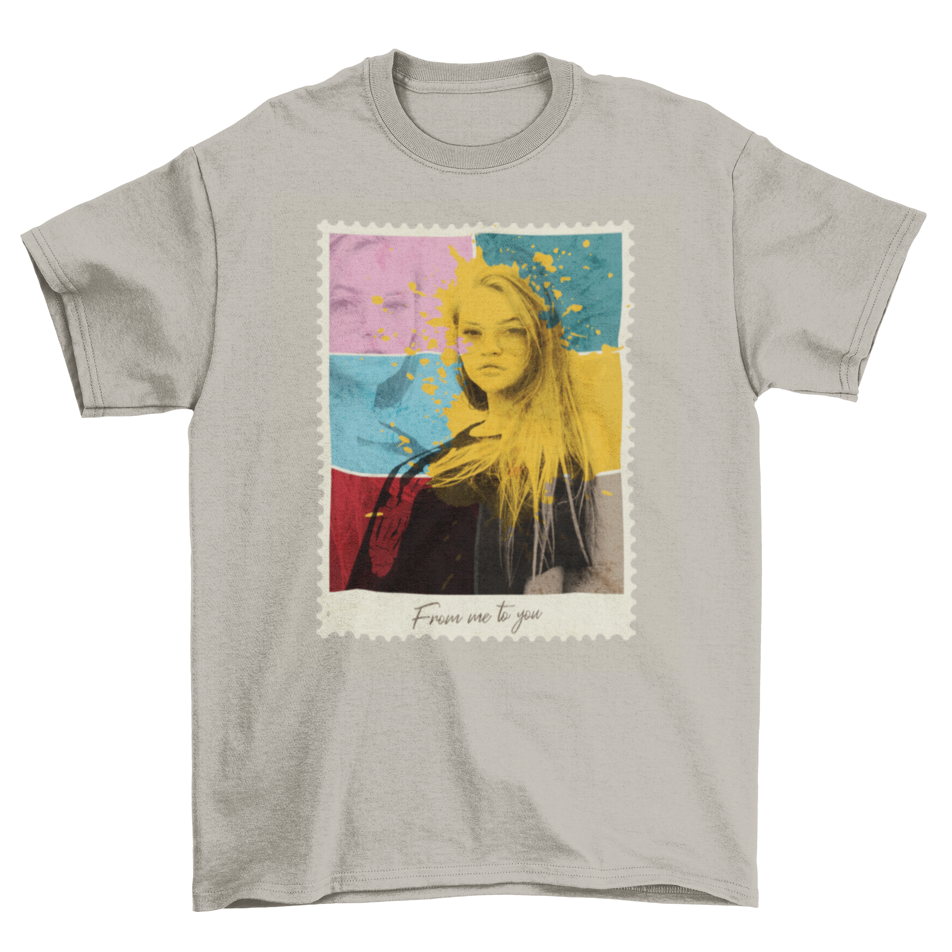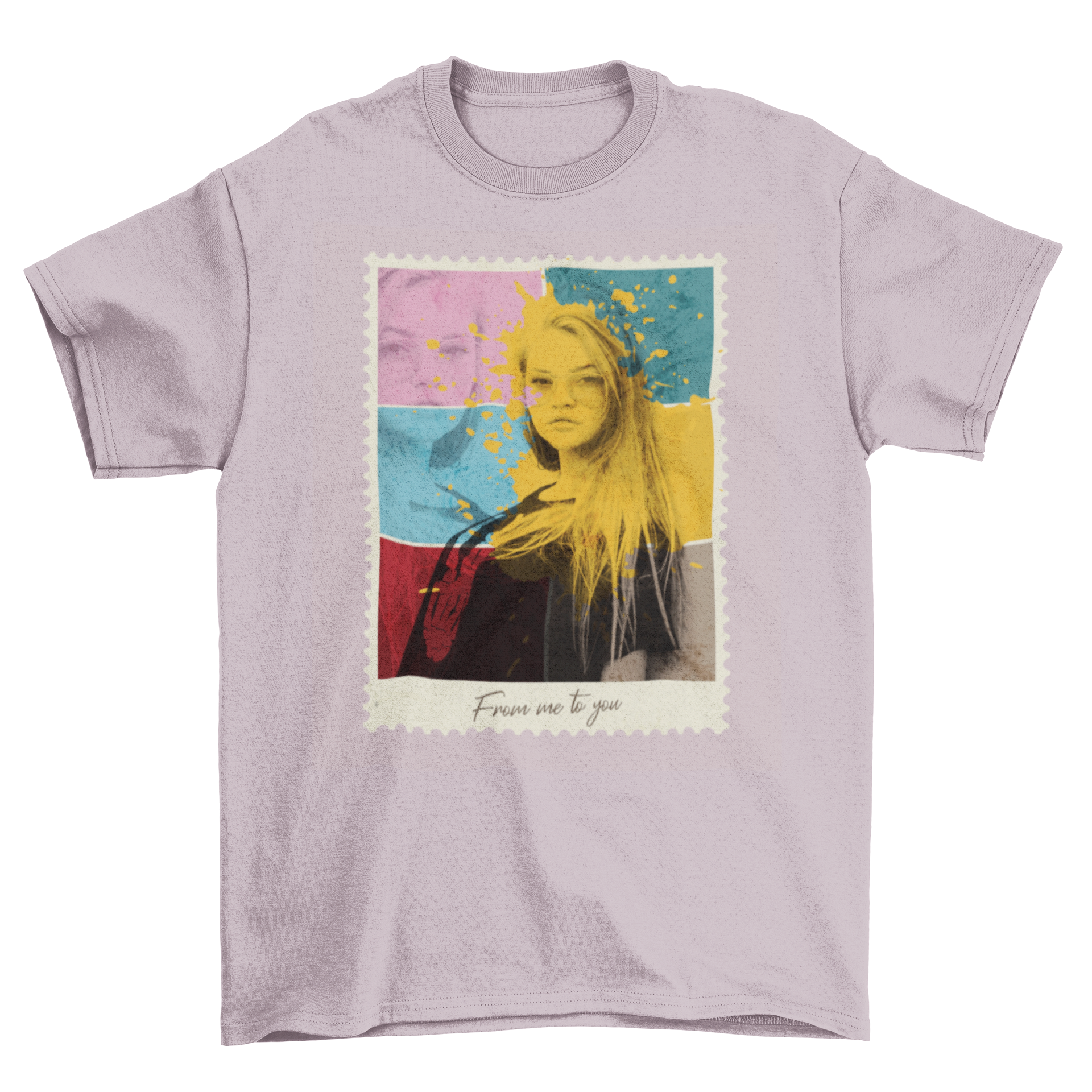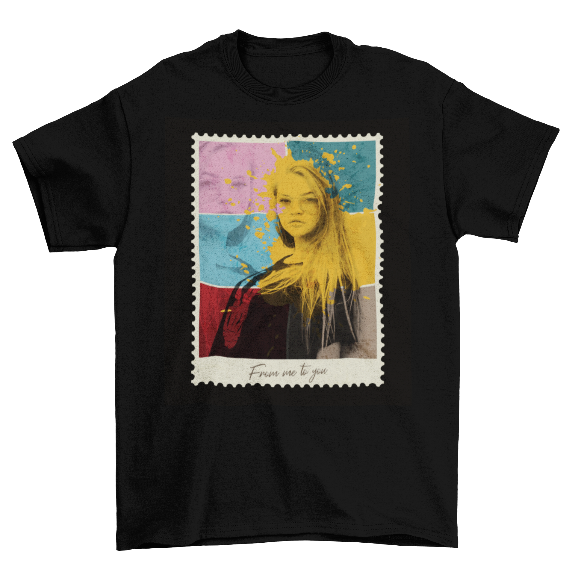 Colorful Girl Shade T-shirt featuring a vibrant postal stamp photo design, showcasing artistic collage elements.