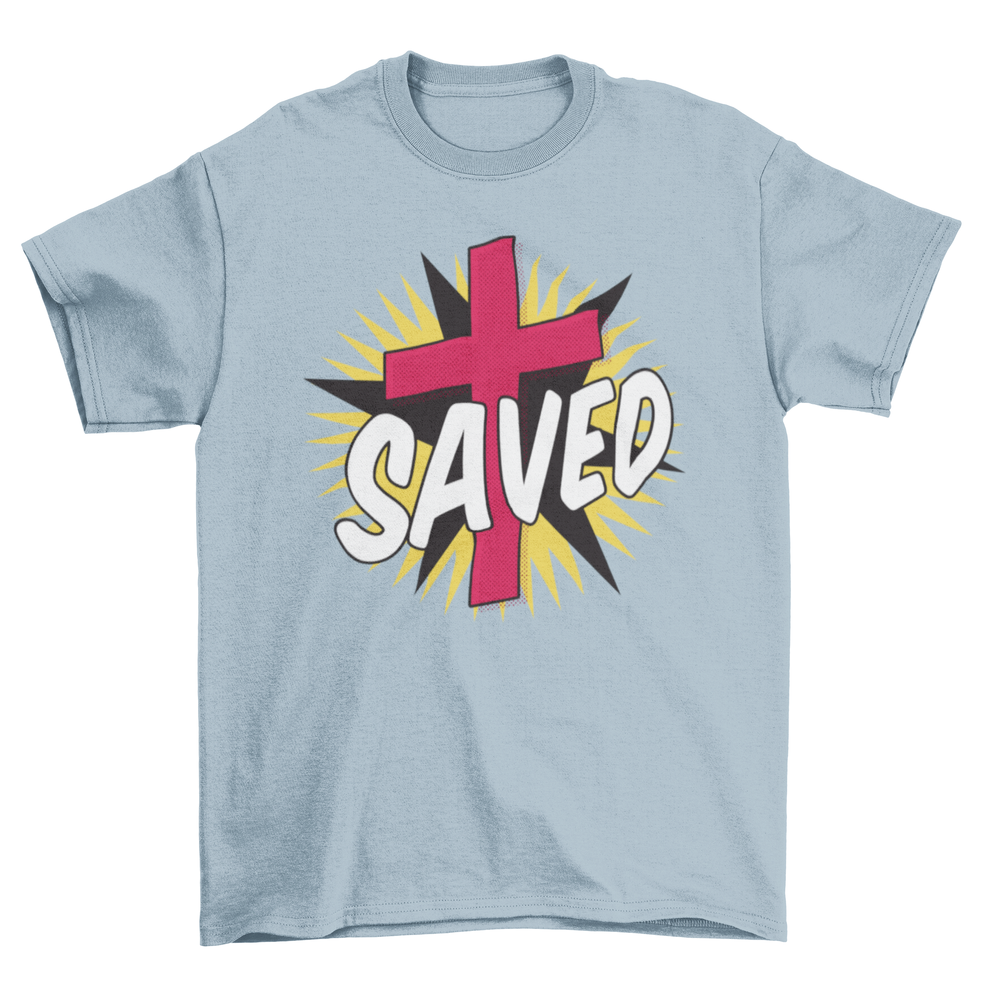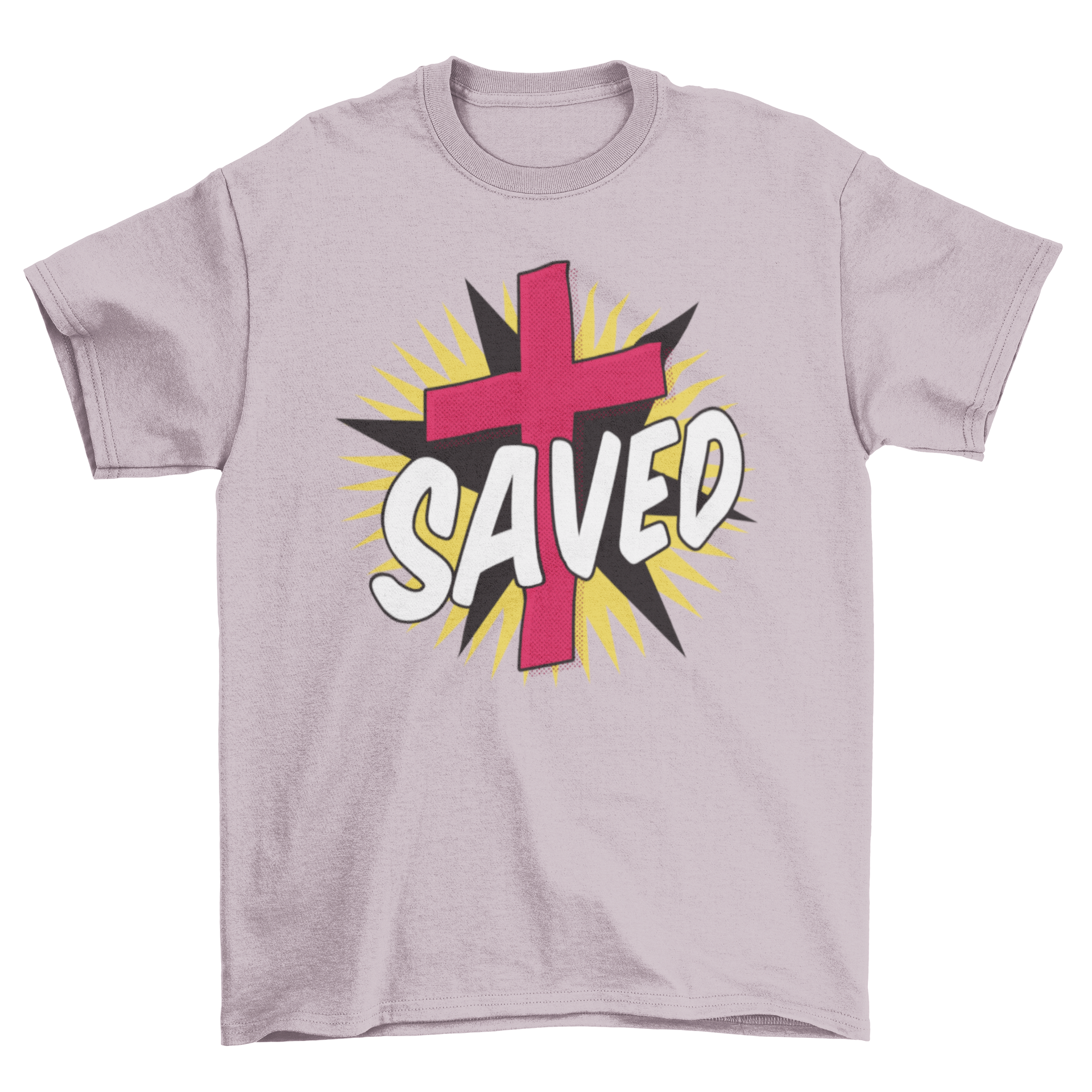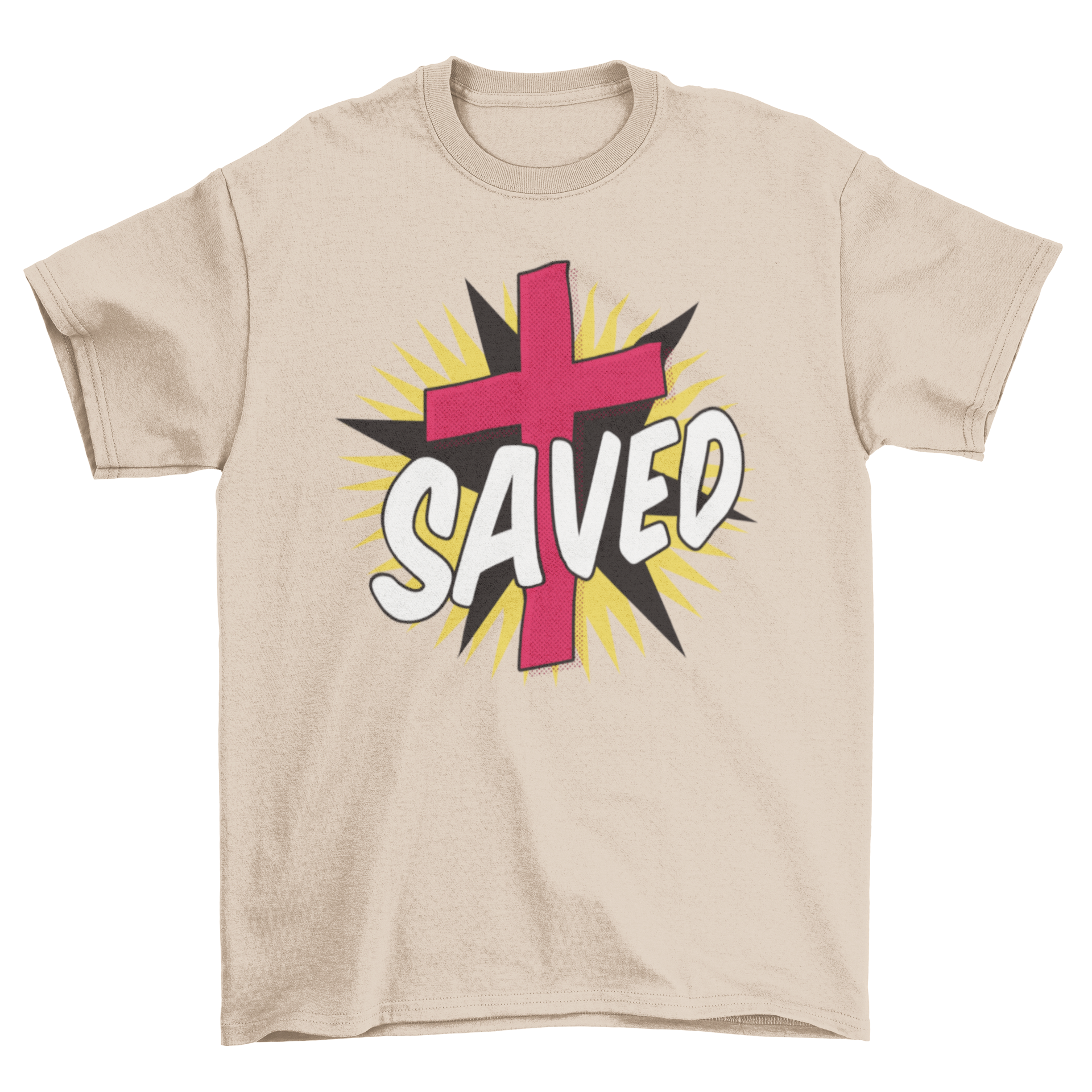 Introducing our Comic Cross T-Shirt, a stylish and meaningful addition to your wardrobe. This t-shirt features a unique comic-style design that showcases a cross along with the empowering word 'Saved'. Perfect for those who want to express their faith and individuality through fashion, this t-shirt is not just a piece of clothing; it's a statement.