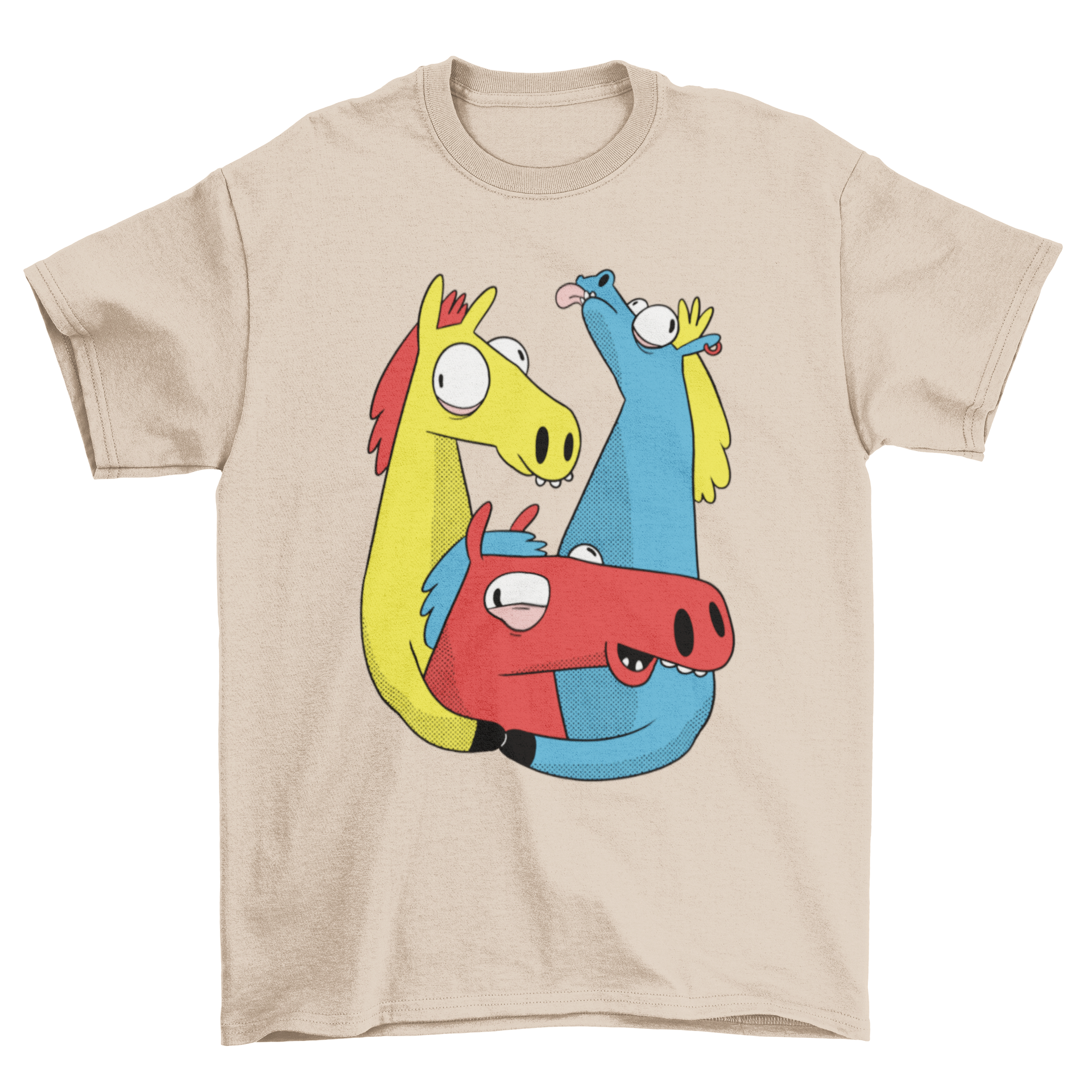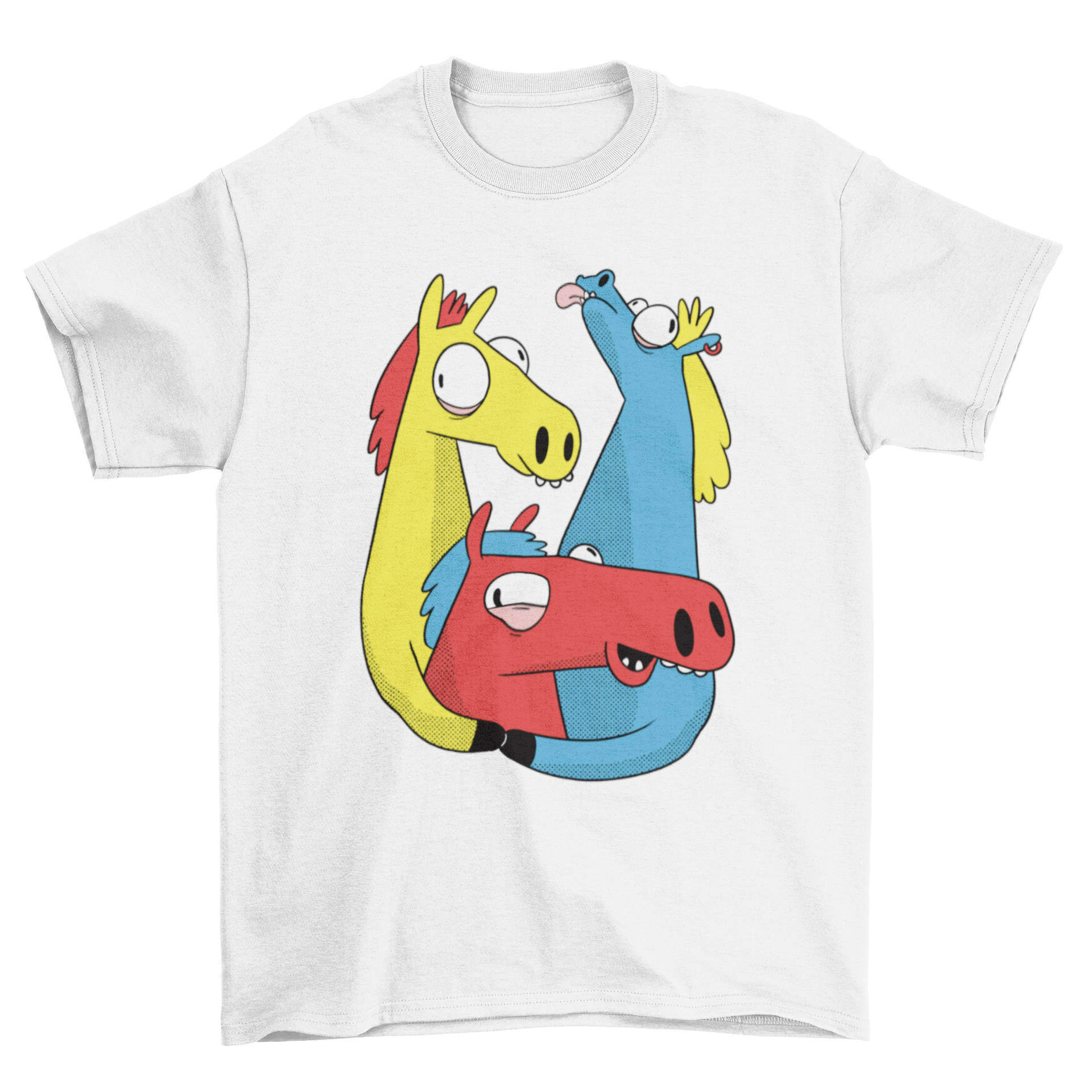 Introducing the Crazy Horse Pack T-shirt, a vibrant and eye-catching piece of apparel that is sure to turn heads. This T-shirt features a delightful design showcasing a pack of three crazy colorful horse cartoons, making it a perfect choice for anyone who loves horses or simply wants to add a splash of color to their wardrobe.