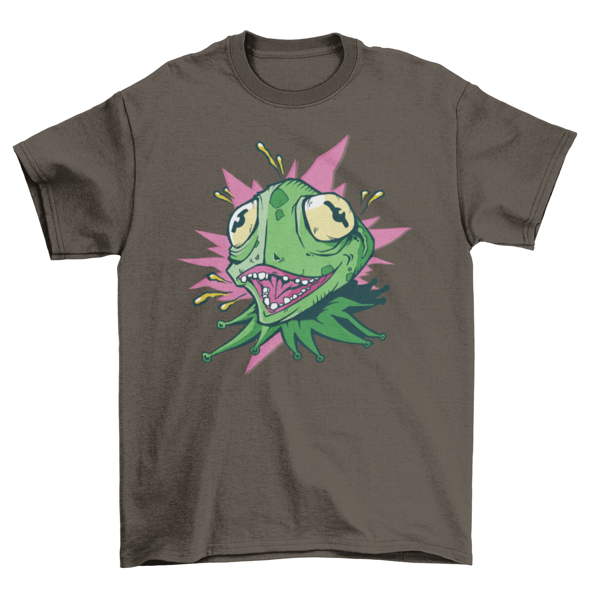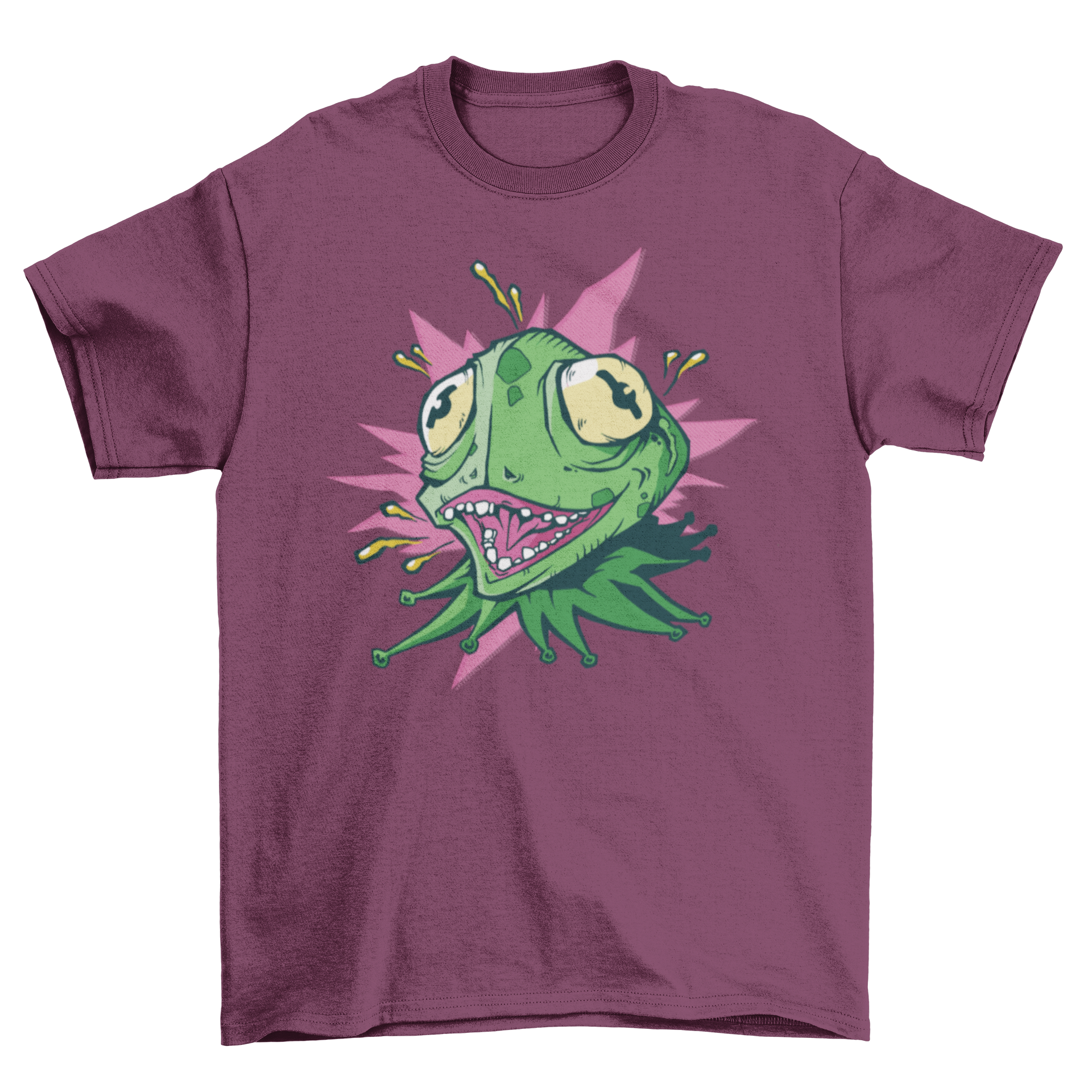 A vibrant Crazy Lizard T-shirt featuring a green lizard with bulging eyes and an open mouth, showcasing its quirky design.
