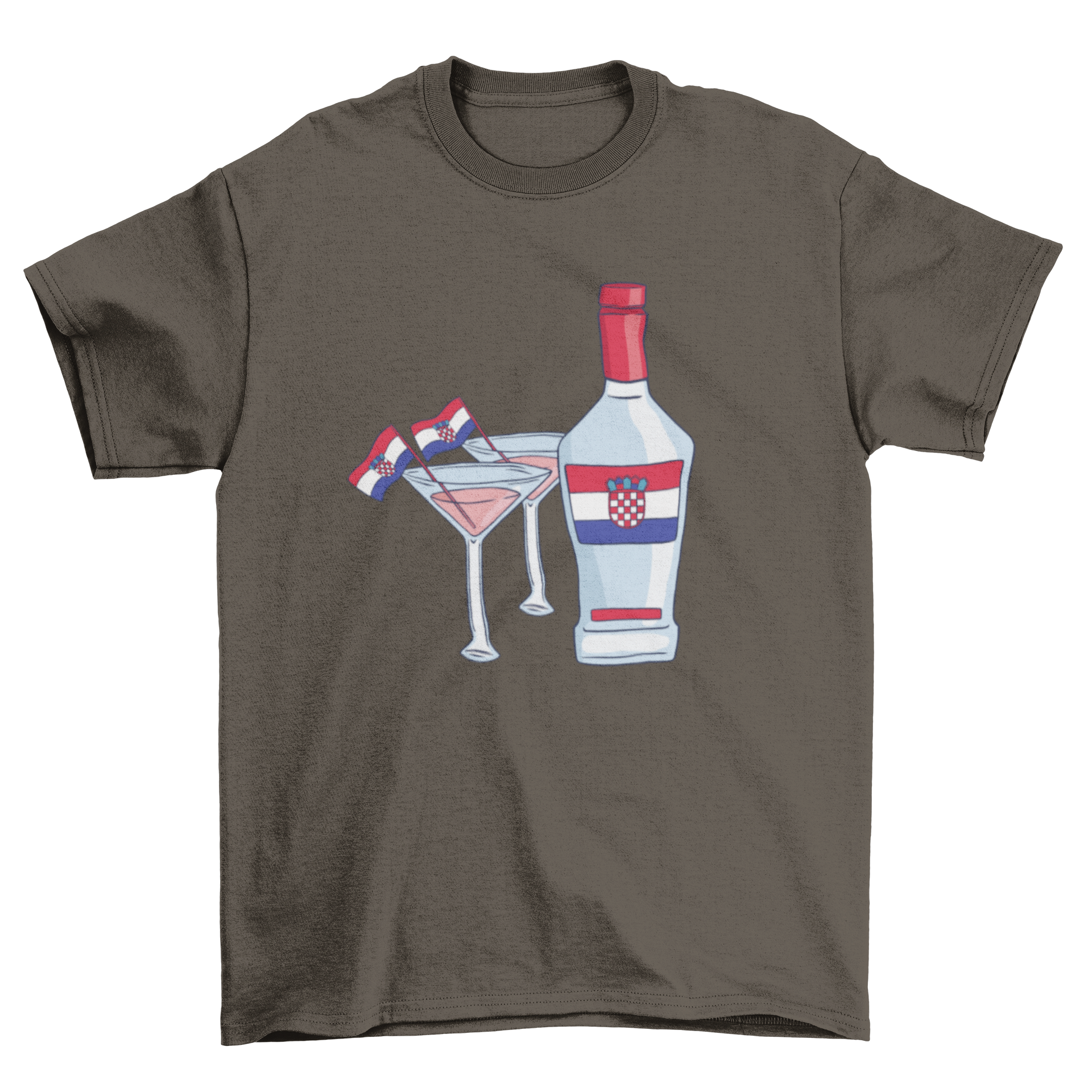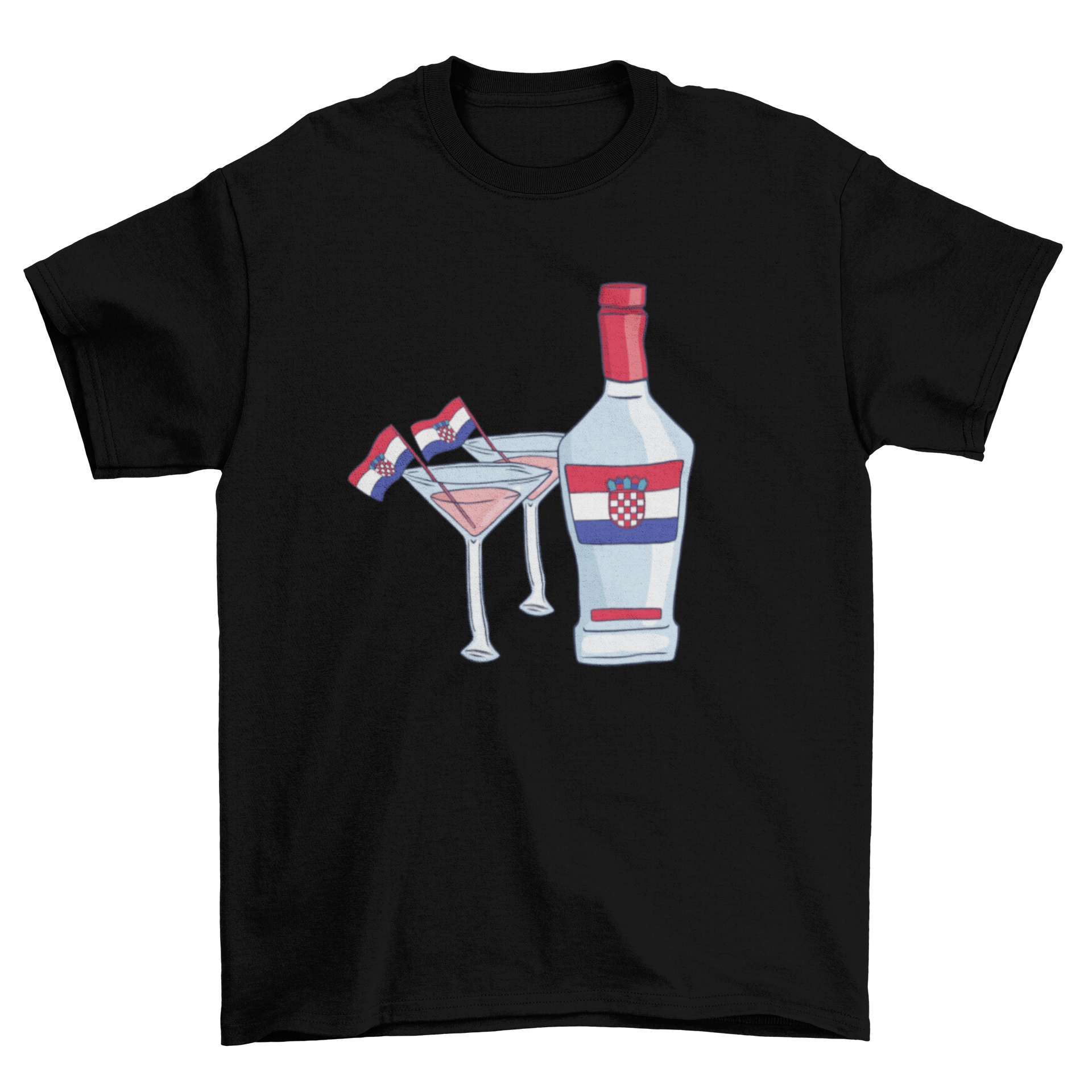 The design showcases the iconic Croatian flag, which consists of red, white, and blue stripes, along with the coat of arms. The bottle and glasses are artistically placed to create a visually appealing look that captures the essence of Croatian hospitality and celebration. This t-shirt is not just a piece of clothing; it’s a statement of your love for Croatia.