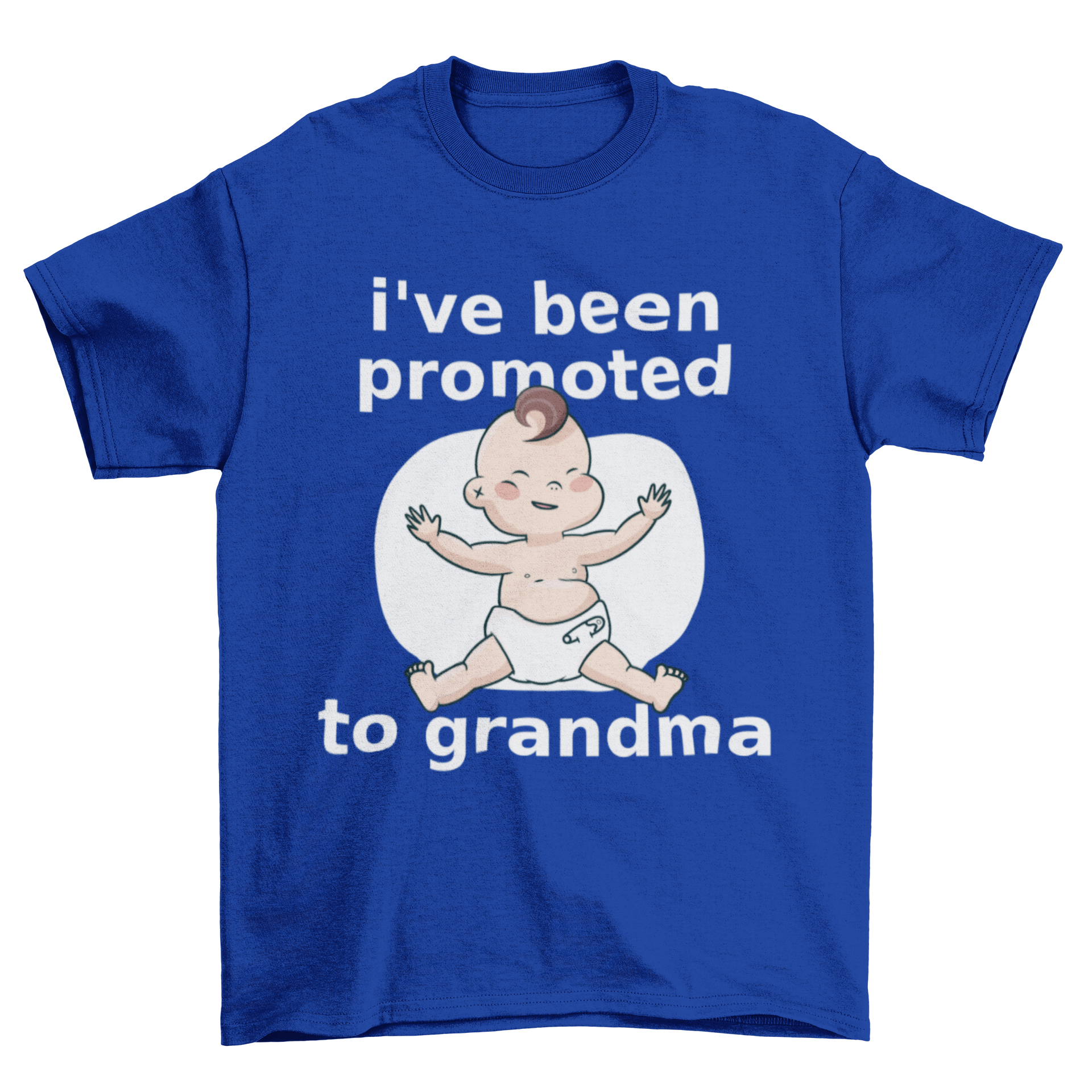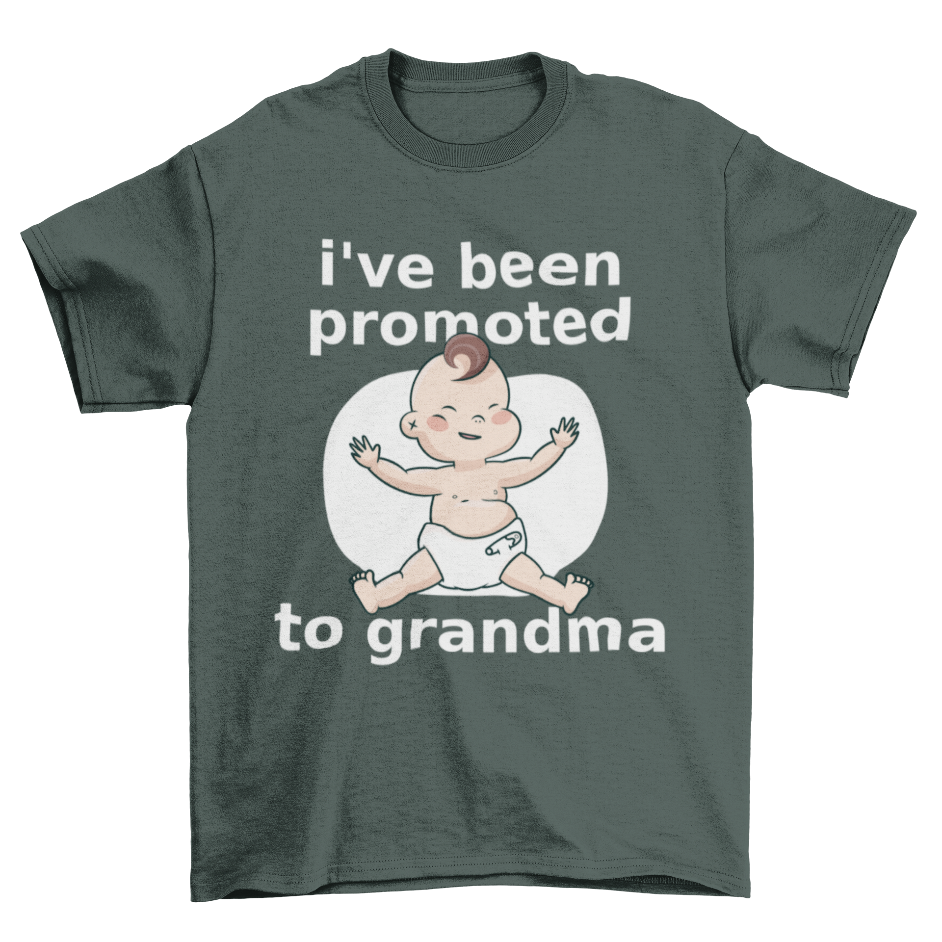 Introducing our delightful t-shirt design that proudly announces, "I've been promoted to grandma." This charming piece features an adorable illustration of a baby, making it the perfect attire for any new grandmother who wants to showcase her exciting new role. Whether it's for a baby shower, birthday, or just because, this t-shirt is sure to bring a smile to any grandma's face.