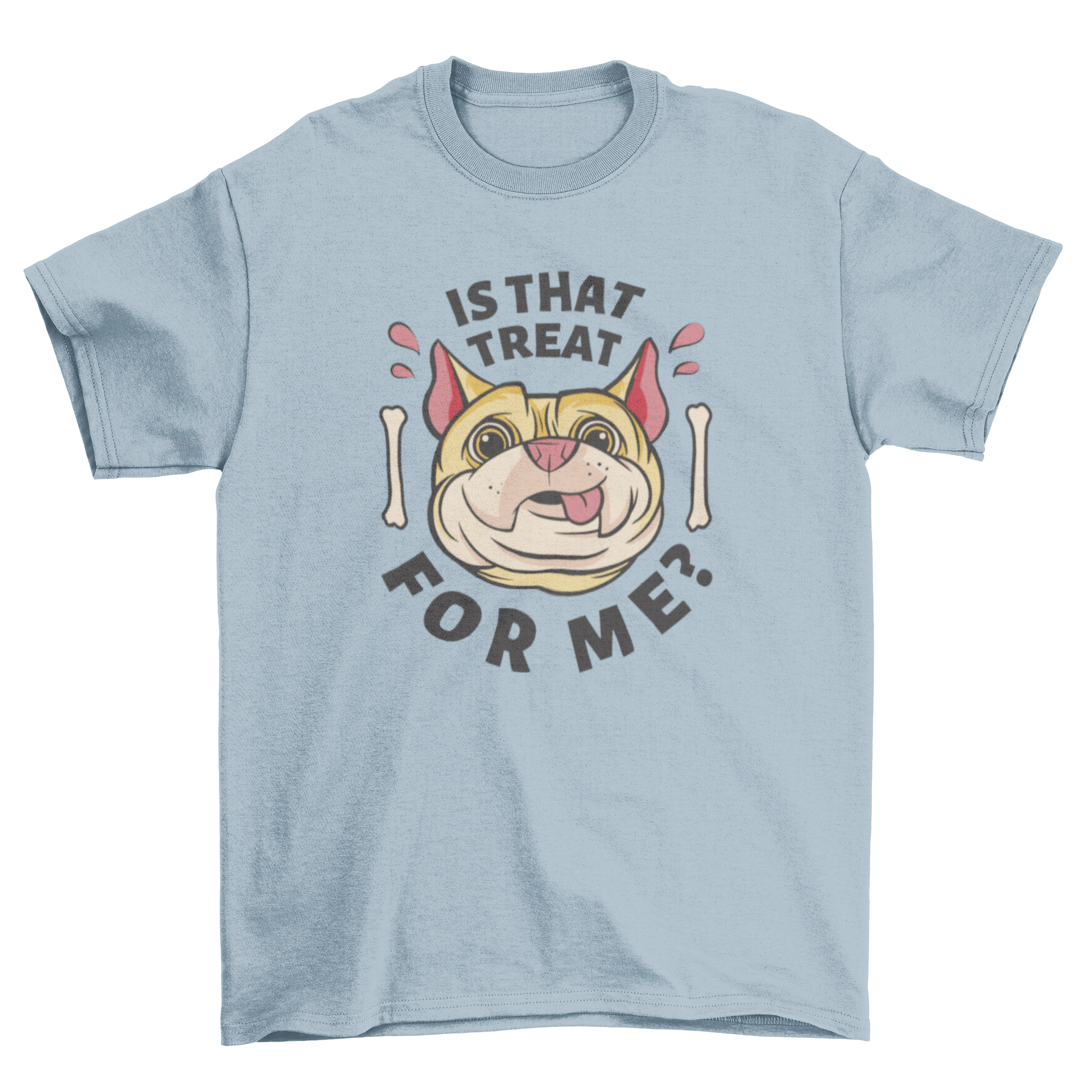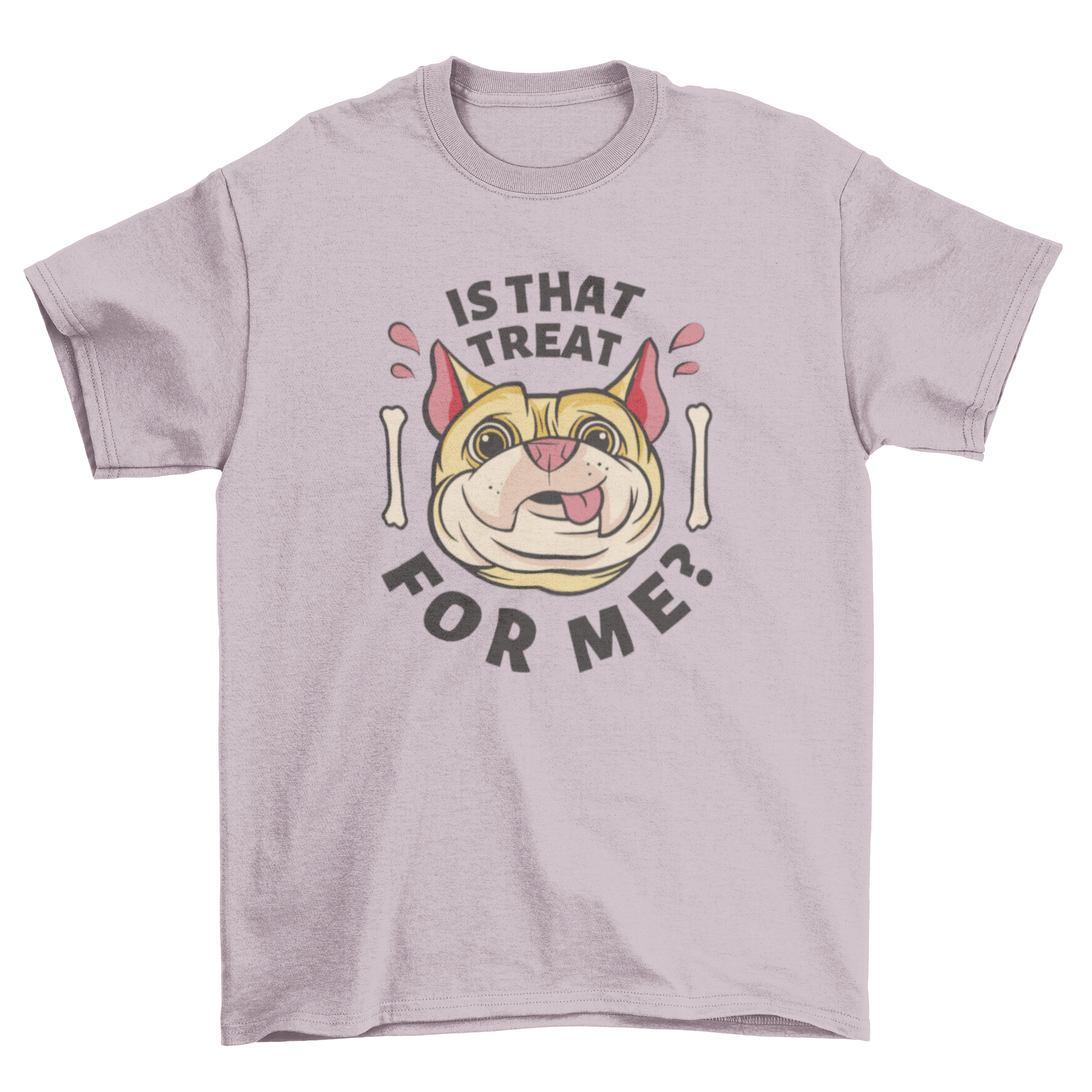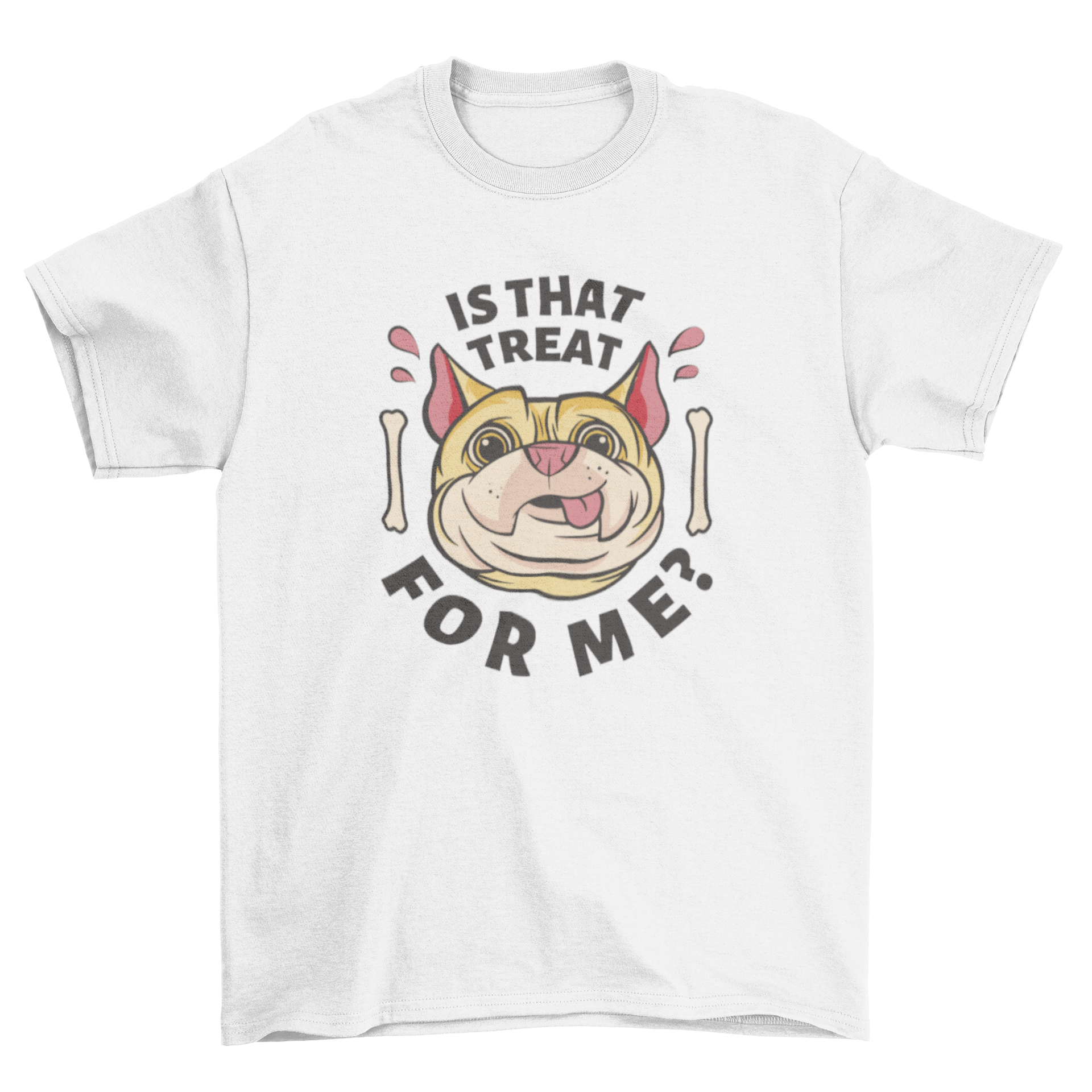 Introducing our adorable pug t-shirt, a must-have for all dog lovers, especially those who can't resist the charm of pugs. This unique design features the face of a cute pug dog, perfectly capturing its playful and loving nature. Accompanying the pug's delightful expression is the humorous quote, "Is that treat for me?" which adds a touch of personality and fun to the shirt.