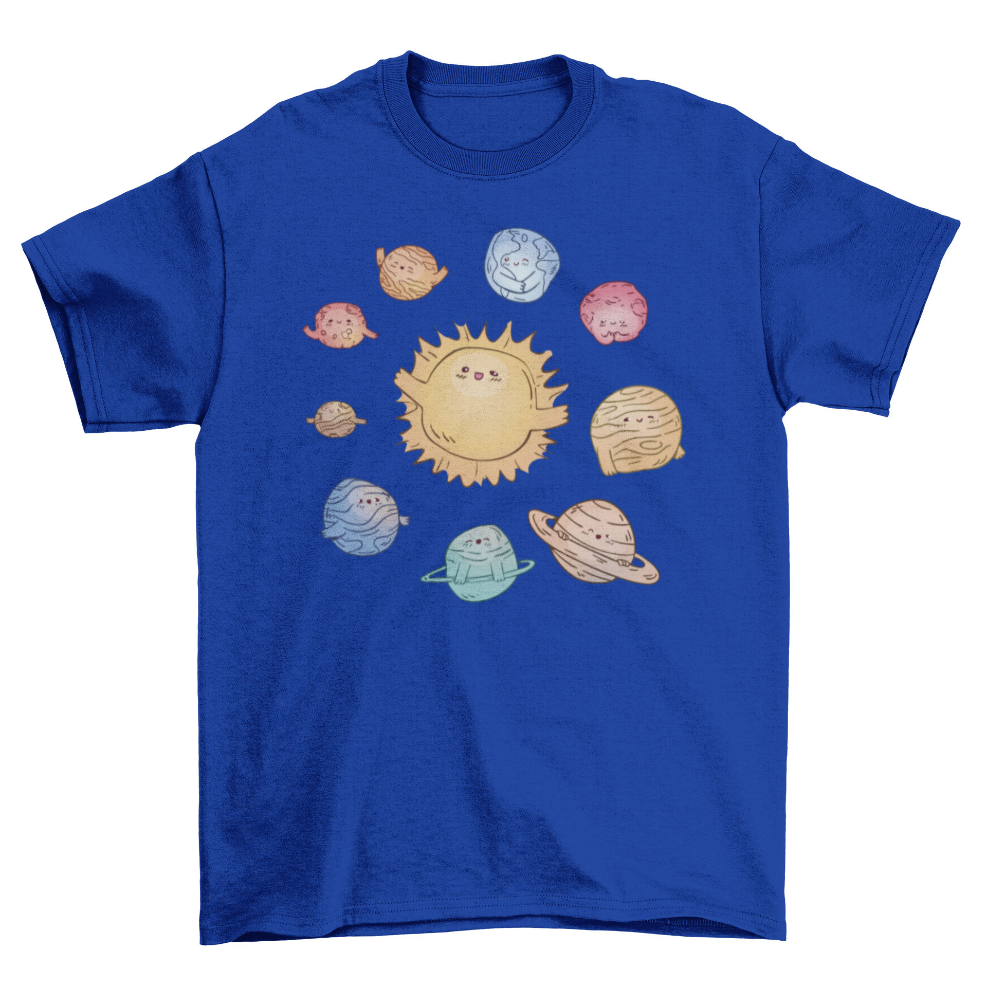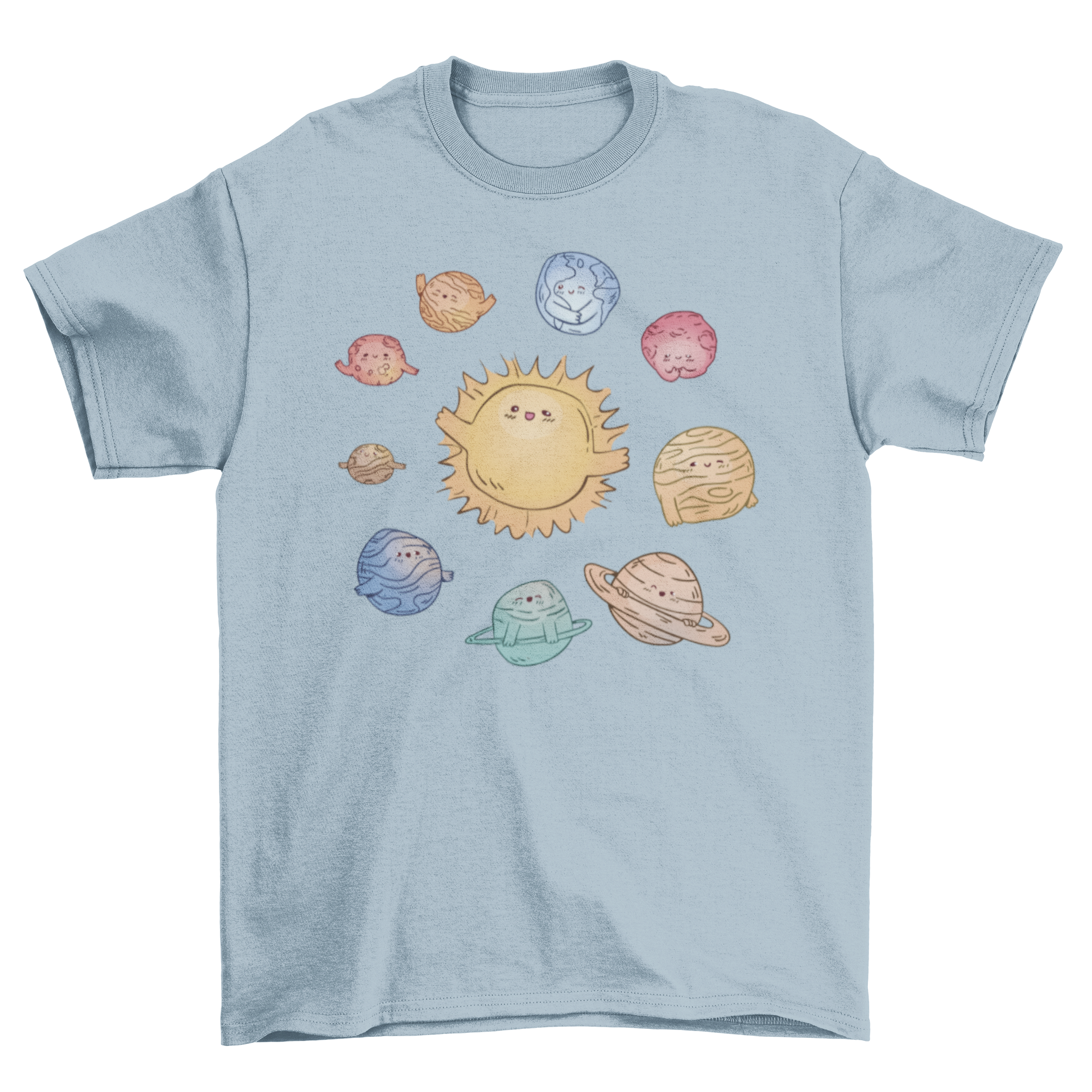 Introducing our Cute Solar System with Planets T-Shirt, a delightful addition to any space enthusiast's wardrobe. This charming t-shirt showcases a whimsical design featuring the sun and all the planets in our solar system, rendered in an adorable style that is sure to capture attention. Whether you're a child or an adult, this t-shirt is perfect for anyone who loves astronomy and wants to express their passion for the cosmos.