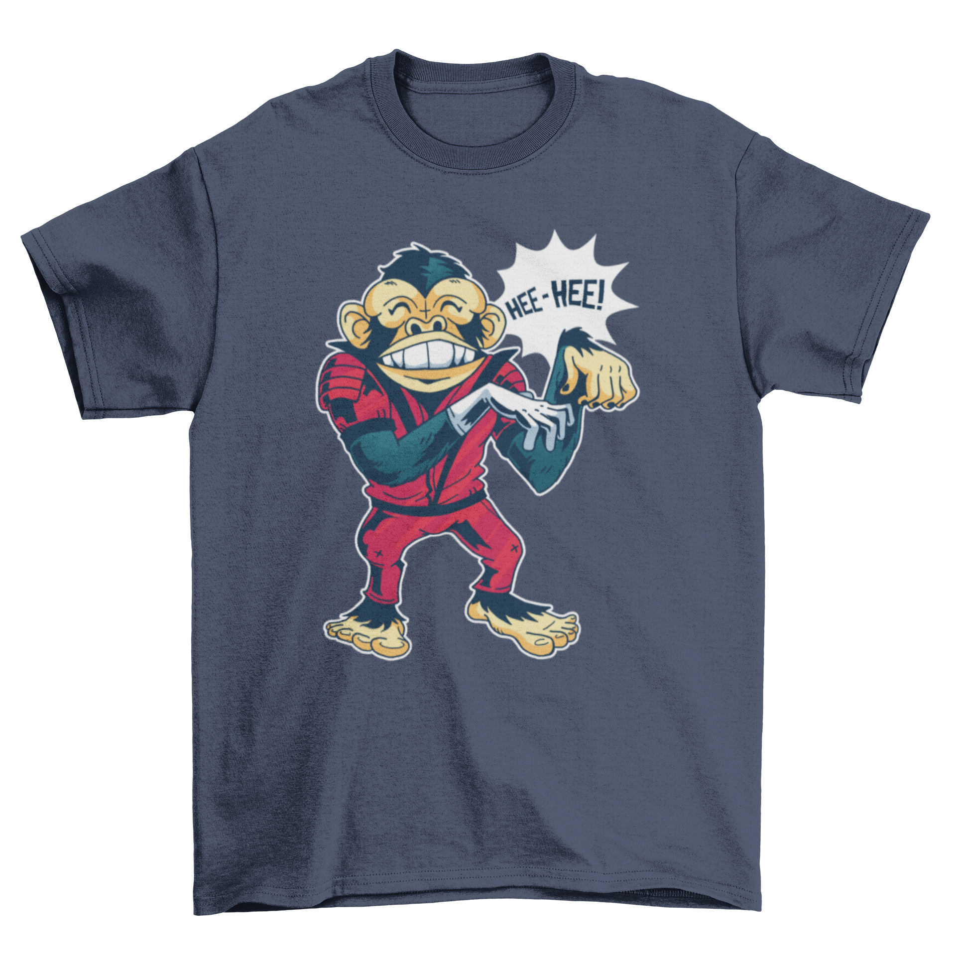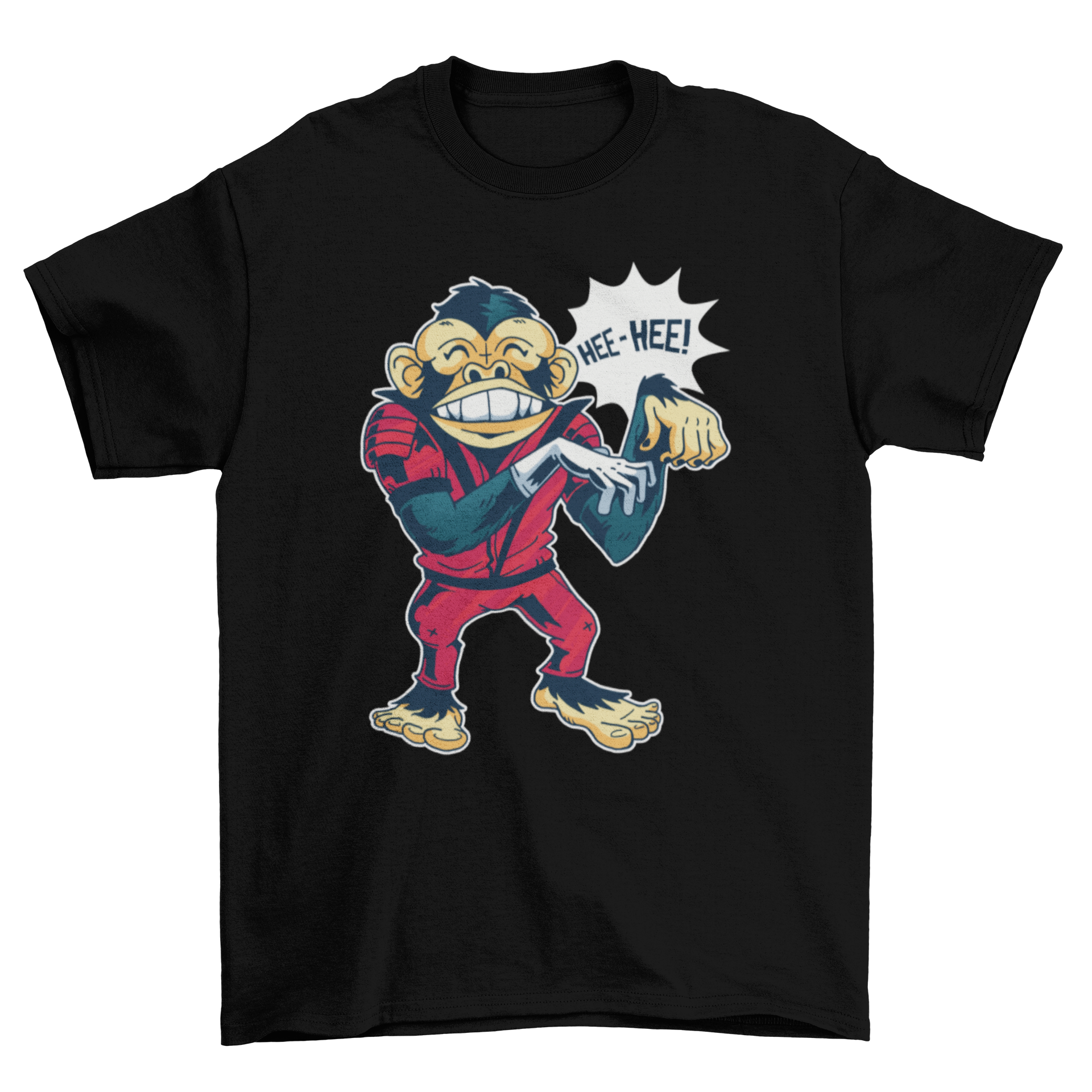 Dancing monkey t-shirt featuring a monkey in a Michael Jackson outfit with a speech bubble saying 'Hee-hee!'