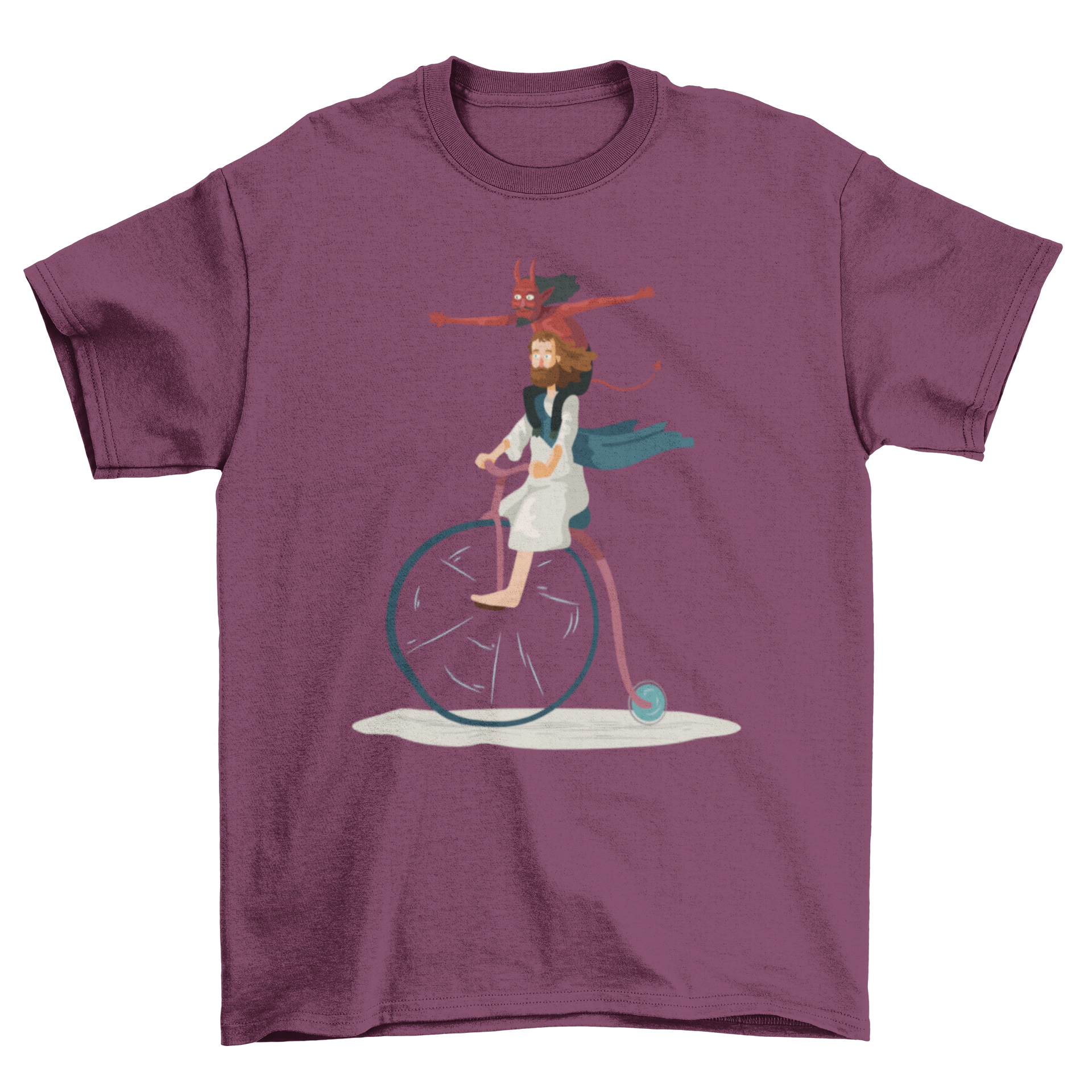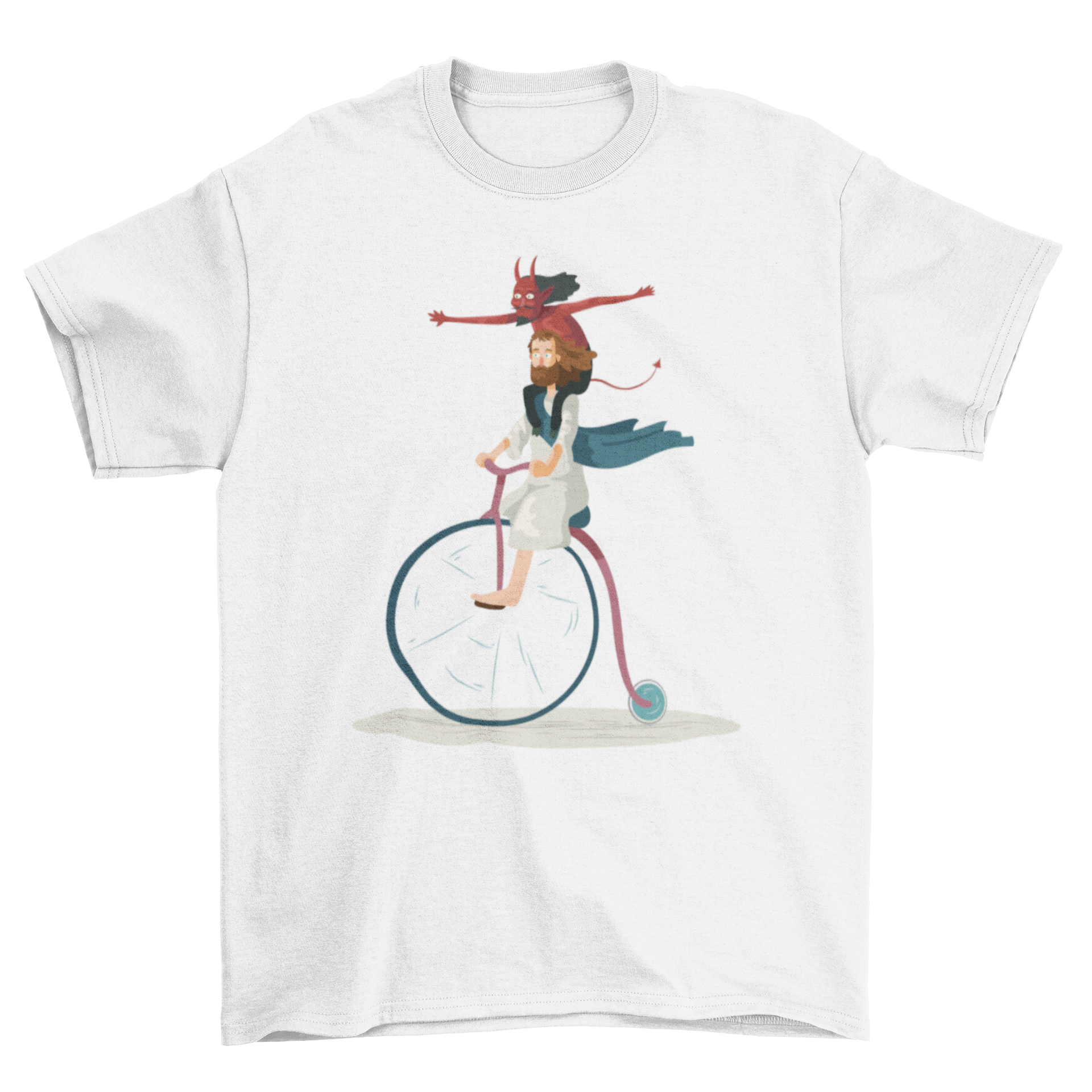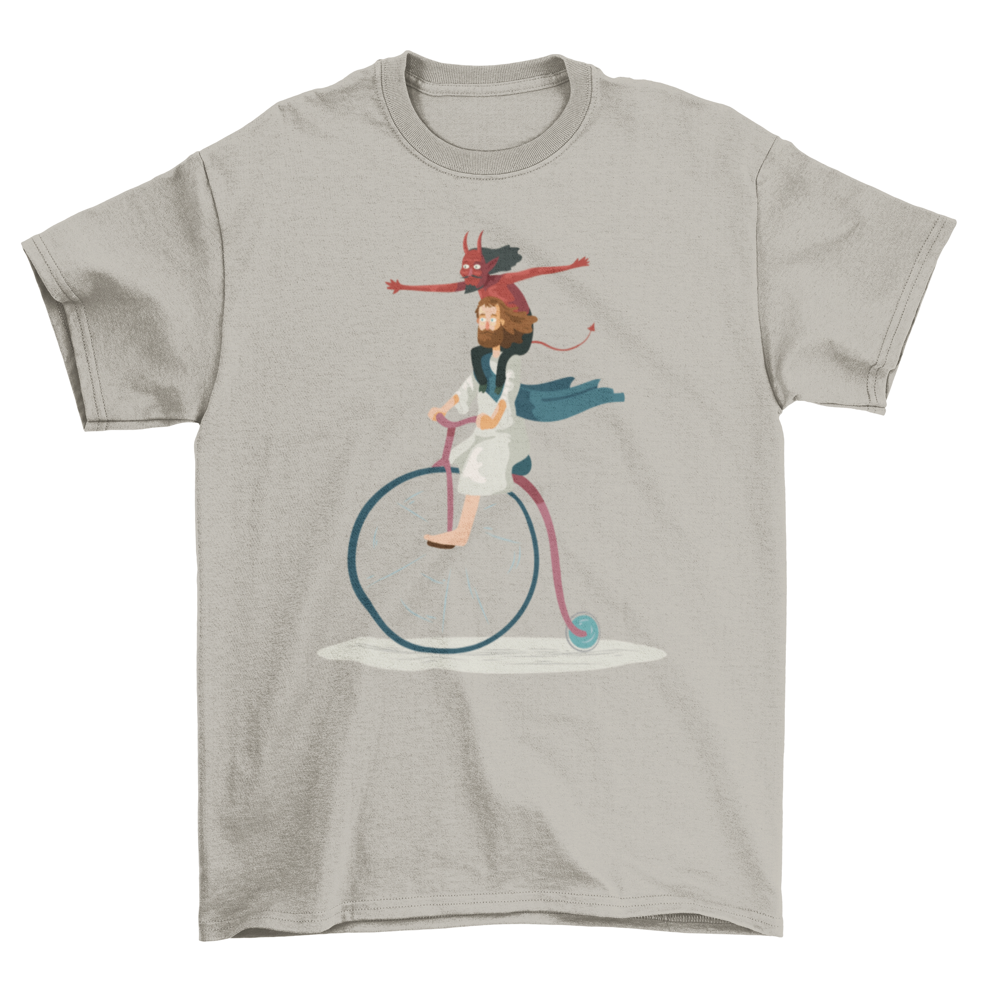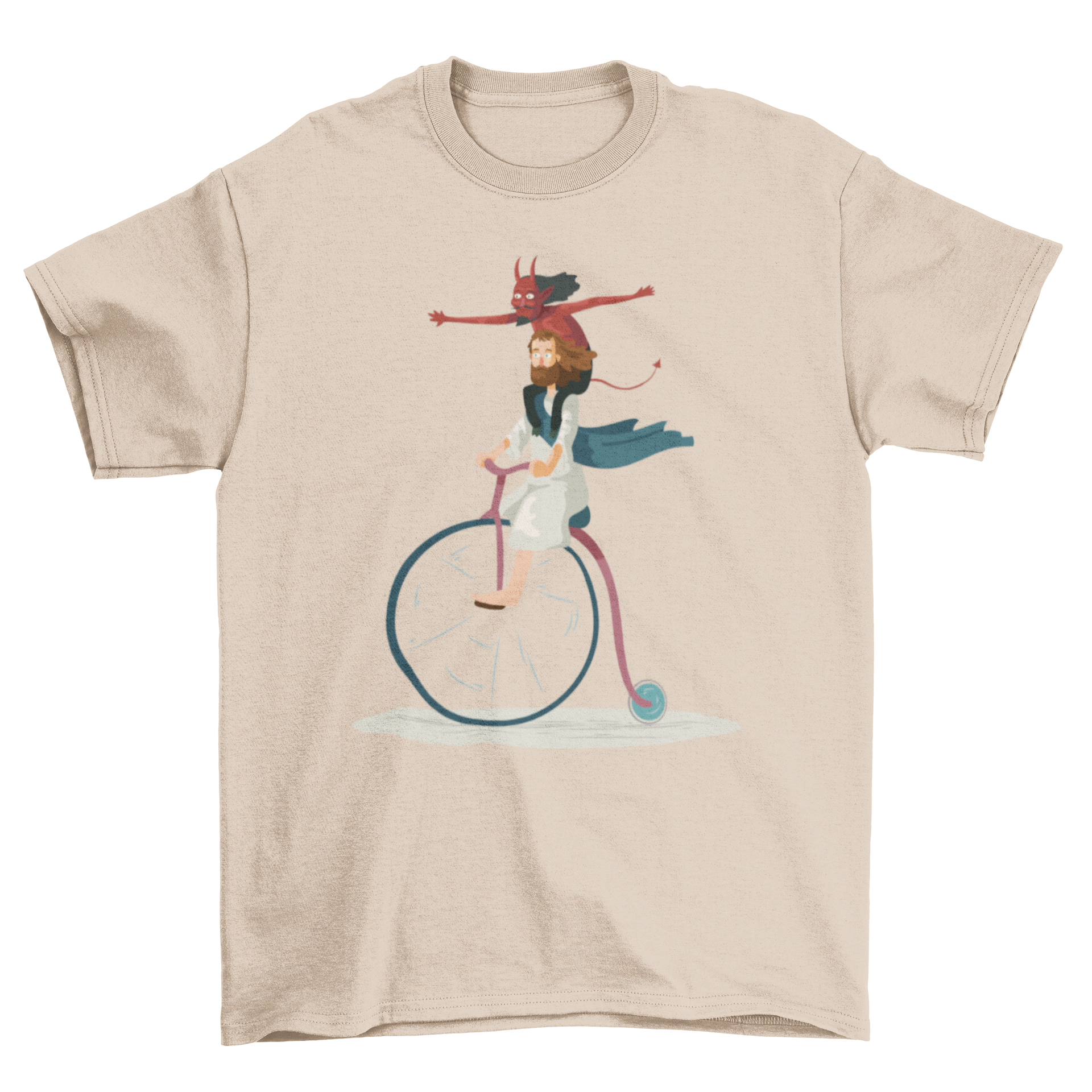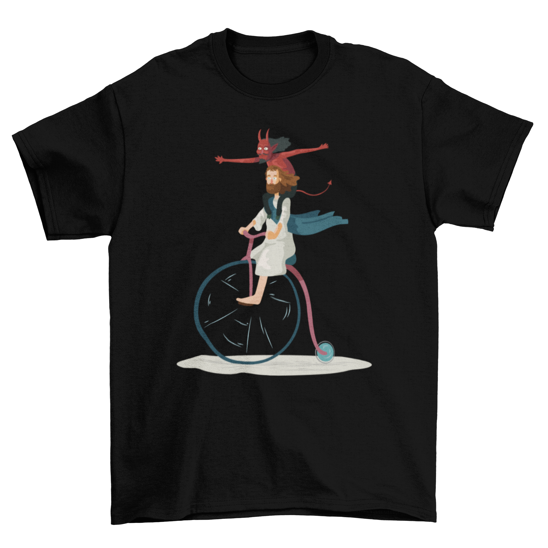The design showcases a vibrant and detailed illustration that captures the essence of friendship between two contrasting figures. The devil, often associated with mischief, and Jesus, a symbol of compassion and love, are depicted in a light-hearted manner, riding a bike together. This whimsical portrayal invites conversation and adds a touch of humor to your wardrobe.