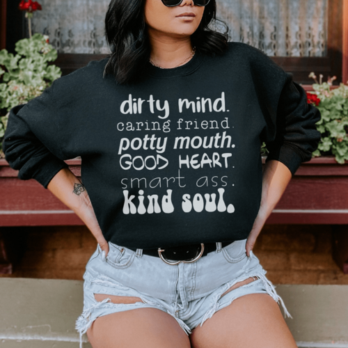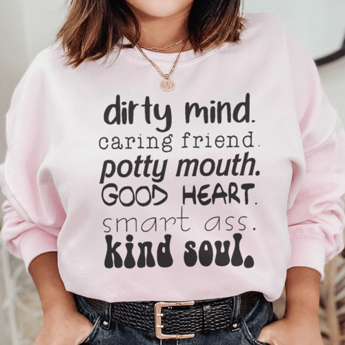 The Dirty Mind Caring Friend Potty Mouth Good Heart sweatshirt is incredibly versatile. Pair it with your favorite jeans for a casual look, or wear it over leggings for a cozy day at home. Its unique design makes it a statement piece that can be dressed up or down, depending on the occasion.