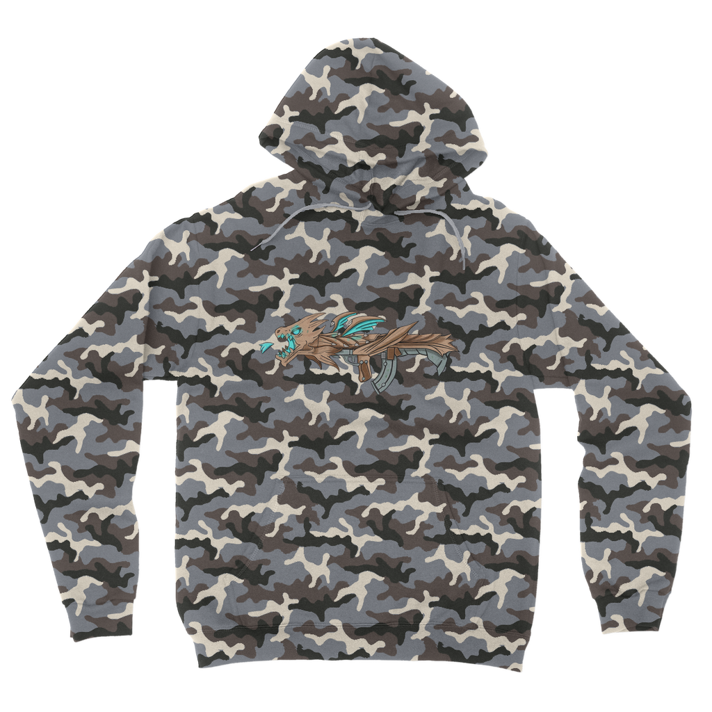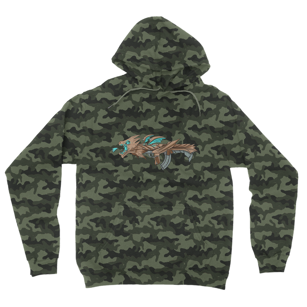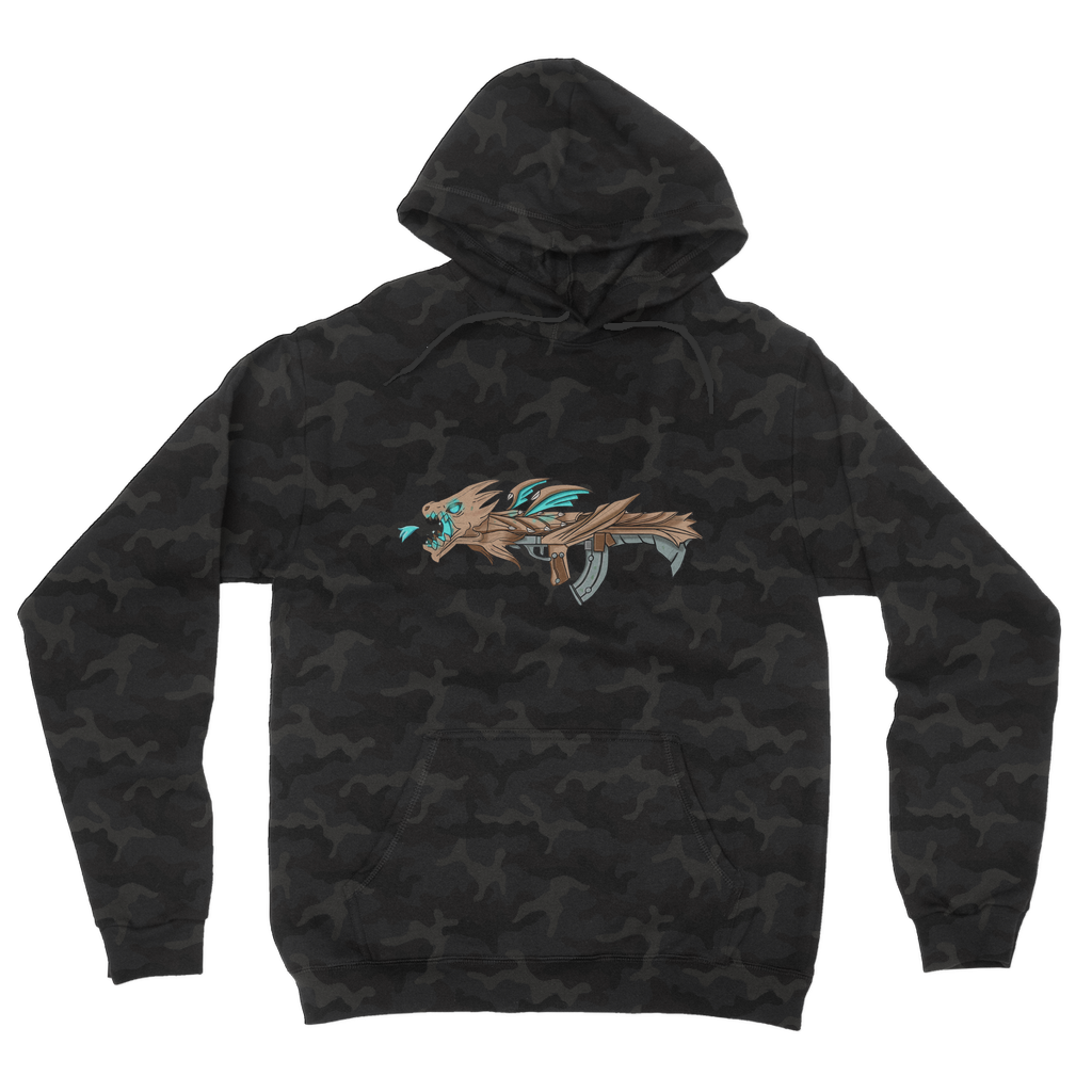 Dragon Gun Camouflage Adult Hoodie featuring a stylish all-over camo design with a double fabric hood and kangaroo pouch pocket.