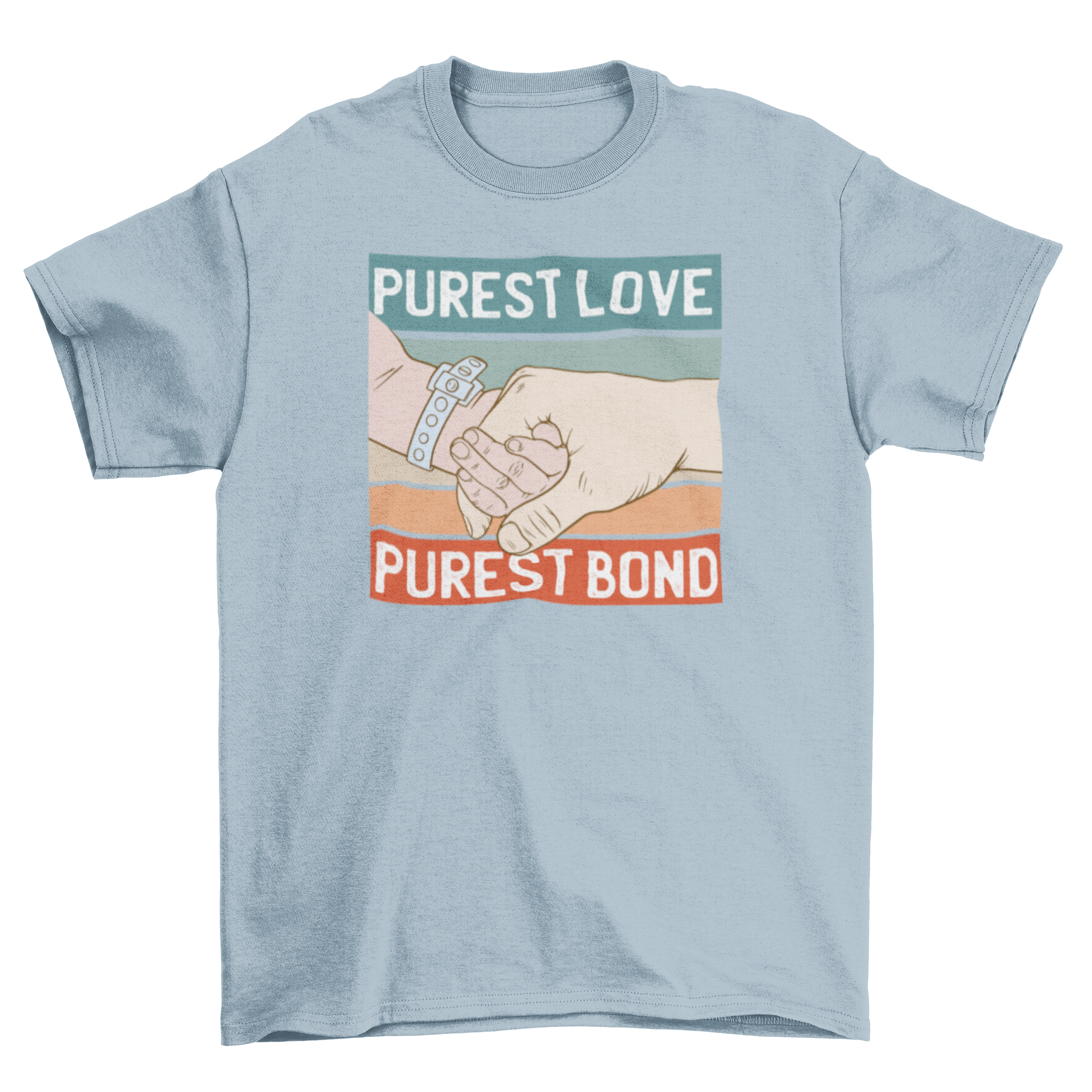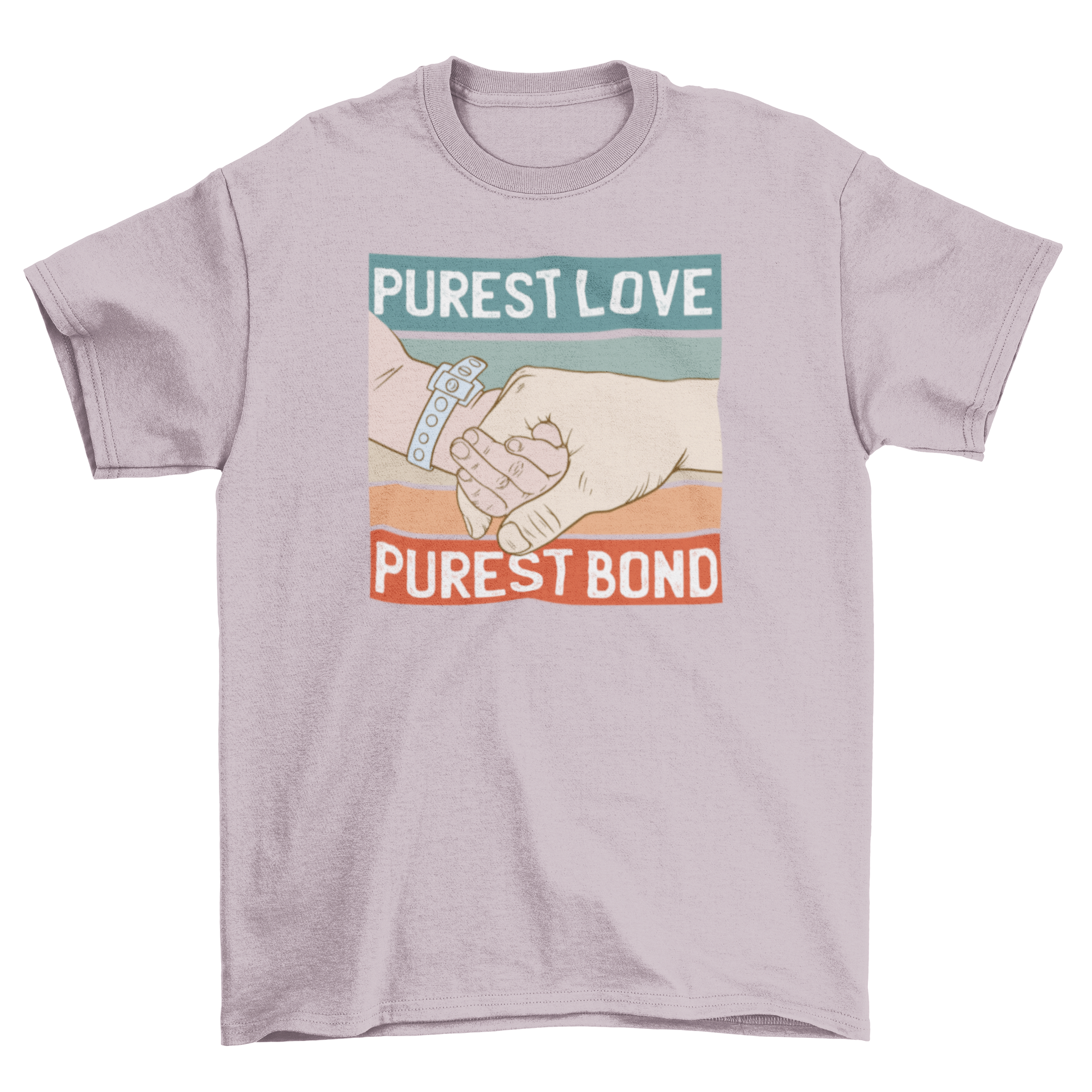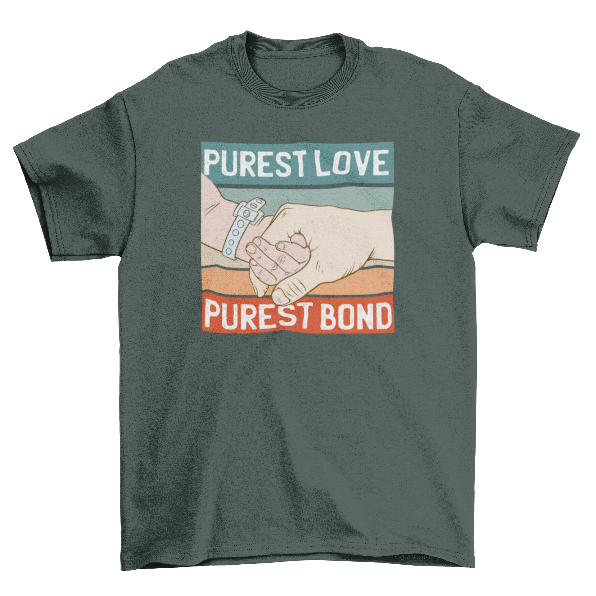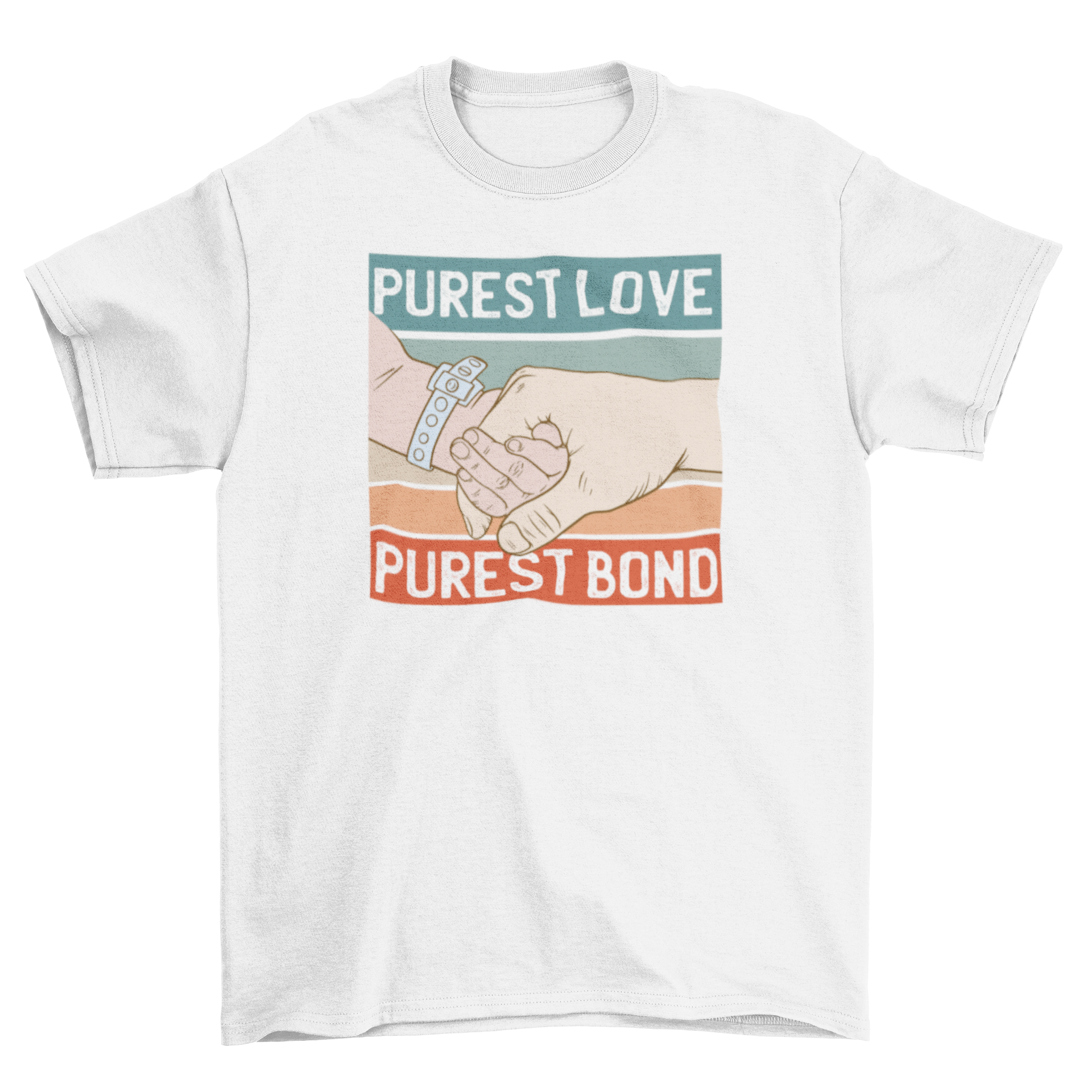 Introducing our Family Bond Baby Quote T-Shirt, a beautifully designed piece that captures the essence of love and connection between a parent and child. This t-shirt features an adorable graphic of a baby holding hands with their father or mother, accompanied by the touching quote, "Purest love, purest bond." This design is not only visually appealing but also resonates with the deep emotional ties that families share.