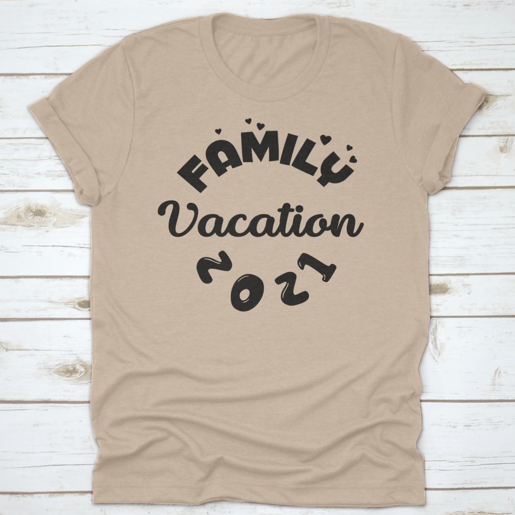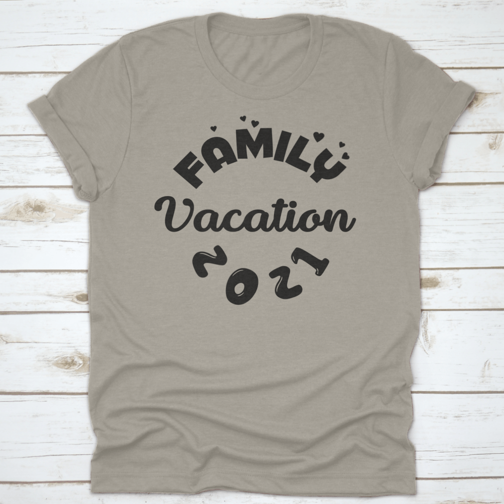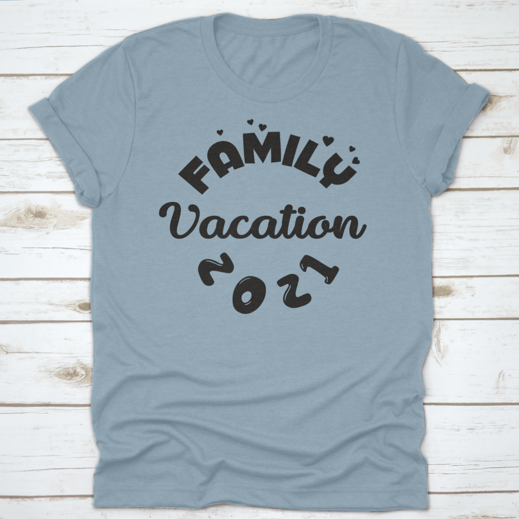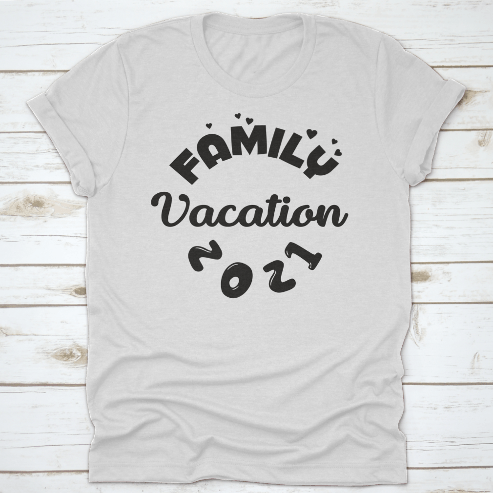 Family Vacation 2021 motivational quote fashion shirt displayed on a neutral background, showcasing its soft cotton fabric and classic fit.