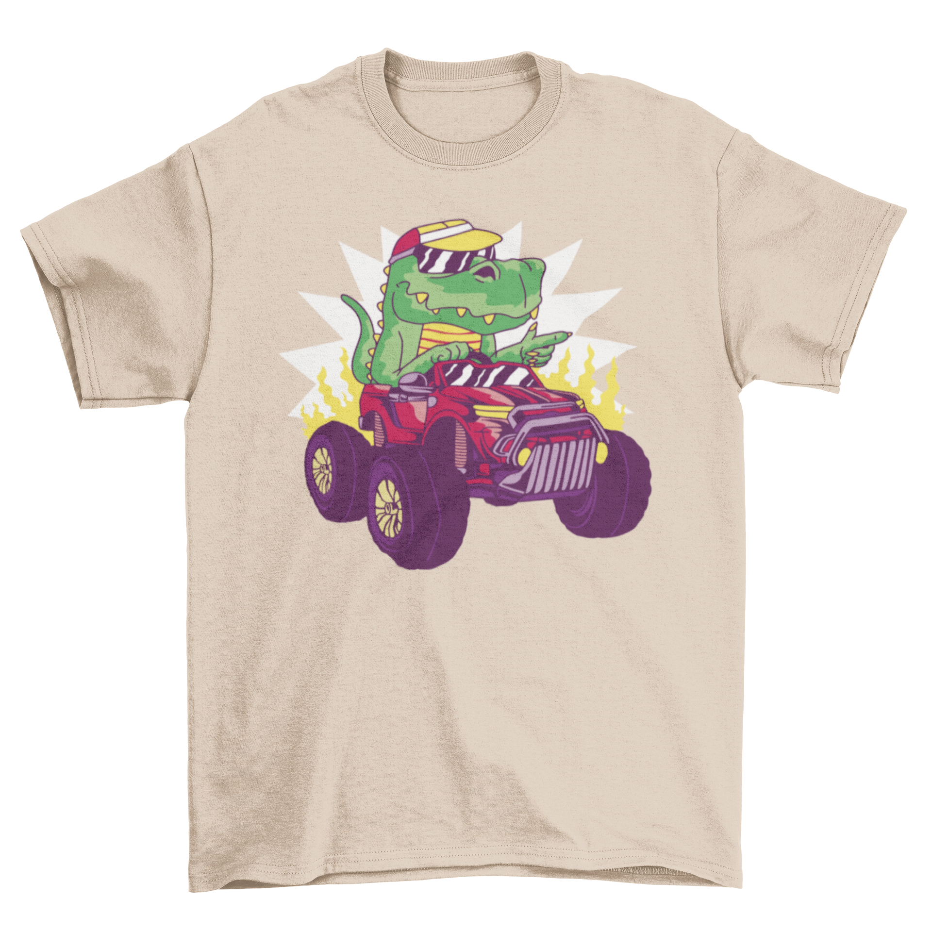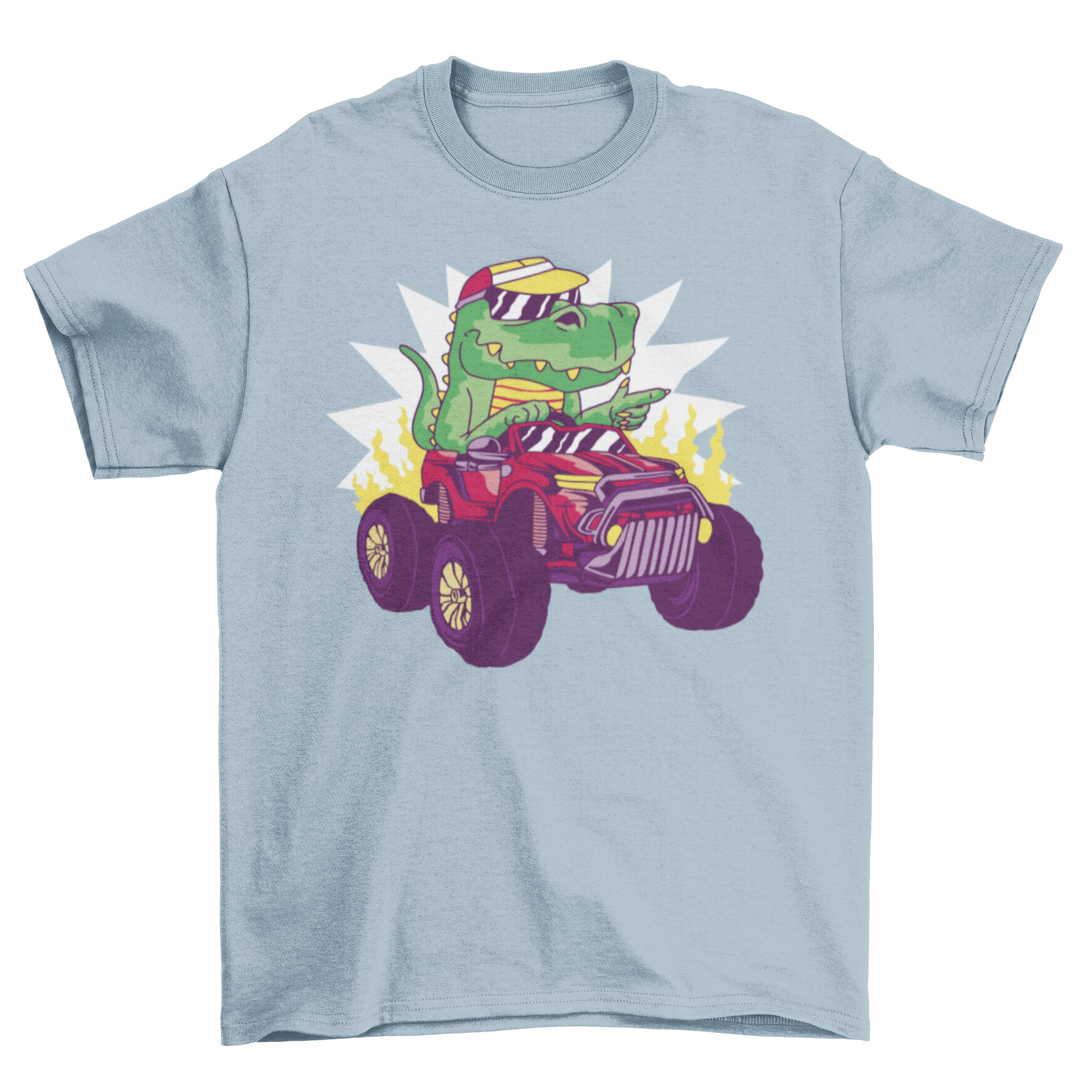 The vibrant colors and dynamic design of the T-rex driving a monster truck make this t-shirt a standout piece in any wardrobe. The playful imagery captures the imagination and is sure to delight anyone who sees it. It's not just a t-shirt; it's a statement piece that showcases your adventurous spirit and love for unique designs.