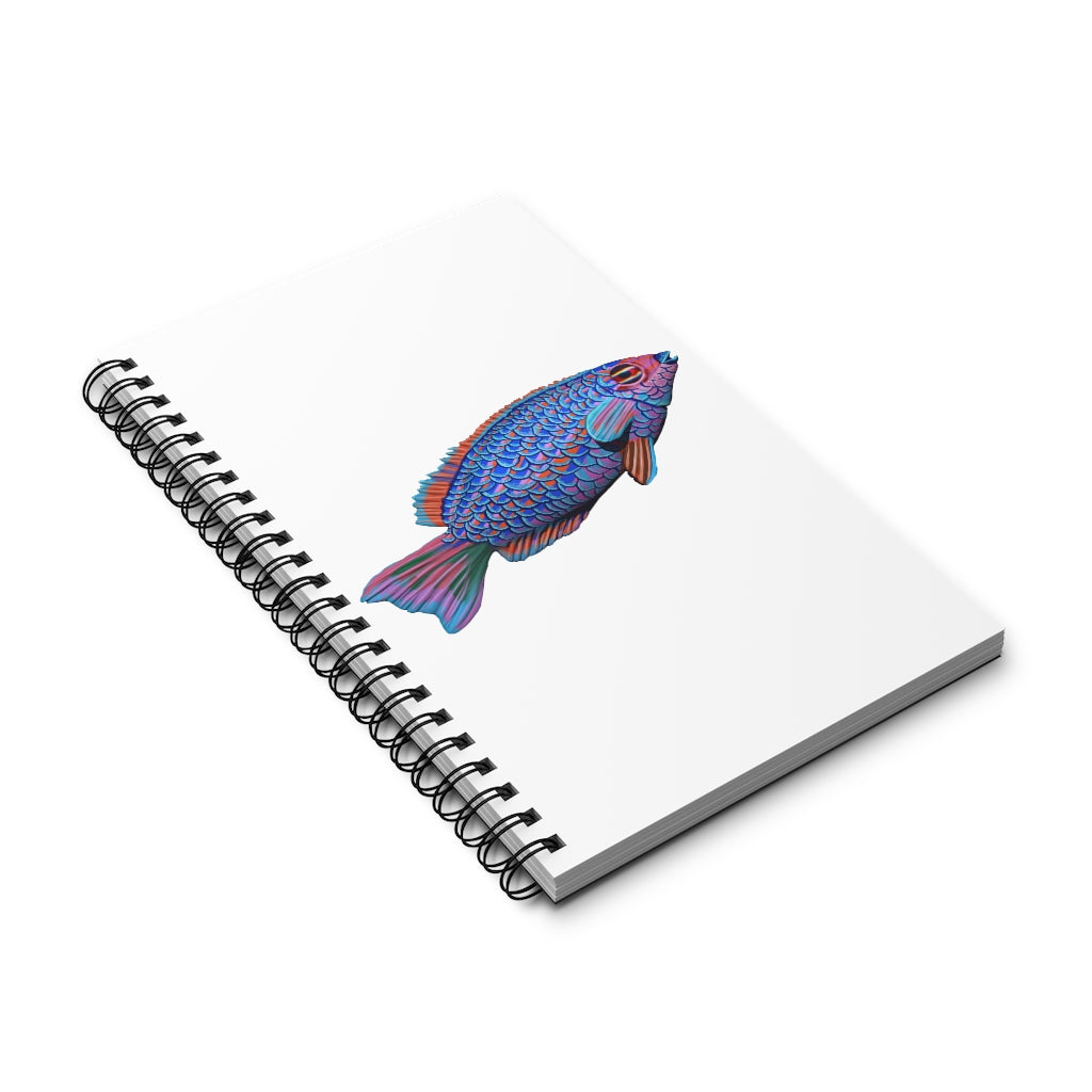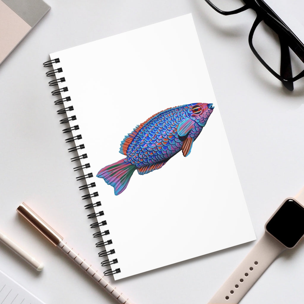 Fish Spiral Journal featuring a colorful front cover, available in various styles including blank, dot grid, lined, and task manager formats.