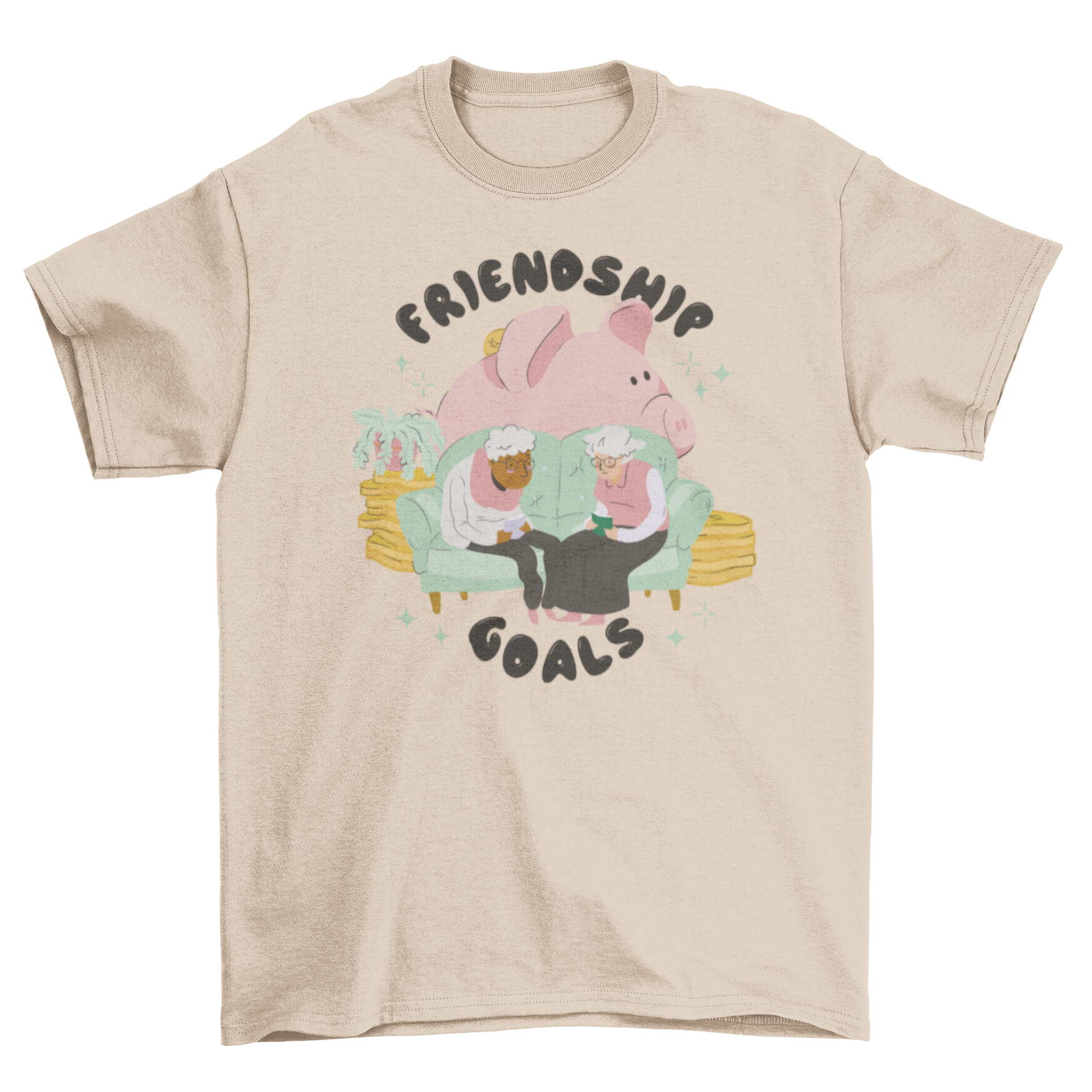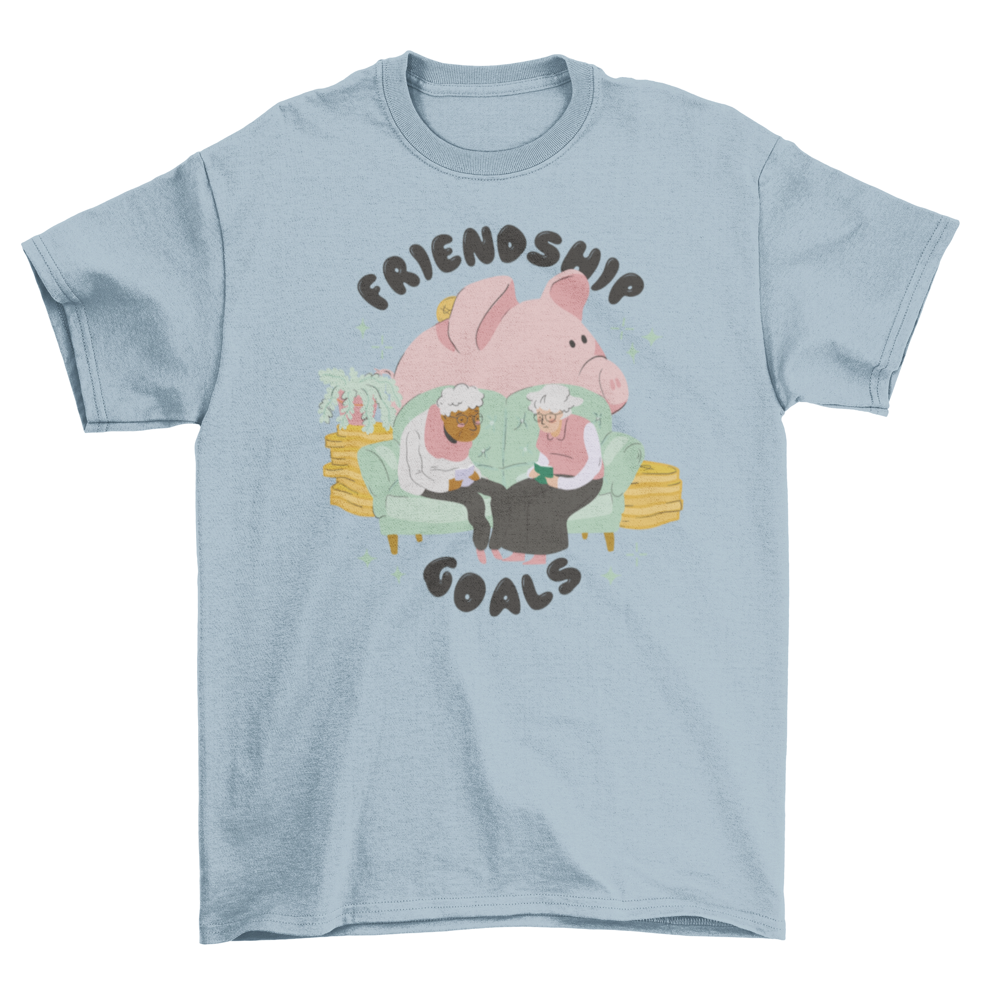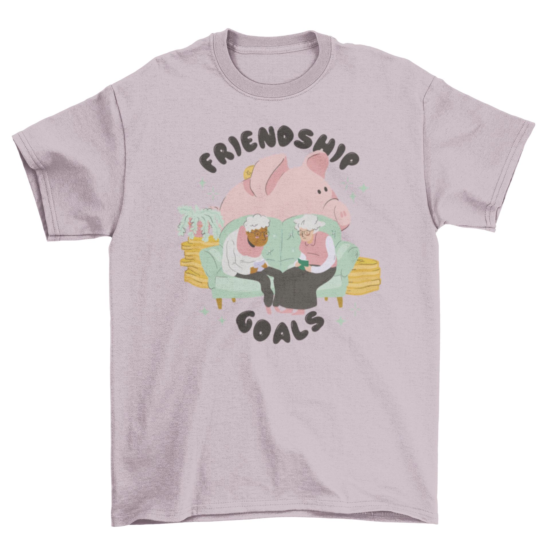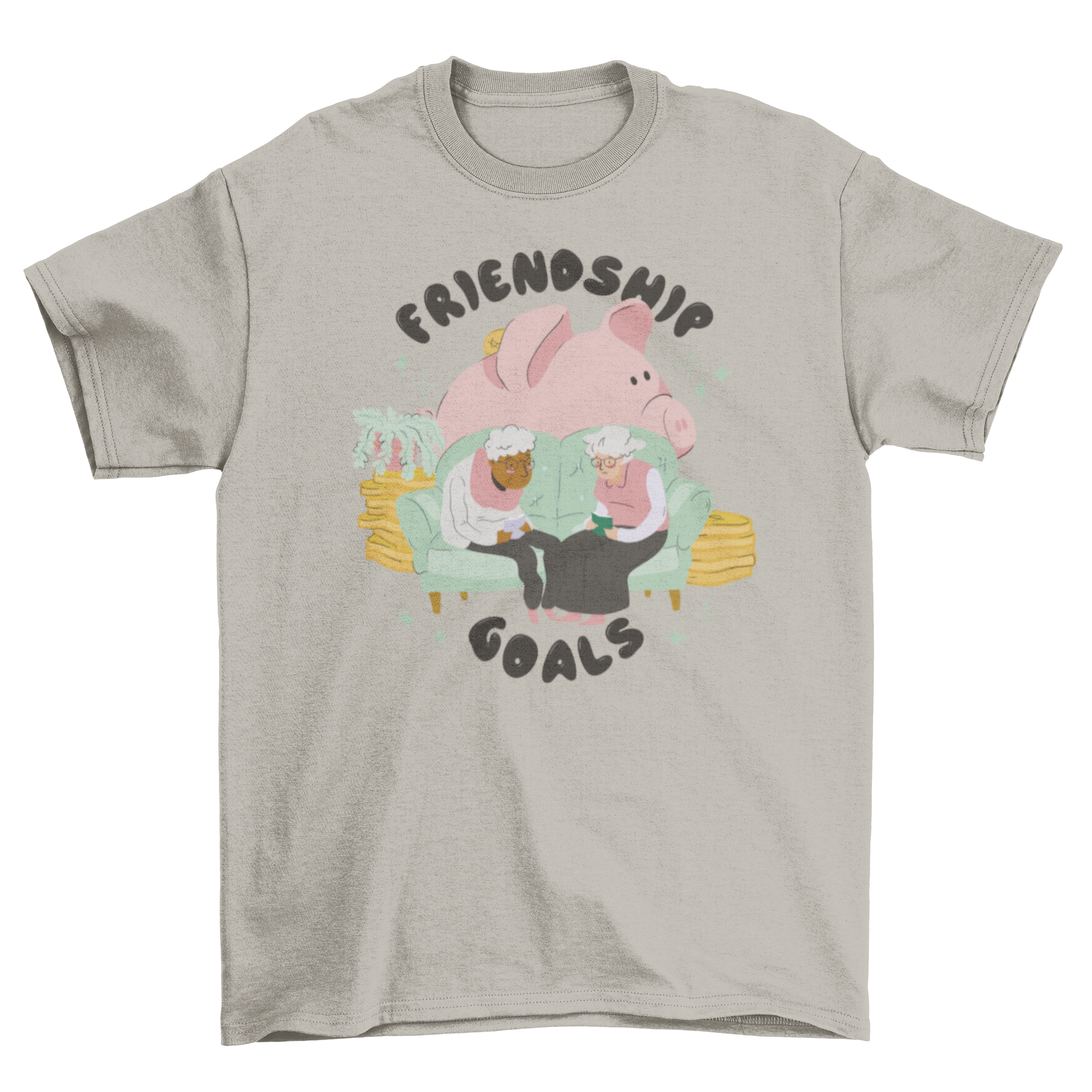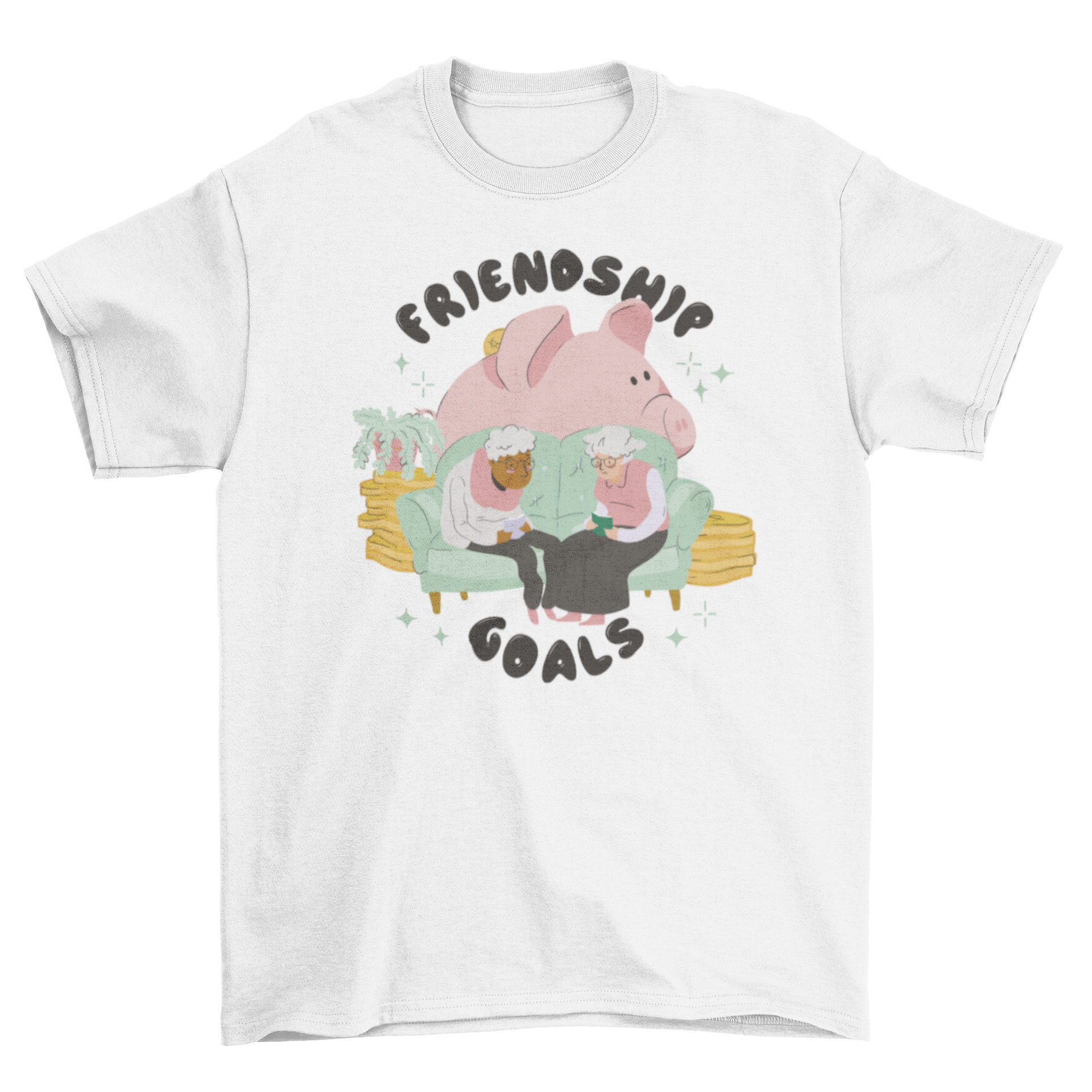 A friendship goals t-shirt featuring two elderly girls smiling together with the quote 'Friendship goals'.