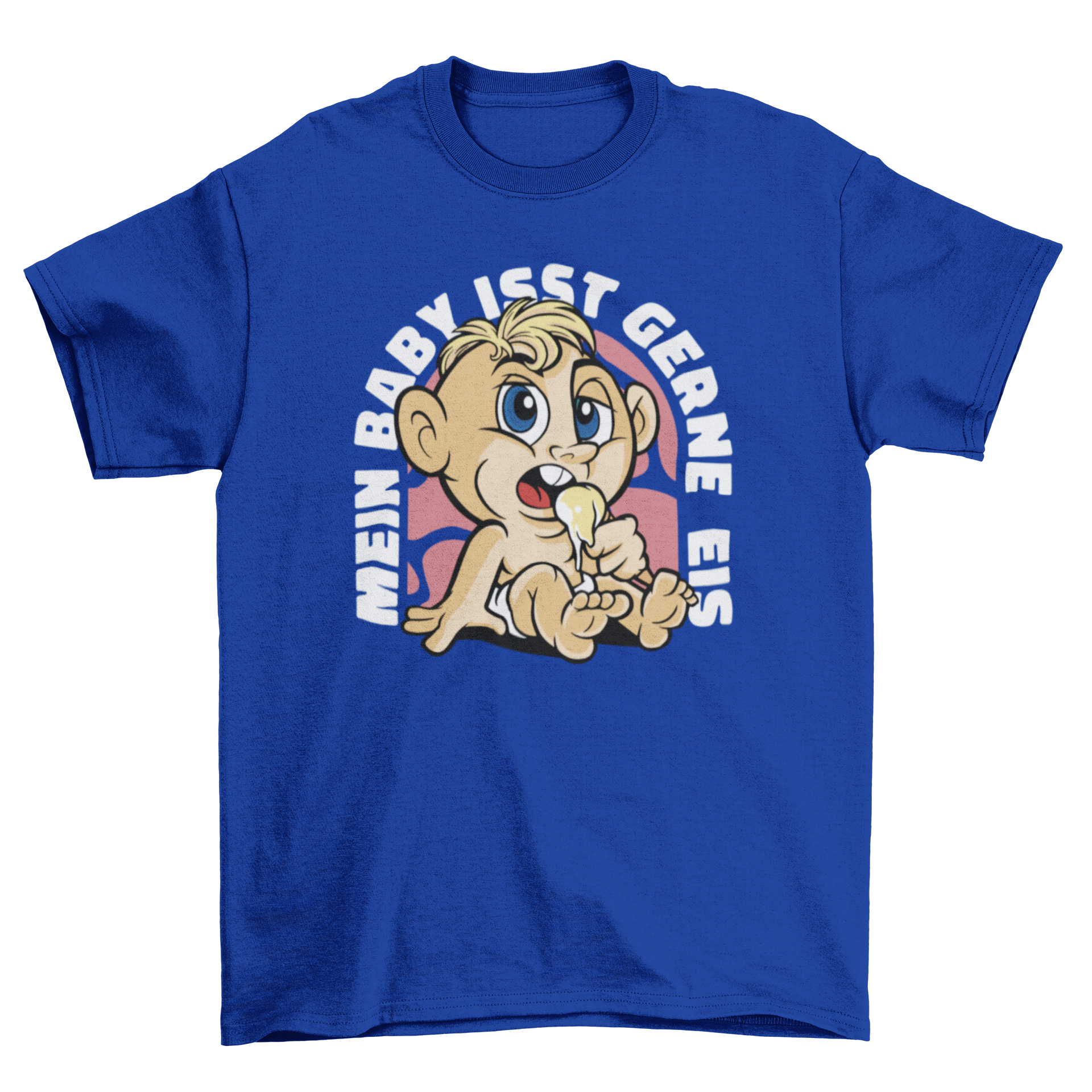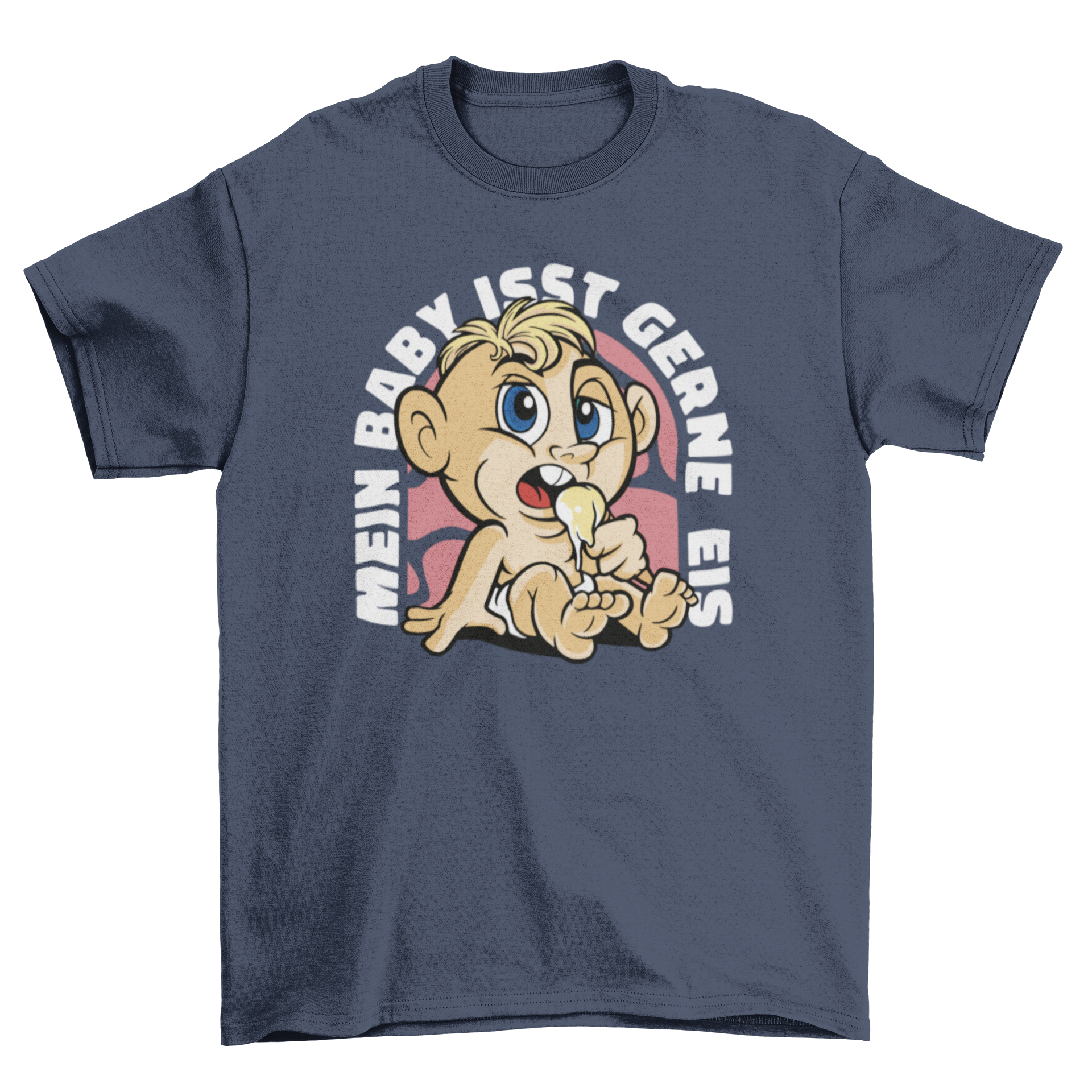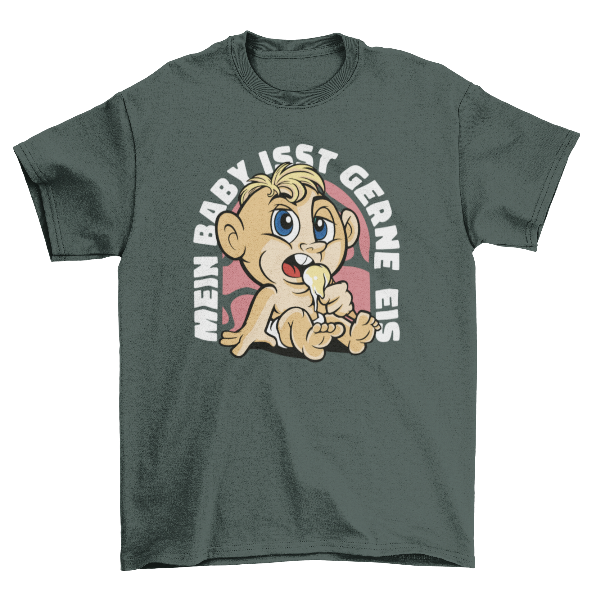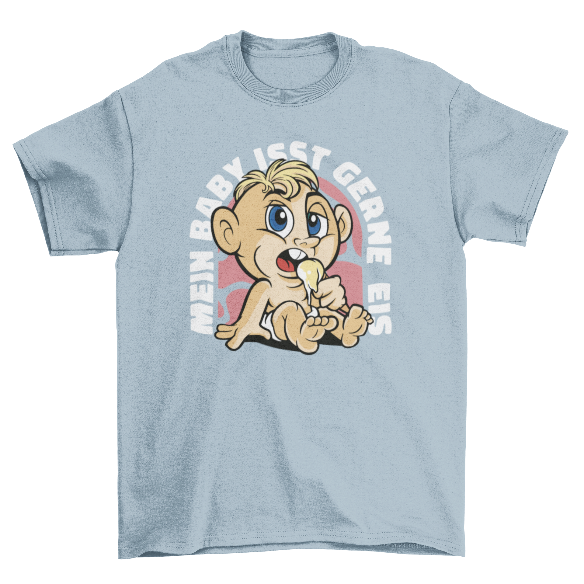 Funny baby t-shirt featuring a comic baby eating ice cream with a German quote.
