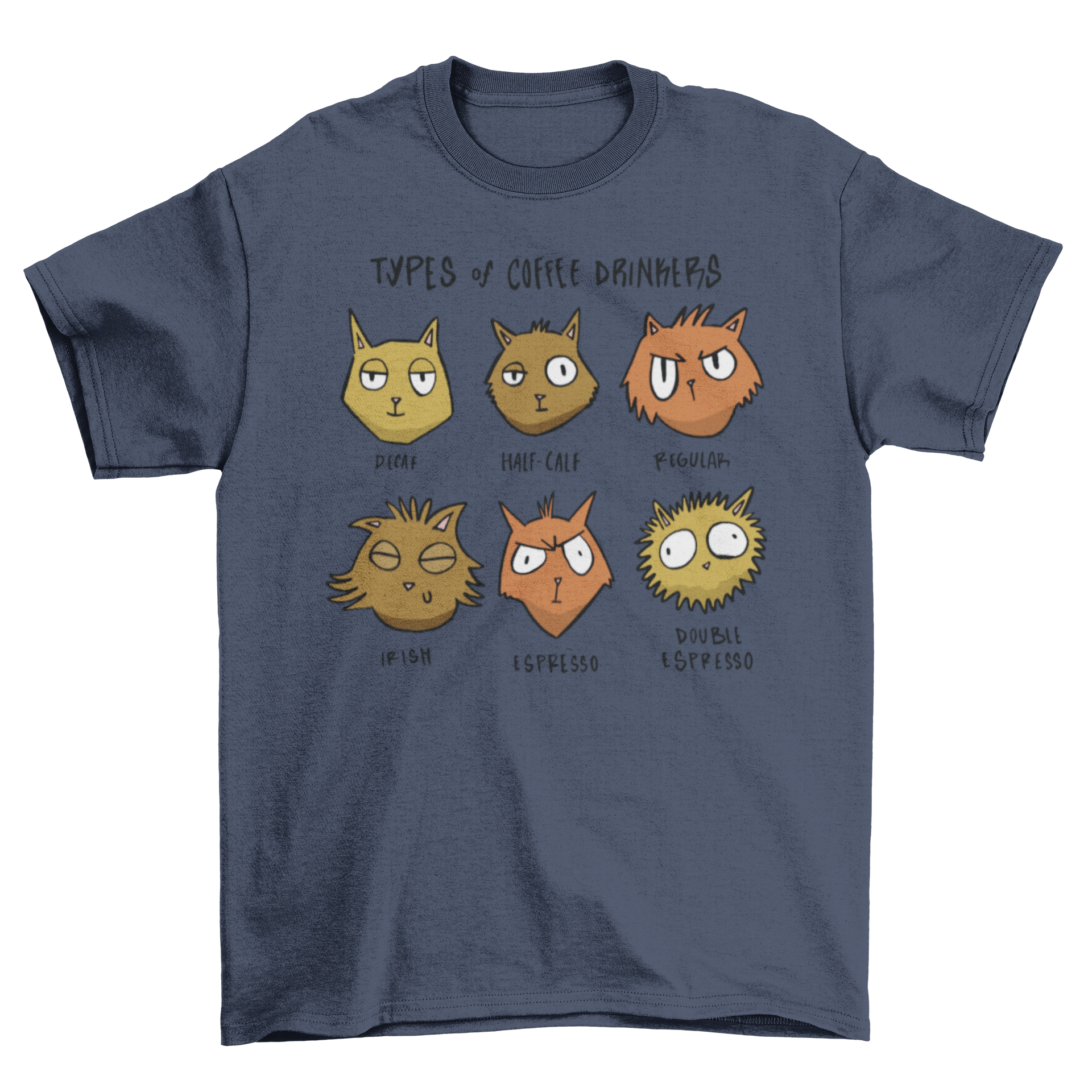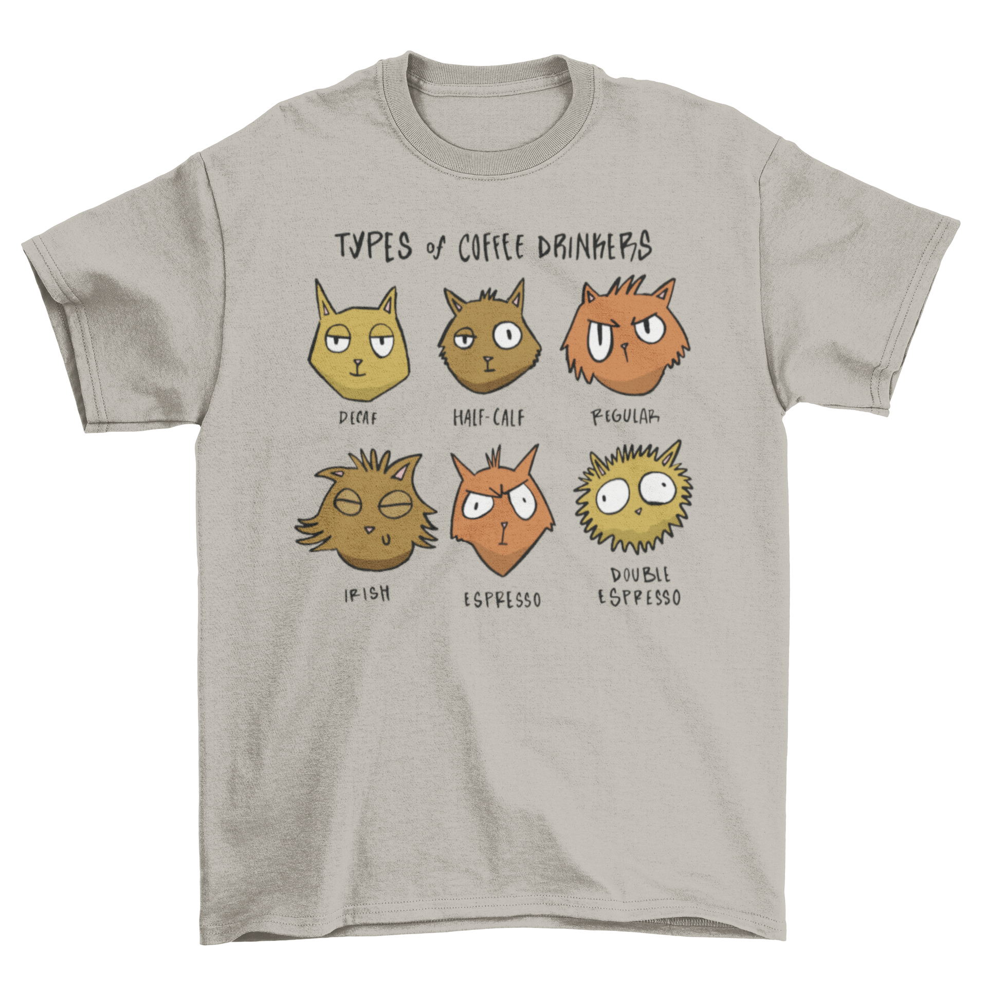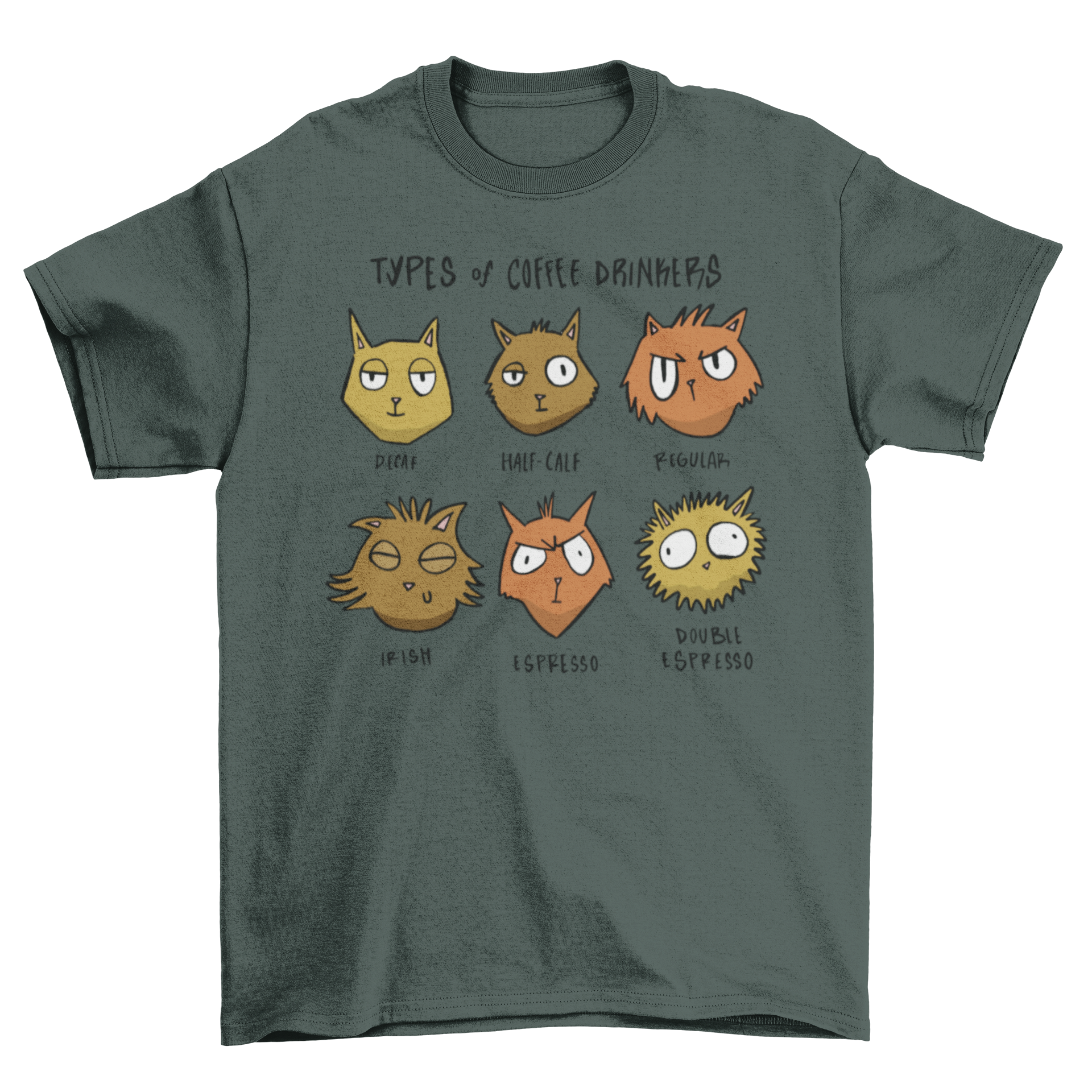 The standout feature of this t-shirt is its hilarious graphic that showcases different cats enjoying their favorite brews. Each cat is depicted in a playful manner, representing various types of coffee drinkers, from the espresso enthusiast to the casual latte lover. This design is sure to bring a smile to anyone who sees it!