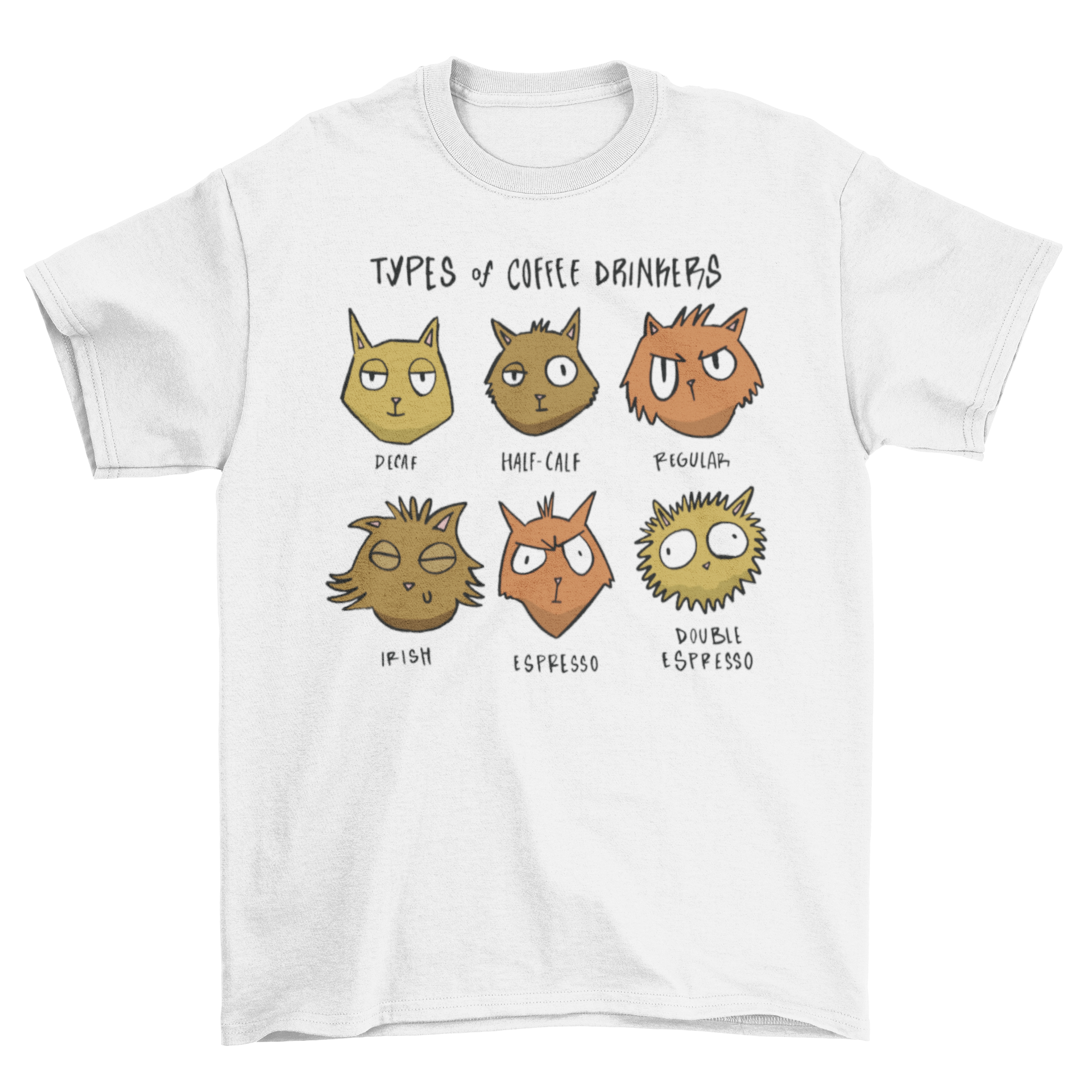 Introducing our Funny Cats T-shirt featuring the whimsical design of various coffee-drinking cats along with the amusing quote 'Types of Coffee Drinkers'. This unique t-shirt is perfect for anyone who loves both cats and coffee, making it a delightful addition to your wardrobe or a thoughtful gift for a friend.