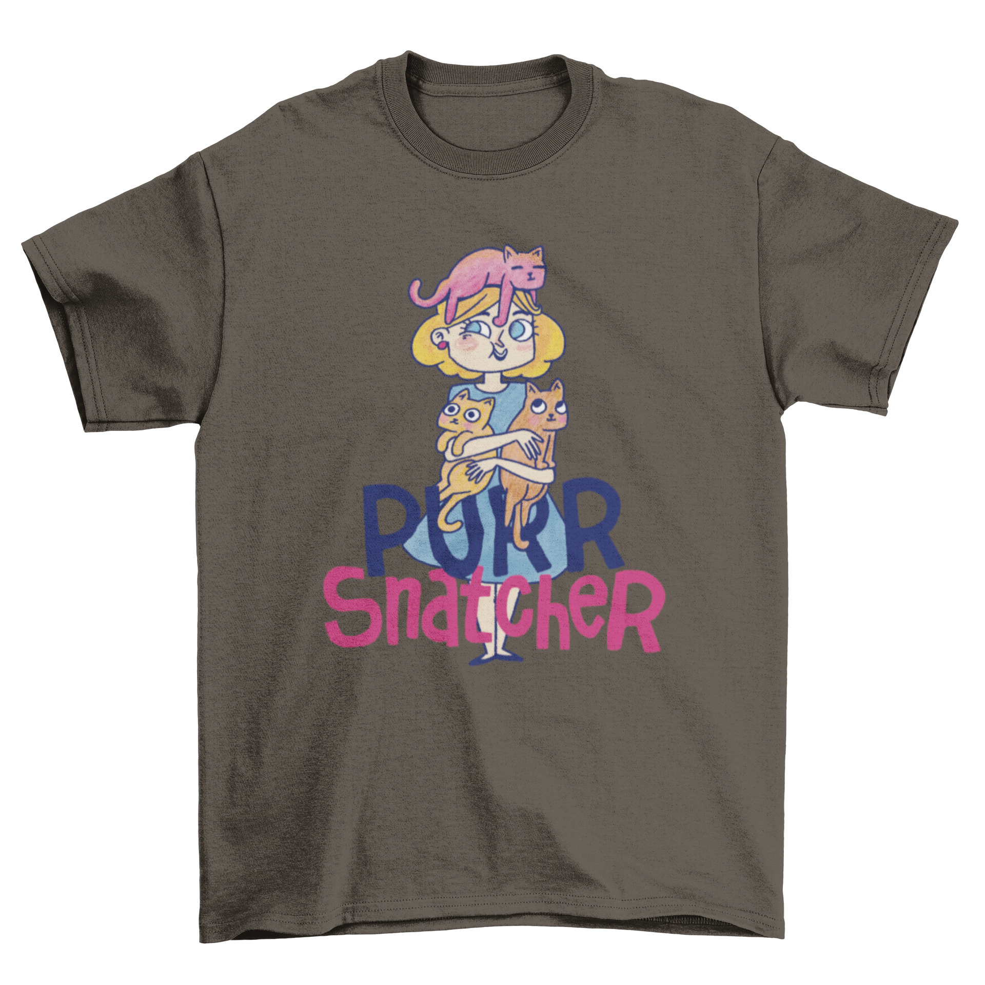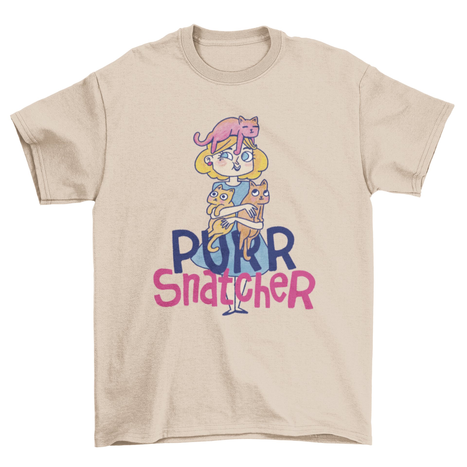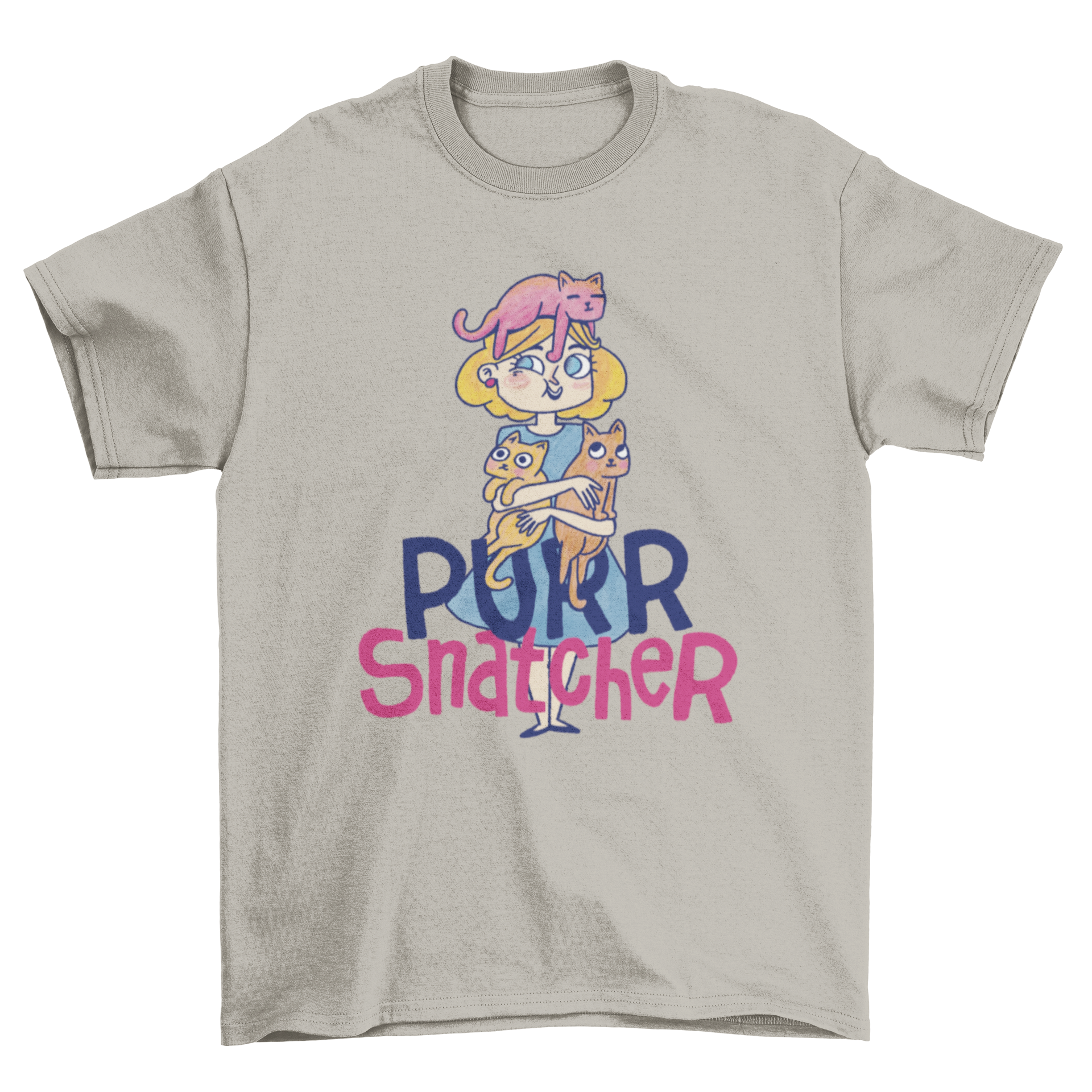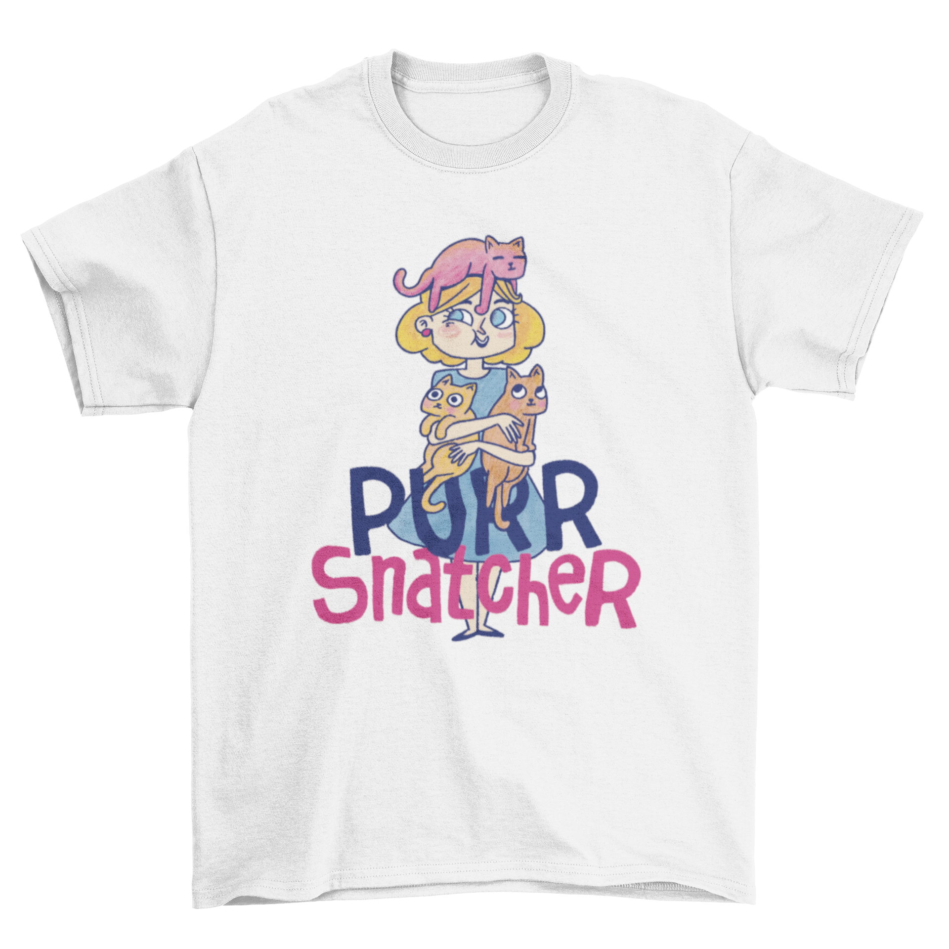 Introducing our Funny Fashion Woman hugging Pet Animals t-shirt, a delightful addition to any cat lover's wardrobe. This unique t-shirt showcases a charming cartoon design featuring a woman lovingly embracing three adorable cats. The playful quote 'Purr snatcher' adds a humorous touch, making it a perfect conversation starter among fellow cat enthusiasts.