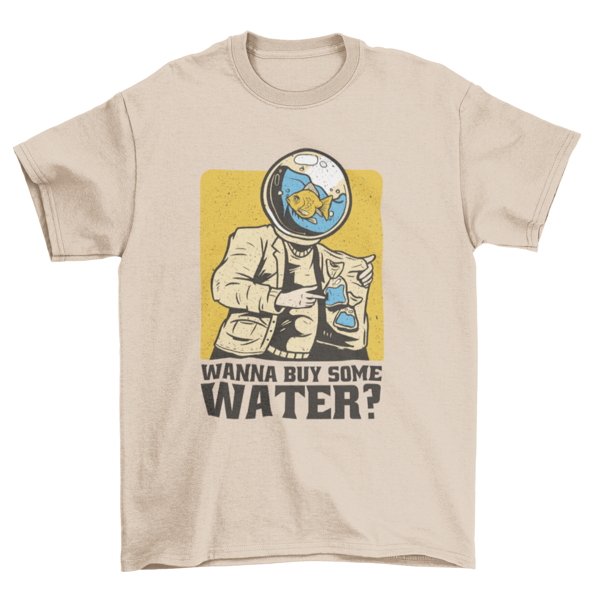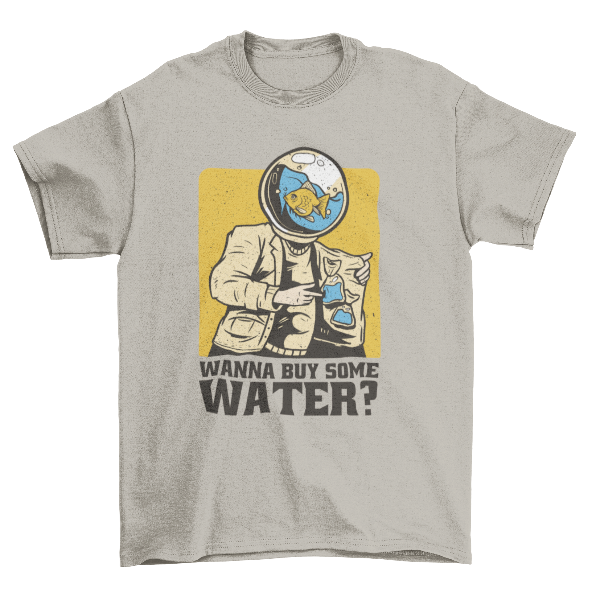 Introducing our hilarious t-shirt featuring a whimsical design of a fish in a tank with a human body, accompanied by the amusing quote, "Wanna buy some water?" This unique t-shirt is perfect for anyone who appreciates humor and creativity in their wardrobe. Whether you're a fish enthusiast or just someone who loves to stand out, this shirt is sure to turn heads and spark conversations.