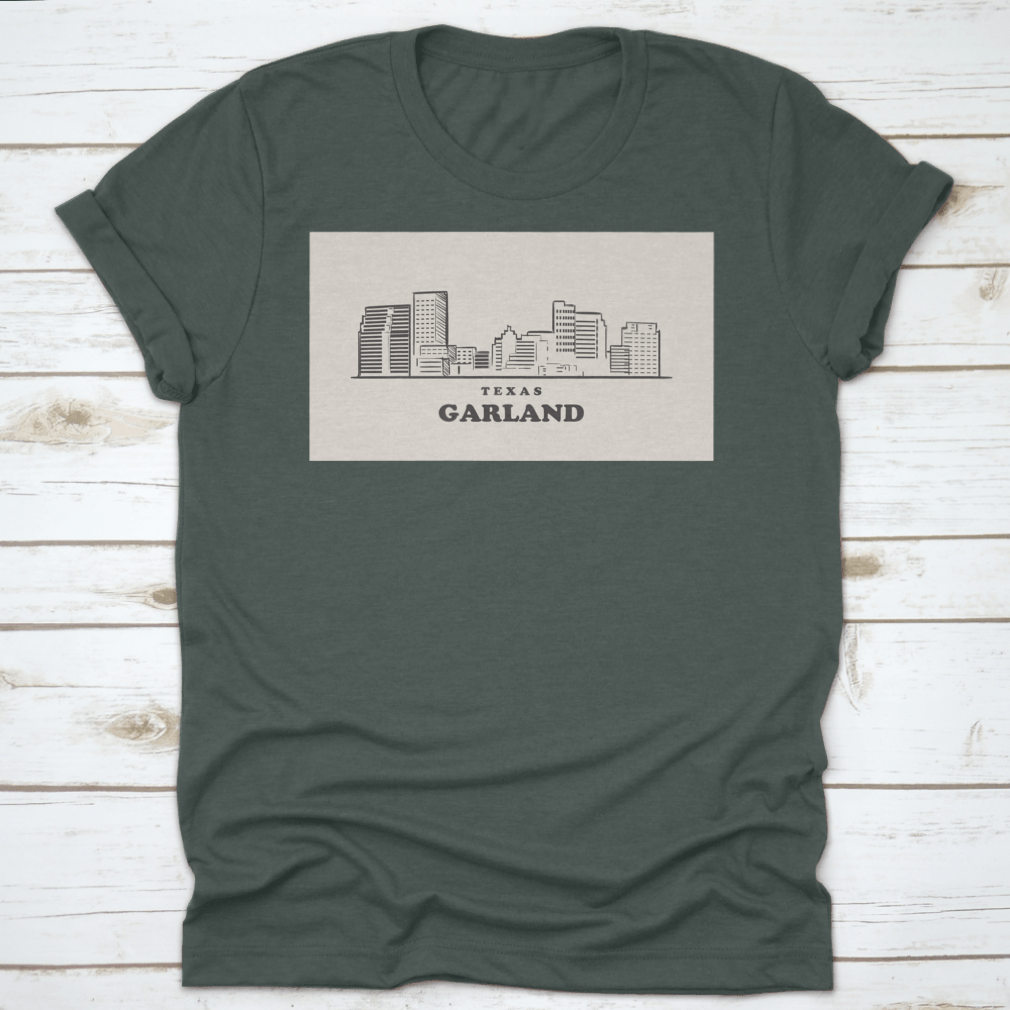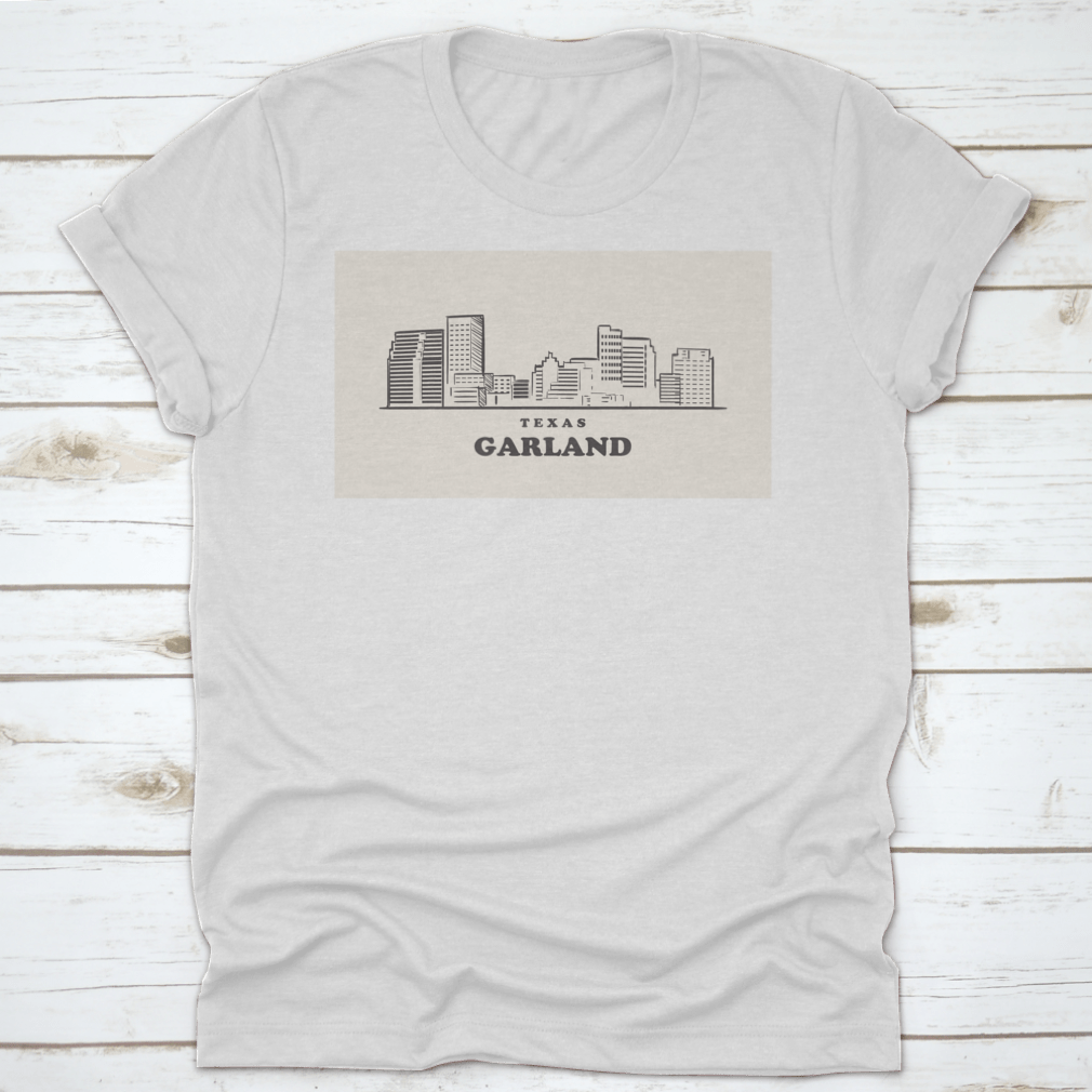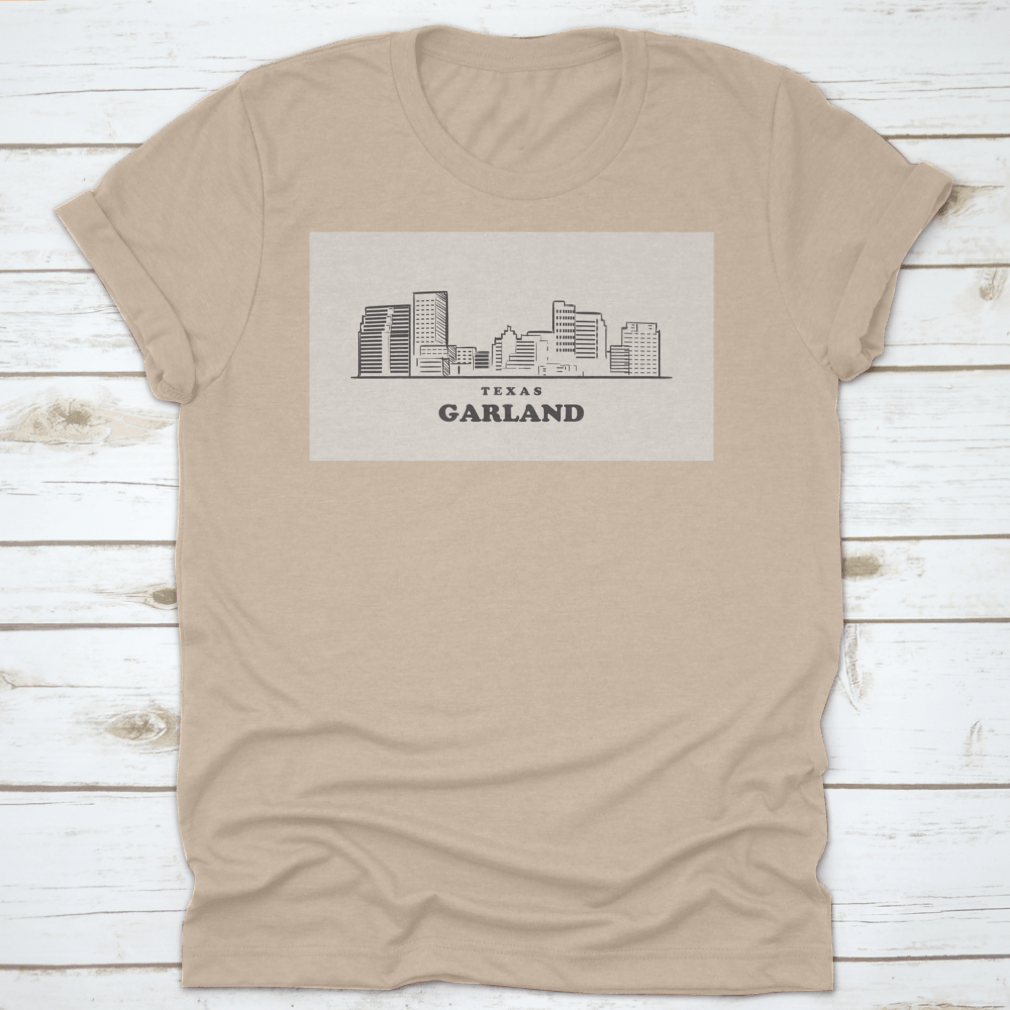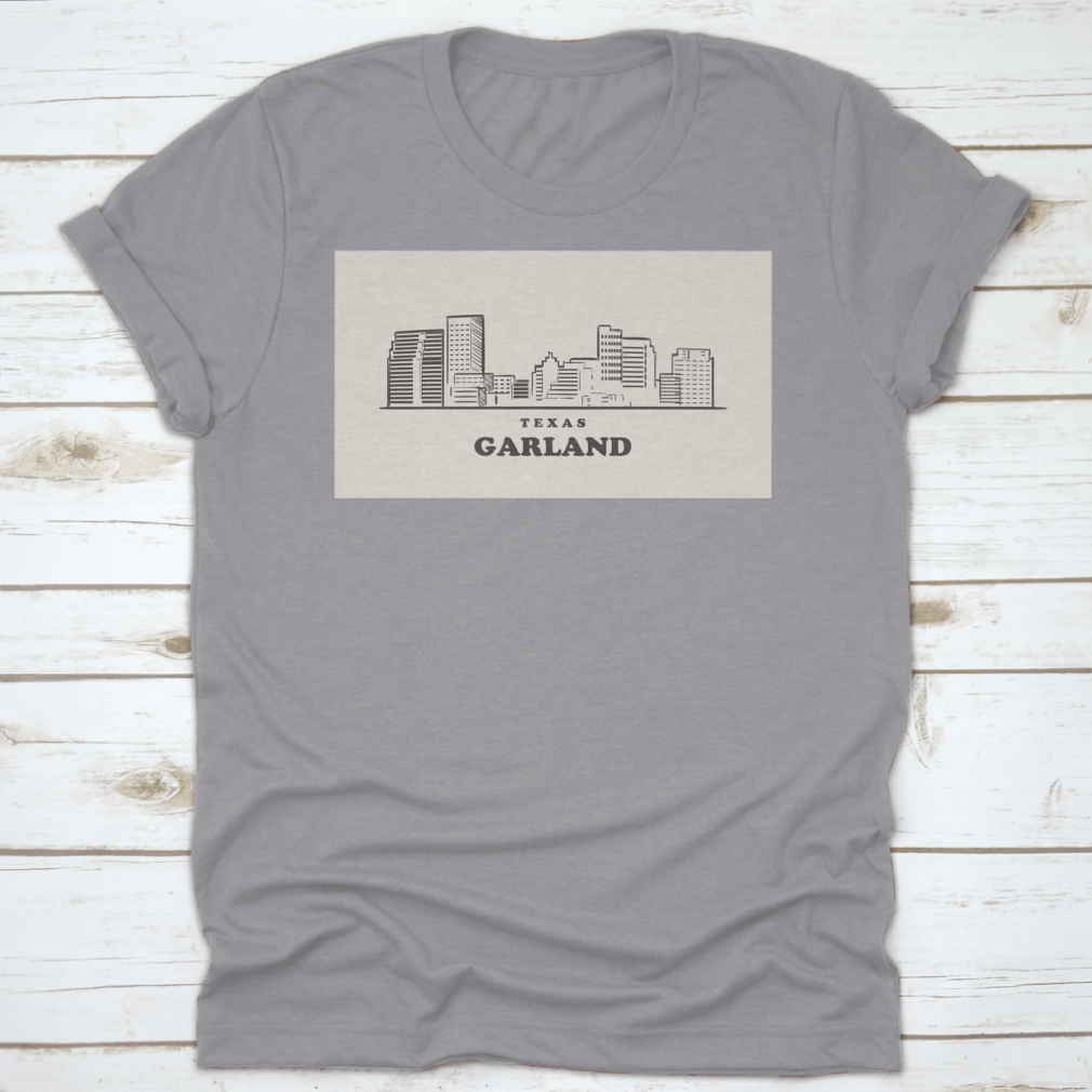 Garland Texas City Skyline drawn sketch on a stylish travel design shirt, showcasing a unique urban landscape.