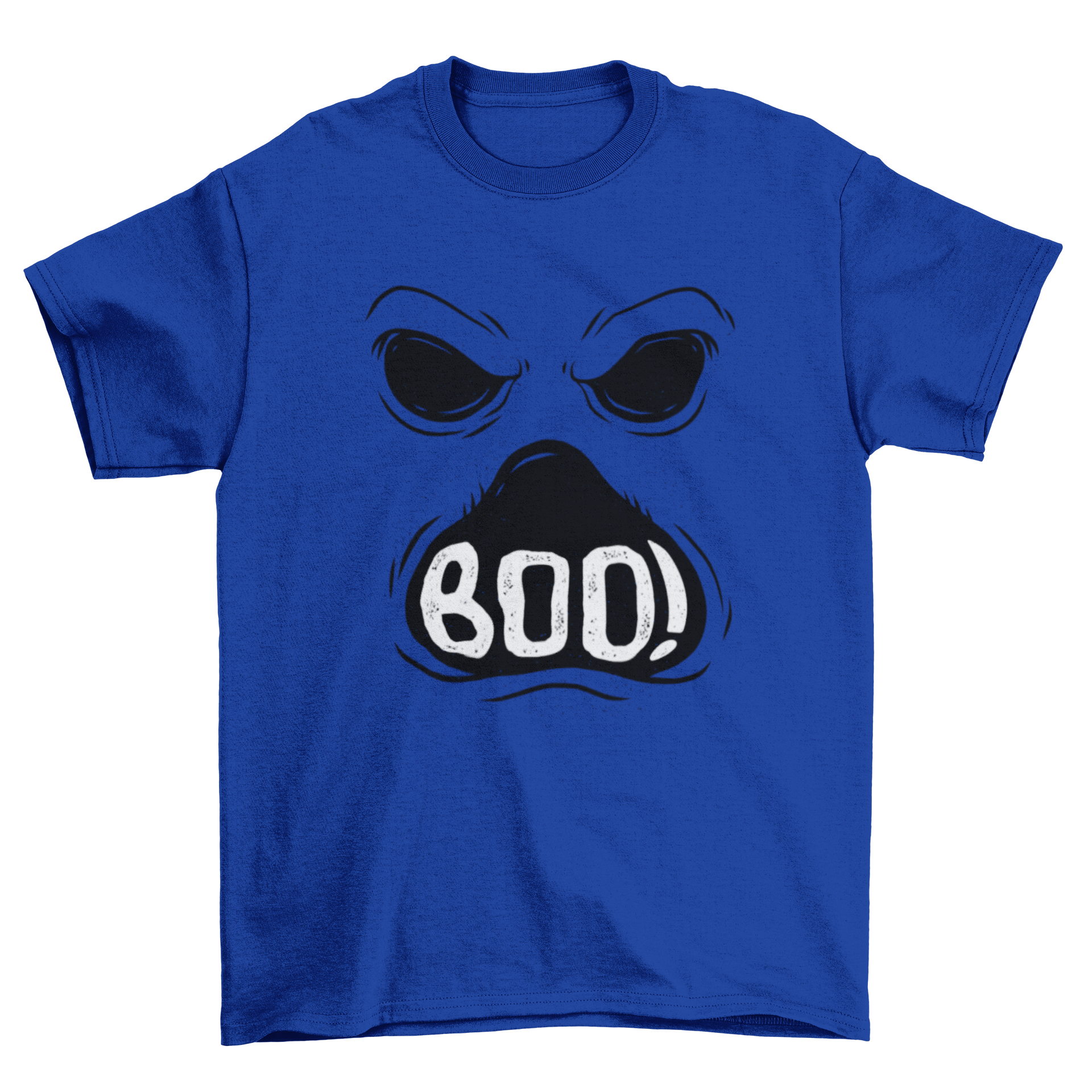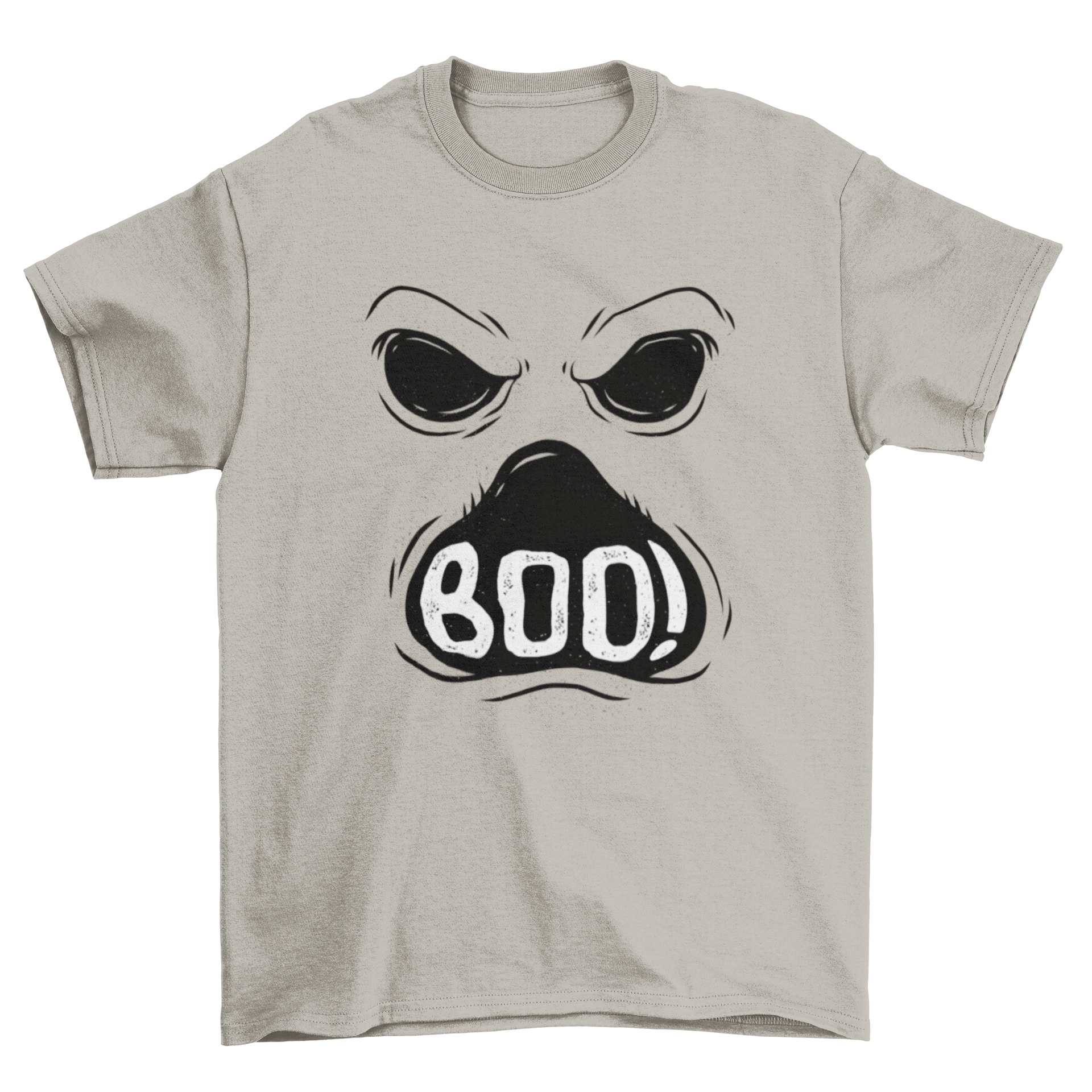 Embrace the Halloween spirit with our unique Ghost Boo t-shirt design. This cool and simple t-shirt features a striking ghost face with angry-looking eyes and an open mouth, exclaiming 'Boo!' Perfect for those who love to celebrate Halloween in style, this t-shirt is not just a piece of clothing; it's a statement of fun and festivity.