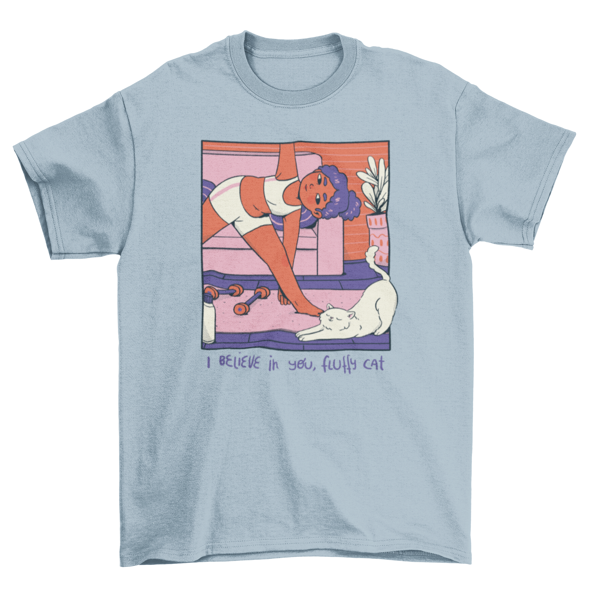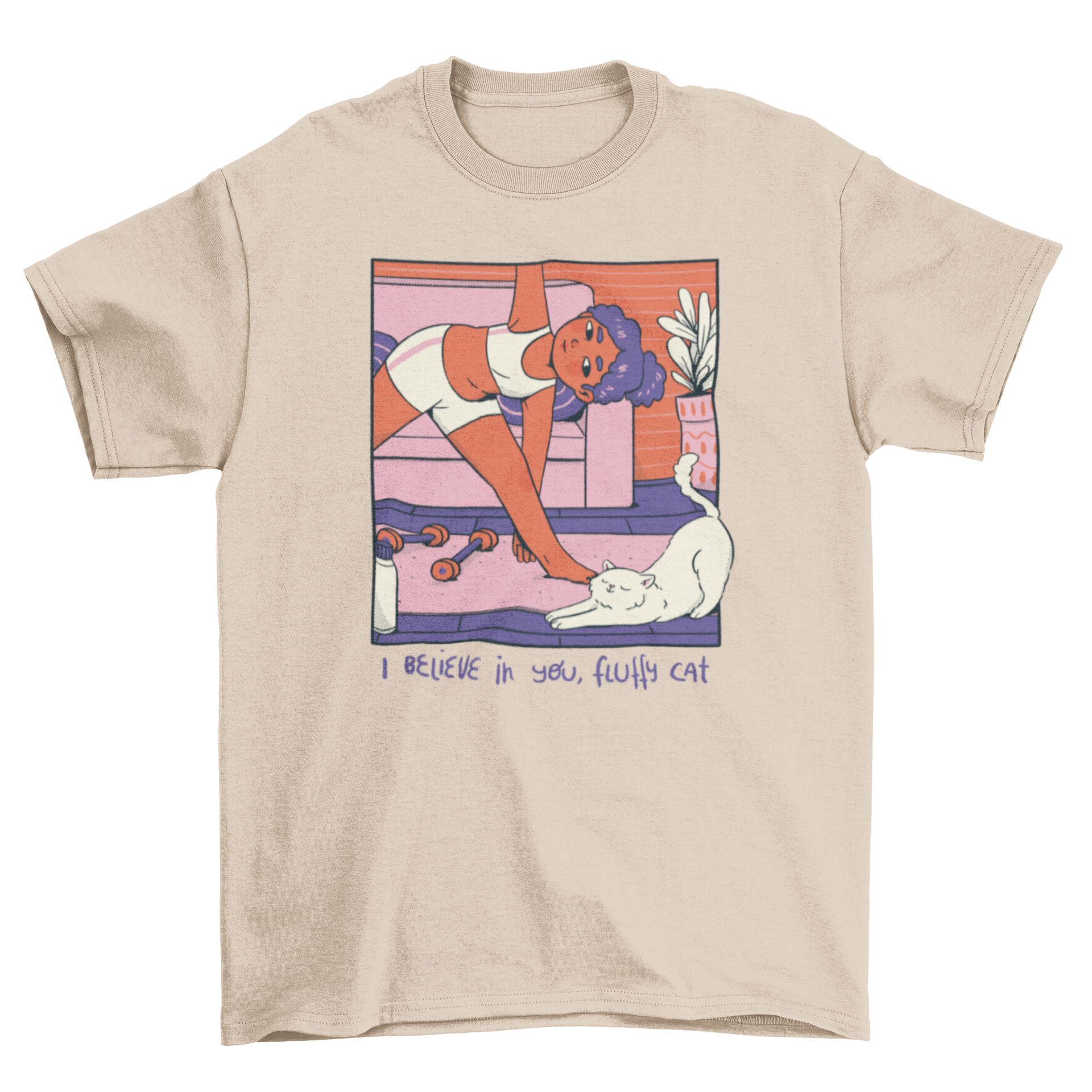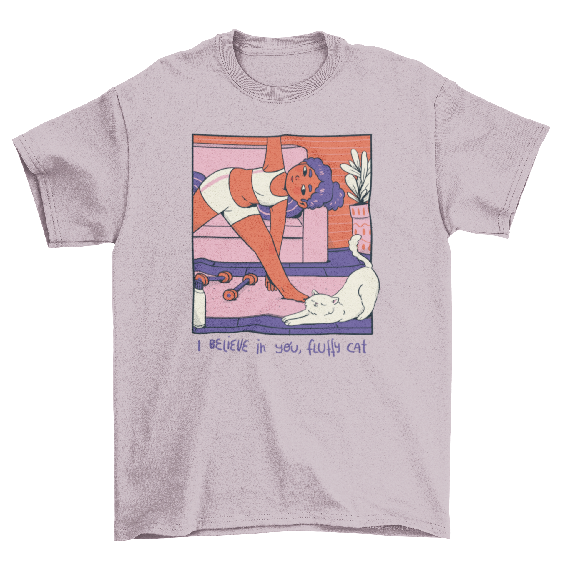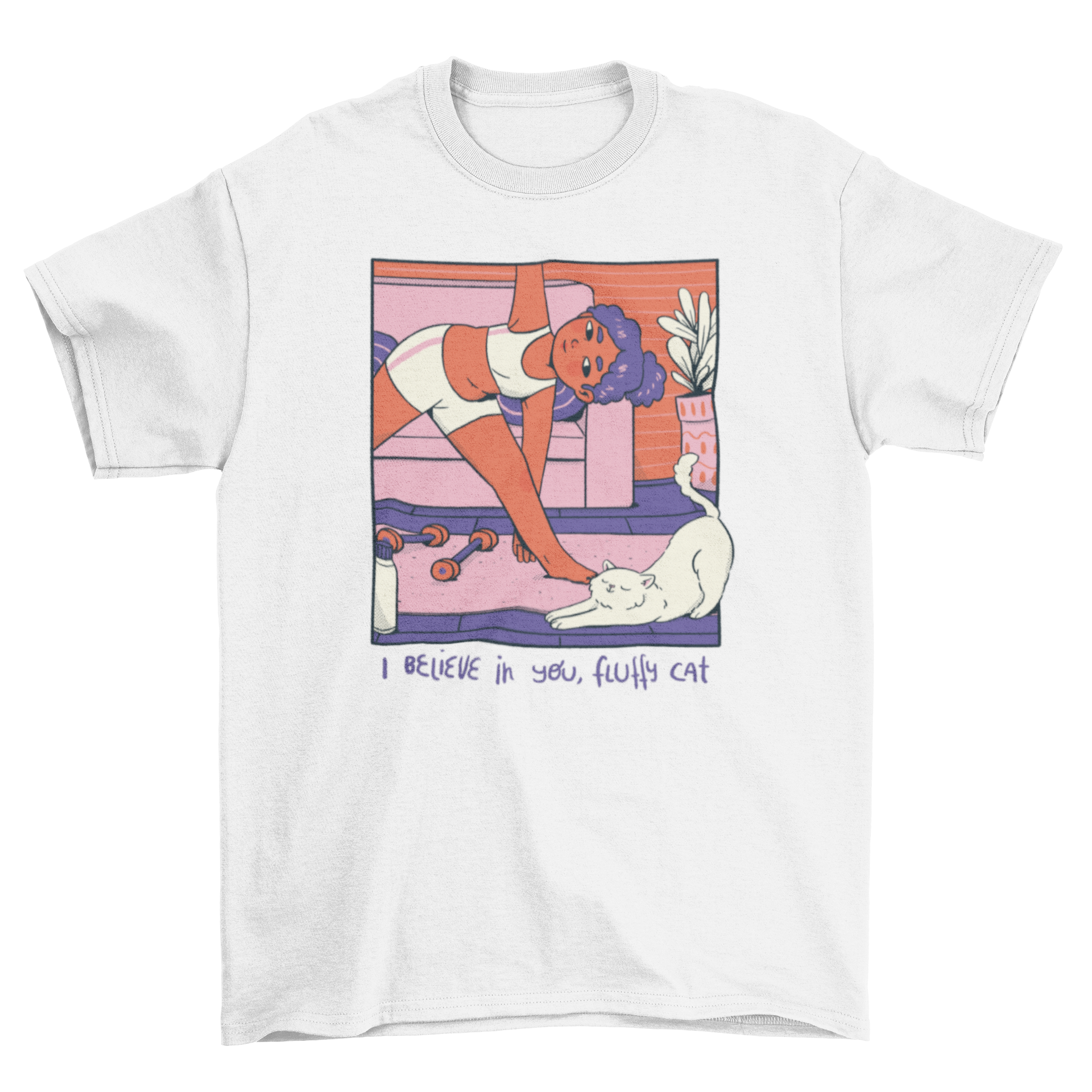 The standout feature of this t-shirt is its eye-catching design. The illustration of a girl doing yoga is not only fun but also inspiring. It encourages a positive mindset and promotes the importance of self-care and mindfulness. The addition of the quote, "I believe in you fluffy cat," adds a humorous and light-hearted element, making it a conversation starter among friends and fellow yoga enthusiasts.