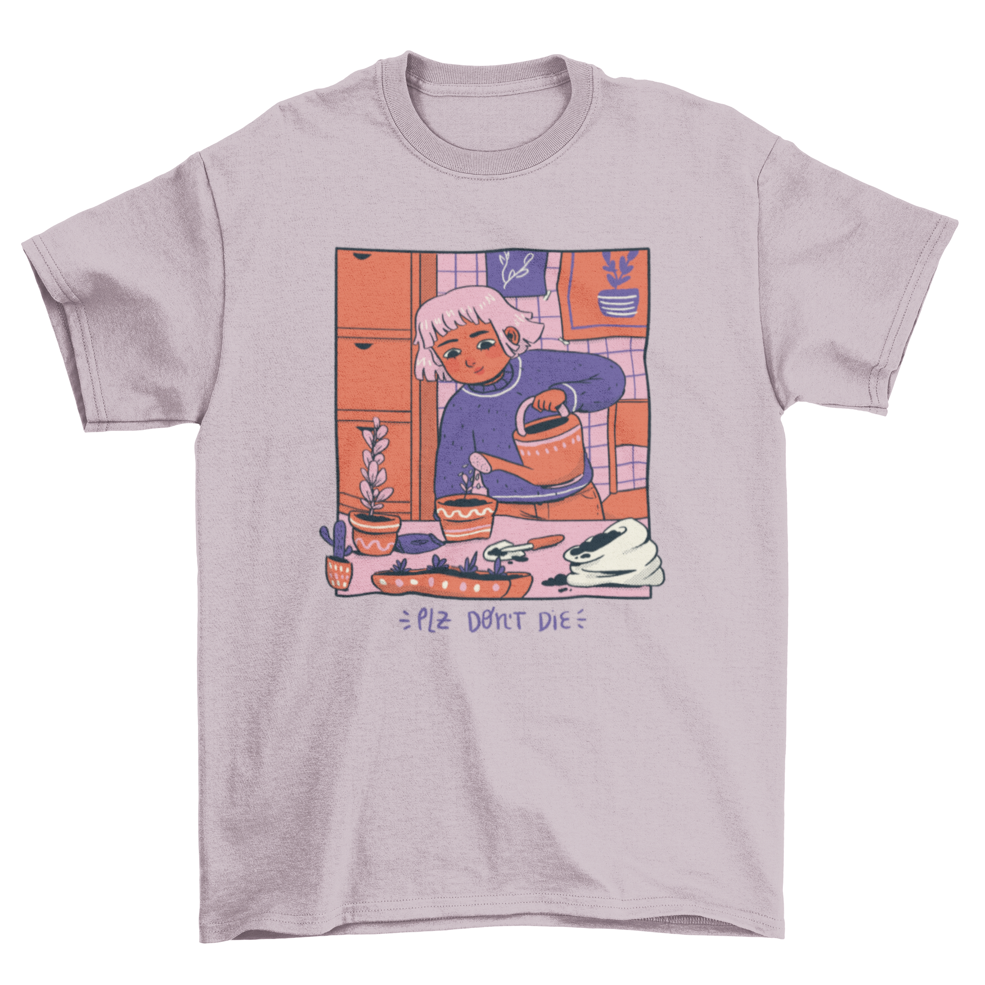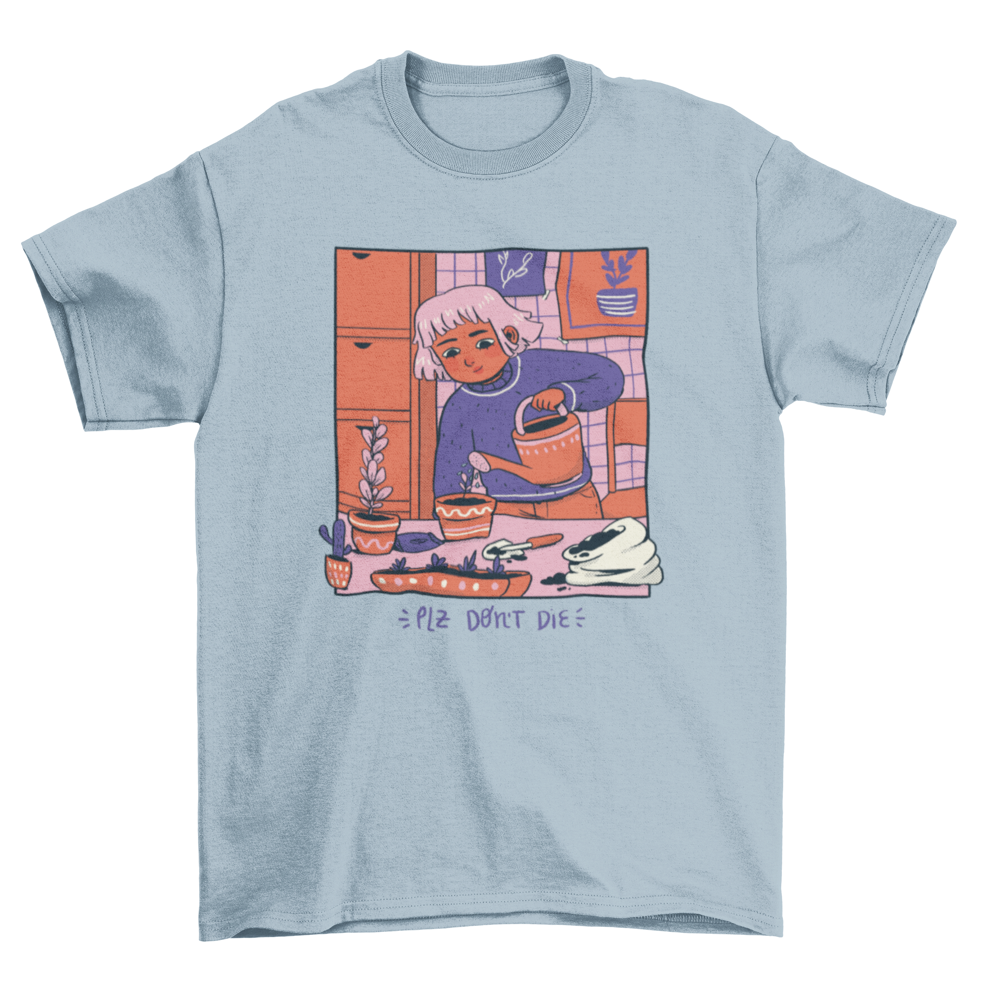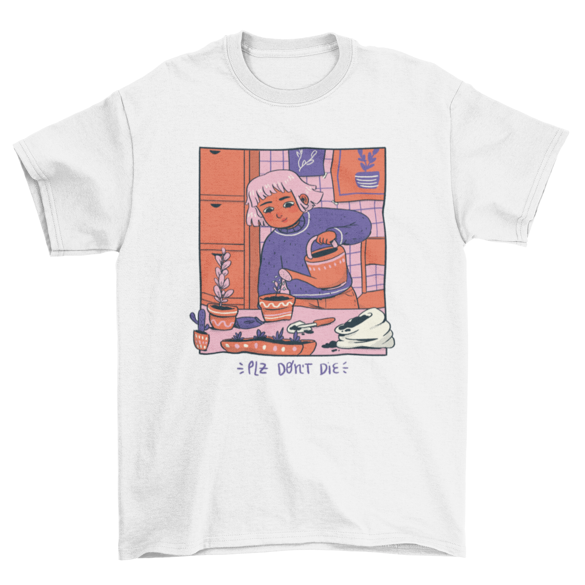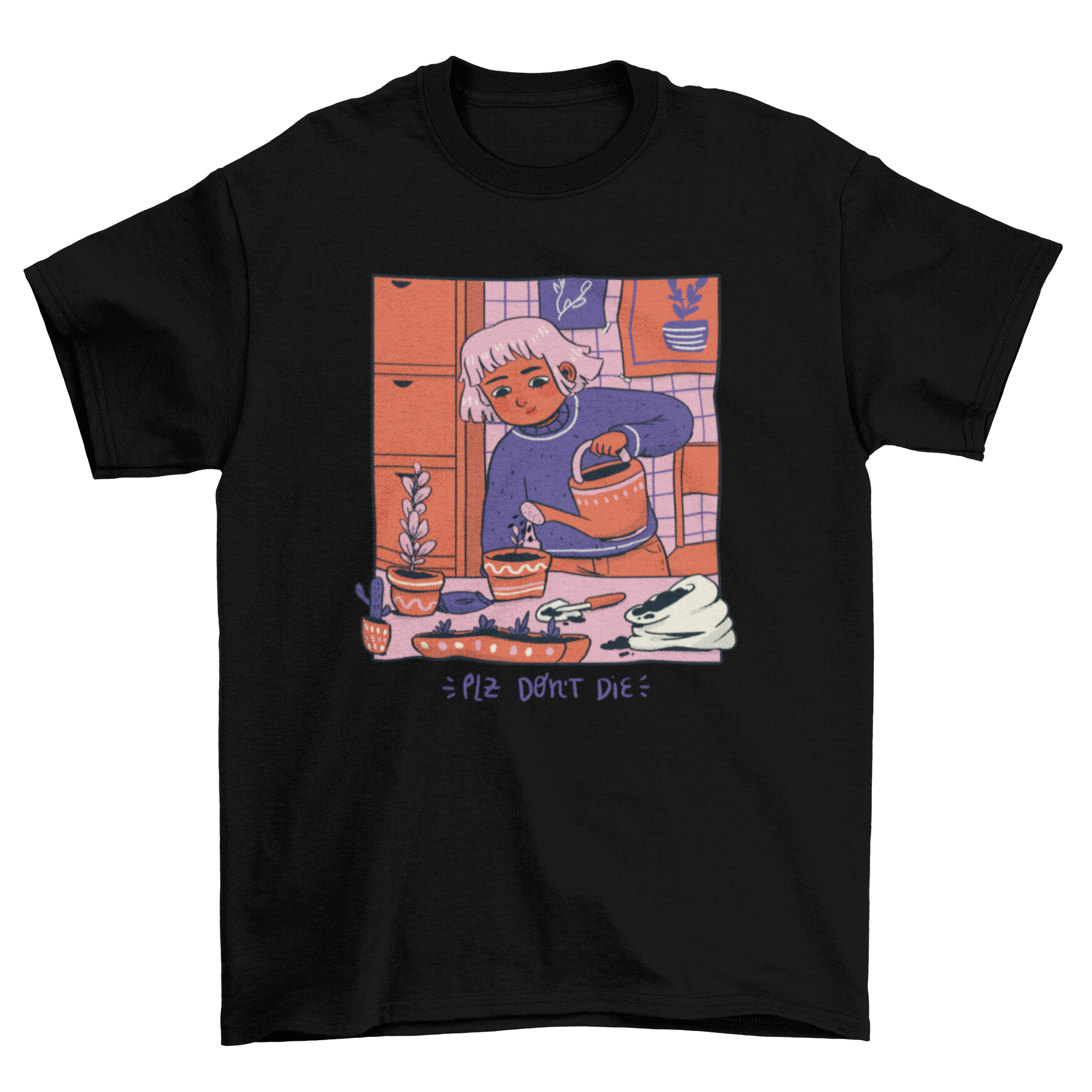 Introducing our delightful Girl Watering Plants Cozy Comic T-Shirt Design, a perfect blend of humor and style for plant lovers everywhere. This unique t-shirt features a charming illustration of a girl lovingly watering her plants, accompanied by the playful quote, "Please don't die." This design not only showcases your passion for gardening but also adds a touch of whimsy to your wardrobe.
