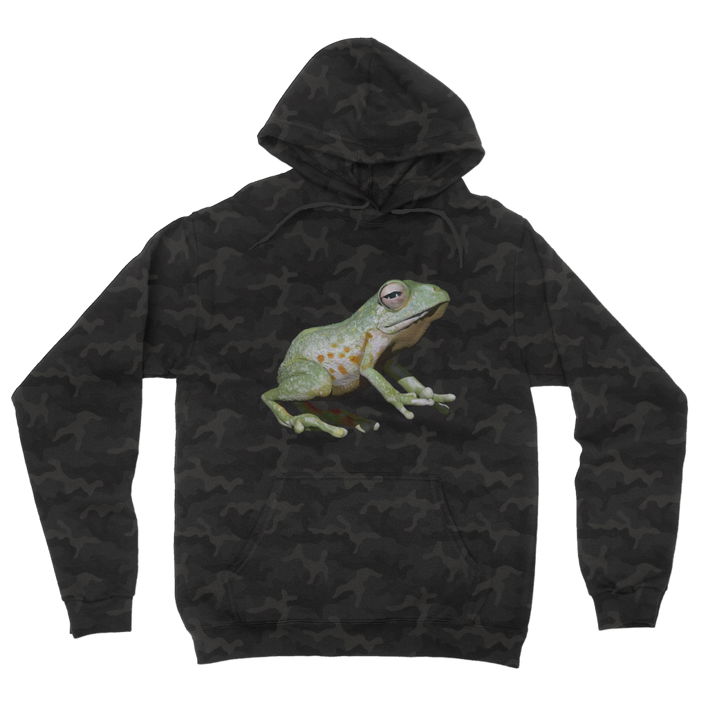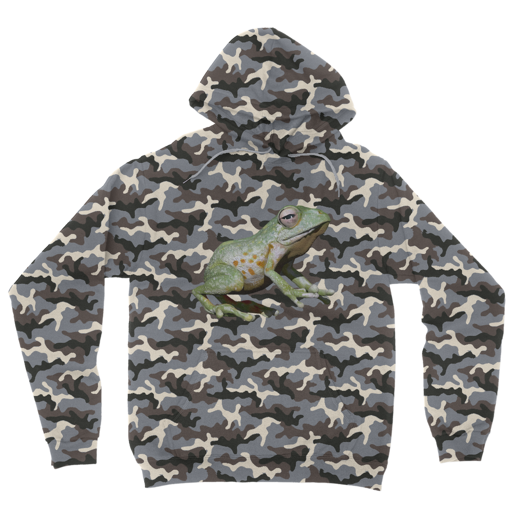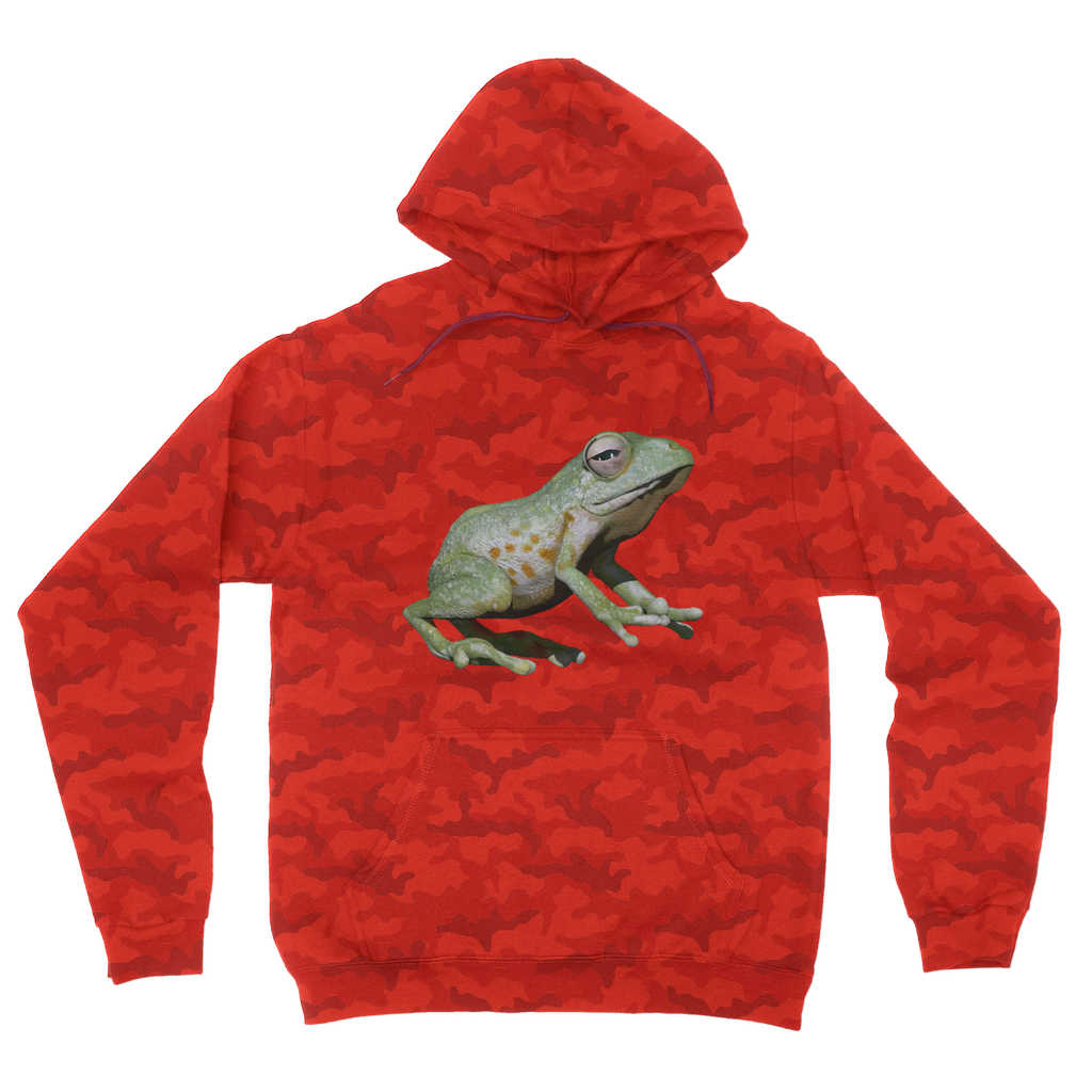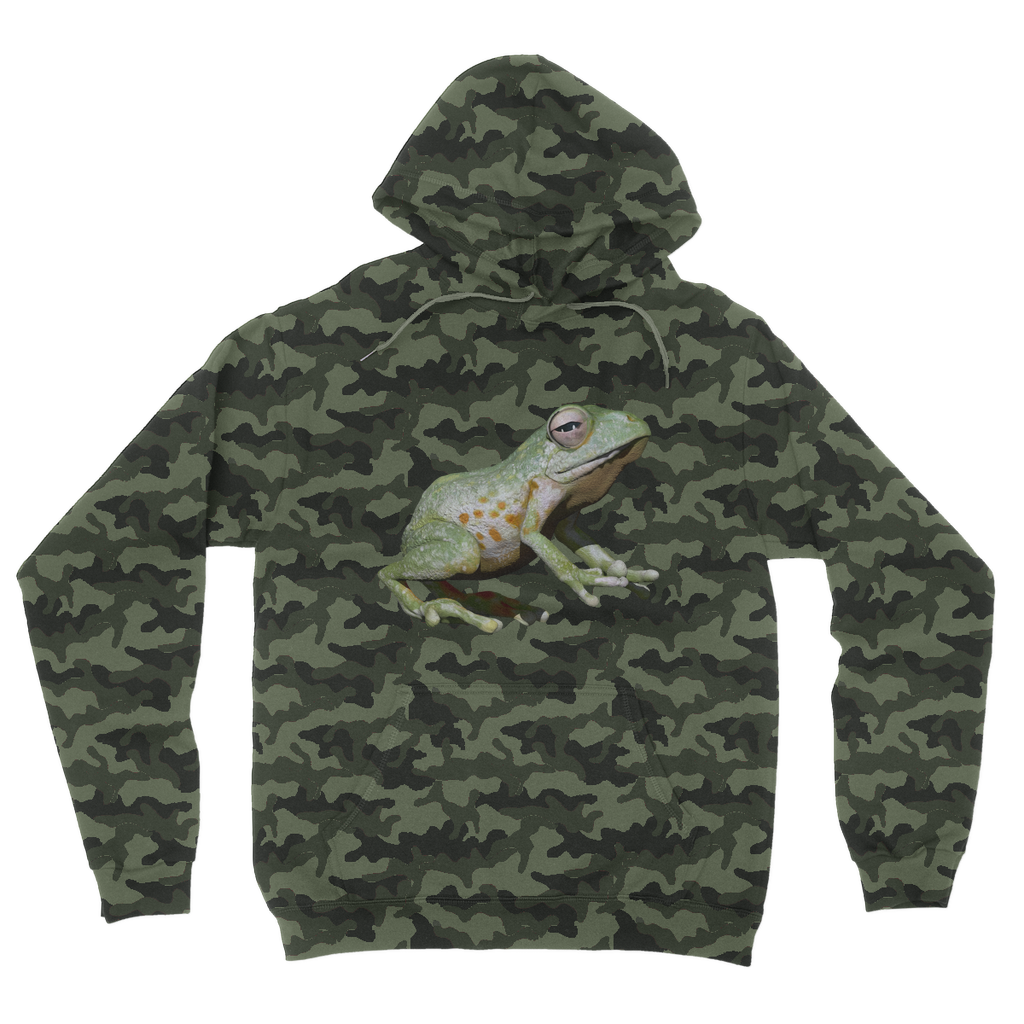 Introducing the Green Frog Camouflage Adult Hoodie, a must-have addition to your wardrobe that combines style and comfort effortlessly. This hoodie features a striking all-over camouflage design that not only keeps you on-trend but also adds a unique flair to your casual outfits. Whether you're heading out for a casual day with friends or lounging at home, this hoodie is the perfect choice for any occasion.