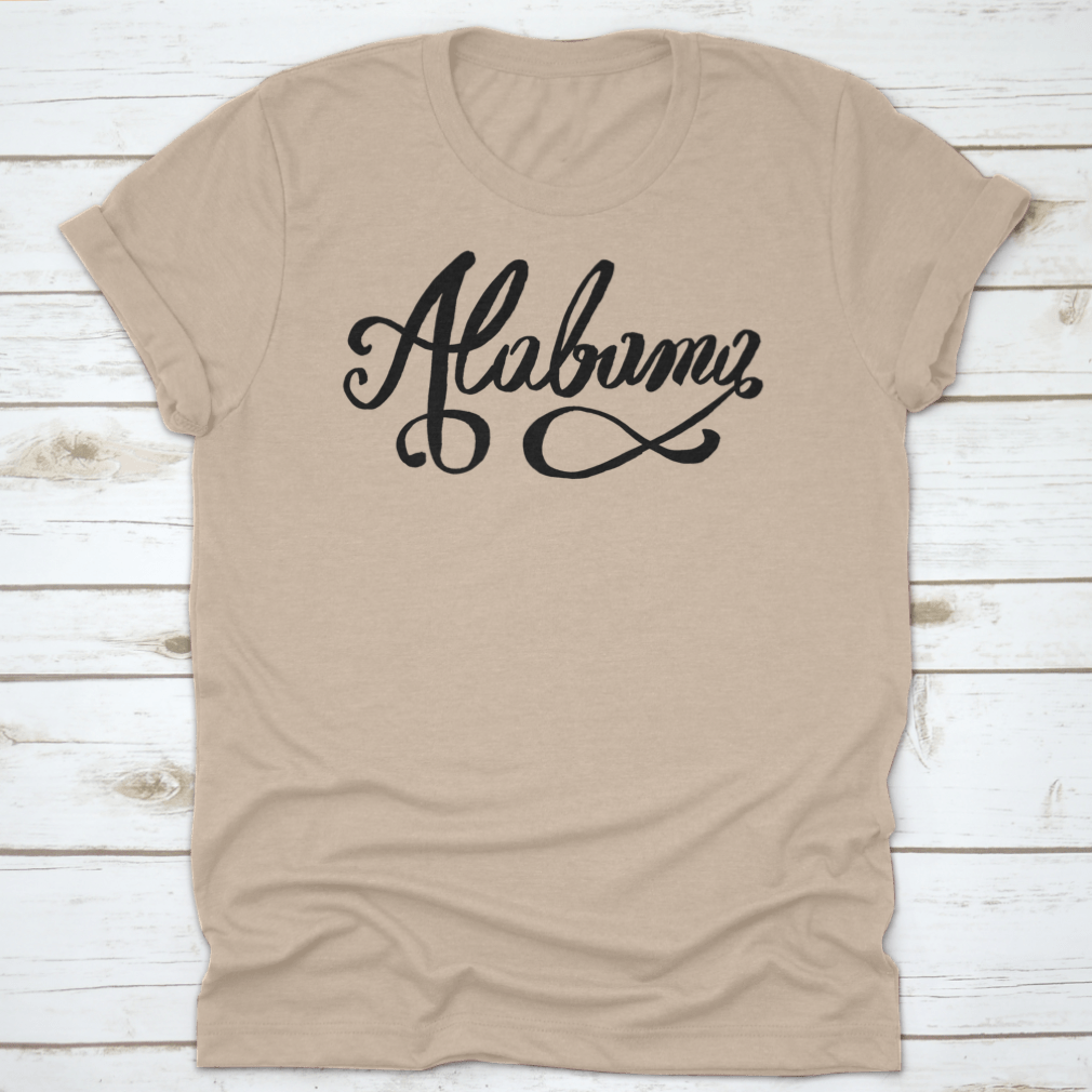 Introducing the Hand-Lettering Calligraphy of Alabama with Infinity Sign Vector, a unique and stylish design that celebrates the beauty of Alabama. This product is perfect for those who appreciate artistic expression and want to showcase their love for the state. Made from high-quality materials, this item is not only visually appealing but also comfortable to wear or display.