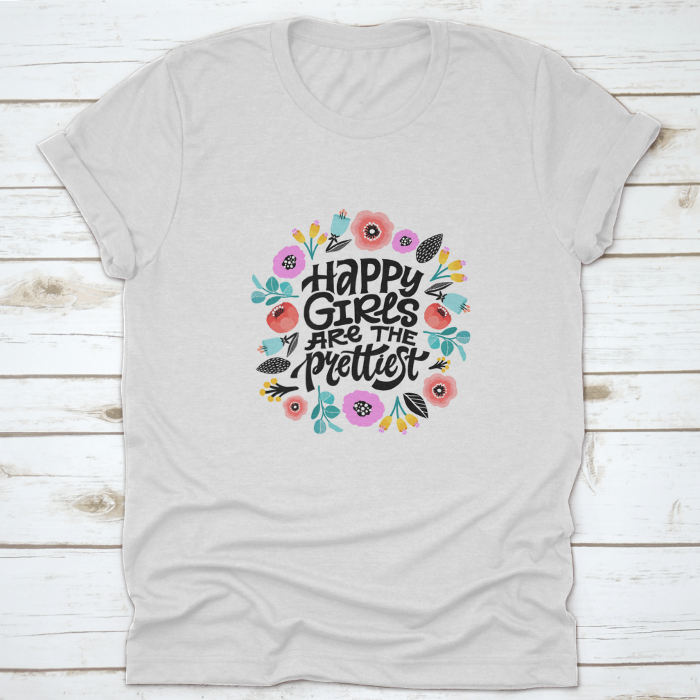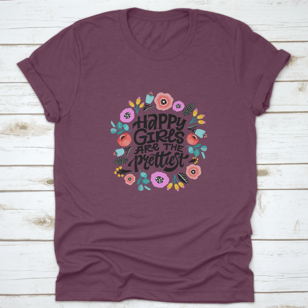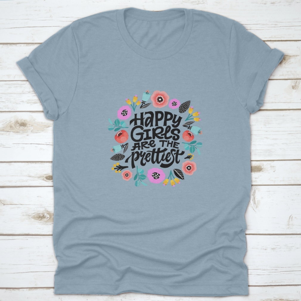 A stylish t-shirt featuring the motivational quote 'Happy Girls Are The Prettiest', made from soft cotton fabric.