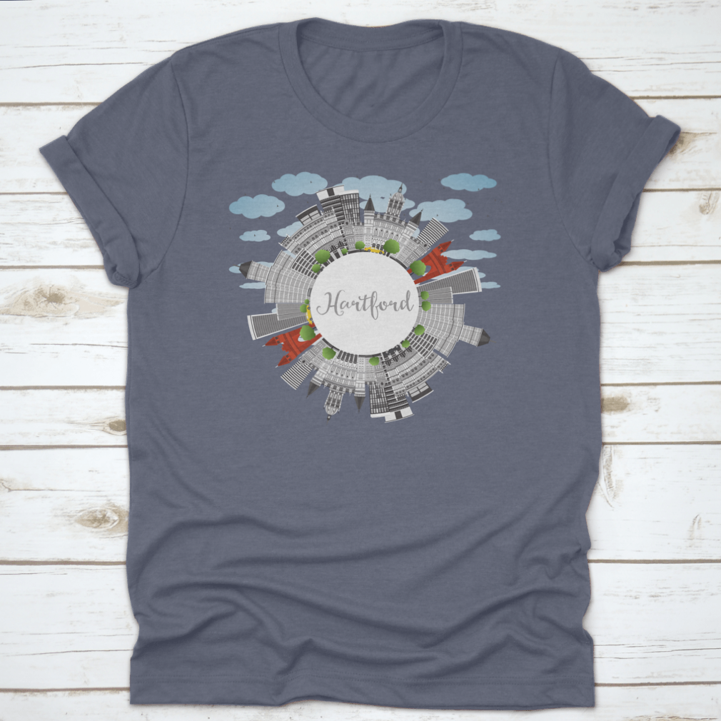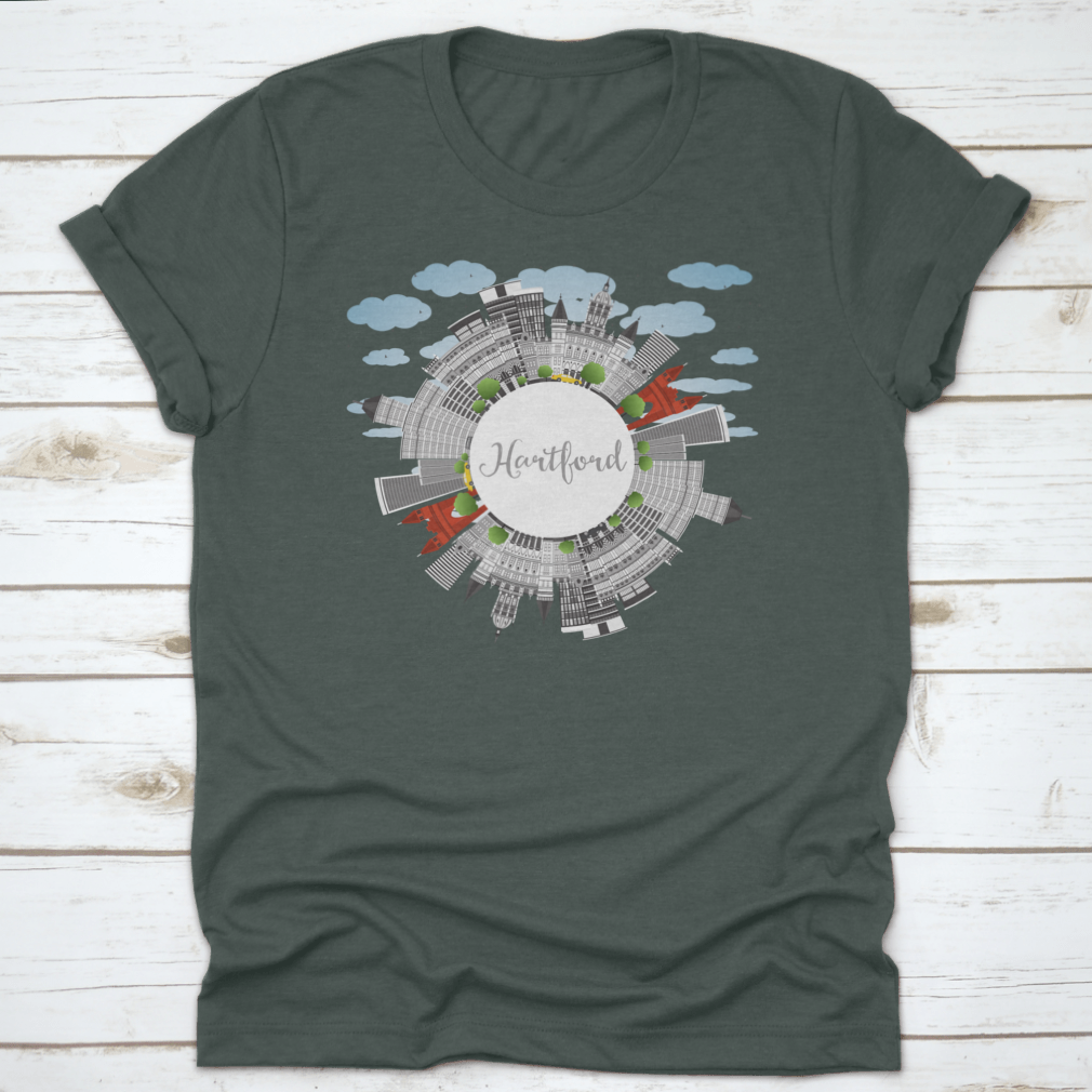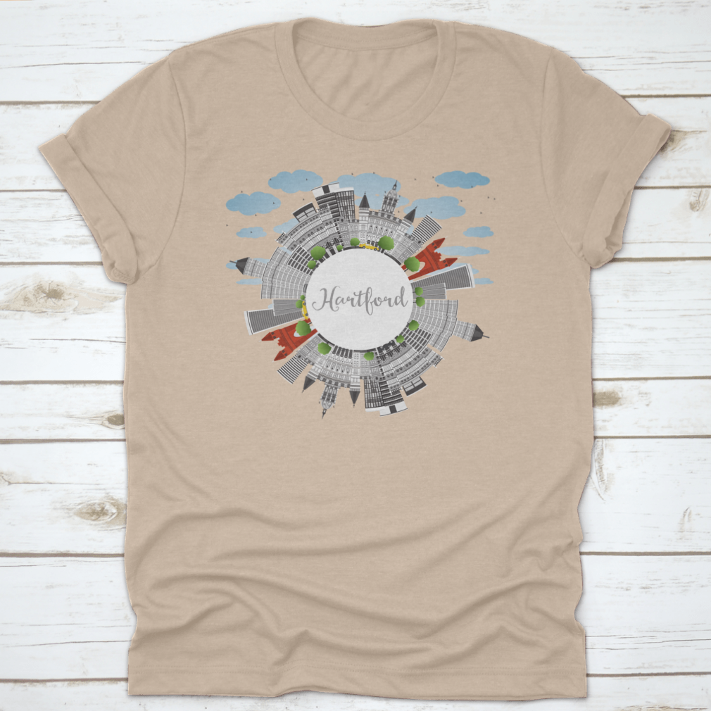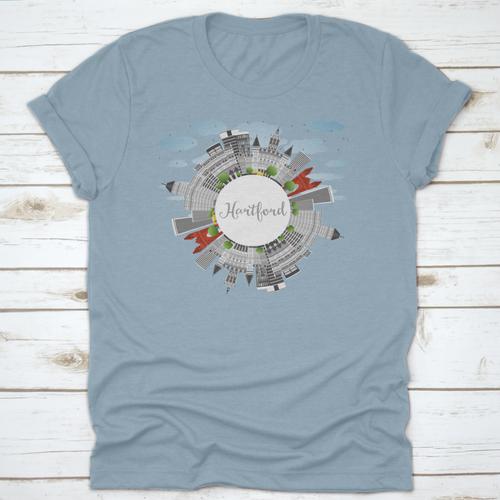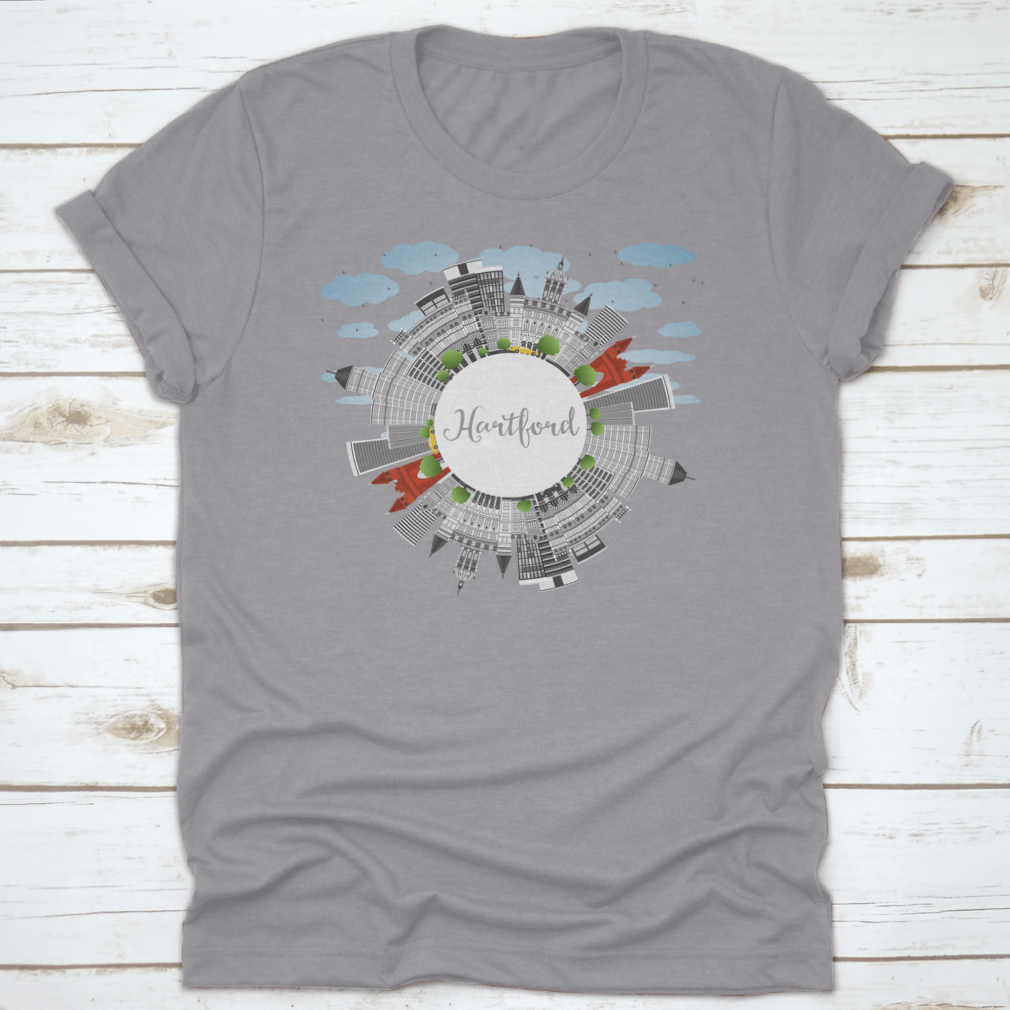 A stylish t-shirt featuring the Hartford Skyline with gray buildings, perfect for business travel and tourism enthusiasts.
