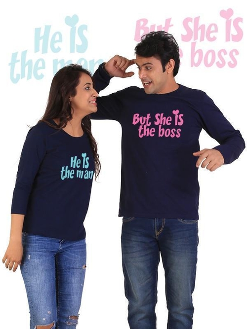 The 'He is the Man, She is the Boss' t-shirts feature a maximum fit design, providing a flattering silhouette for both men and women. The full sleeves add an extra layer of warmth, making them ideal for cooler days or evenings out. Whether you're heading to a casual brunch, a movie night, or a romantic date, these t-shirts will keep you looking stylish and feeling comfortable.