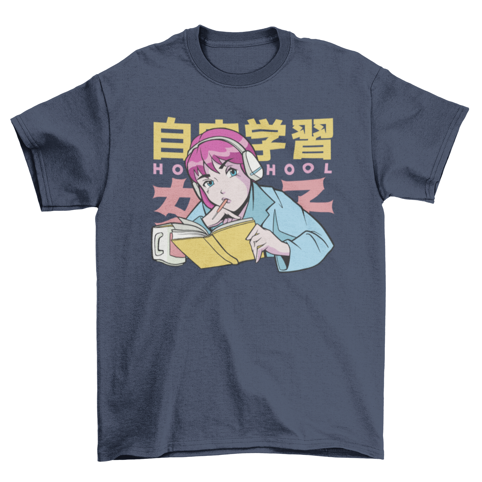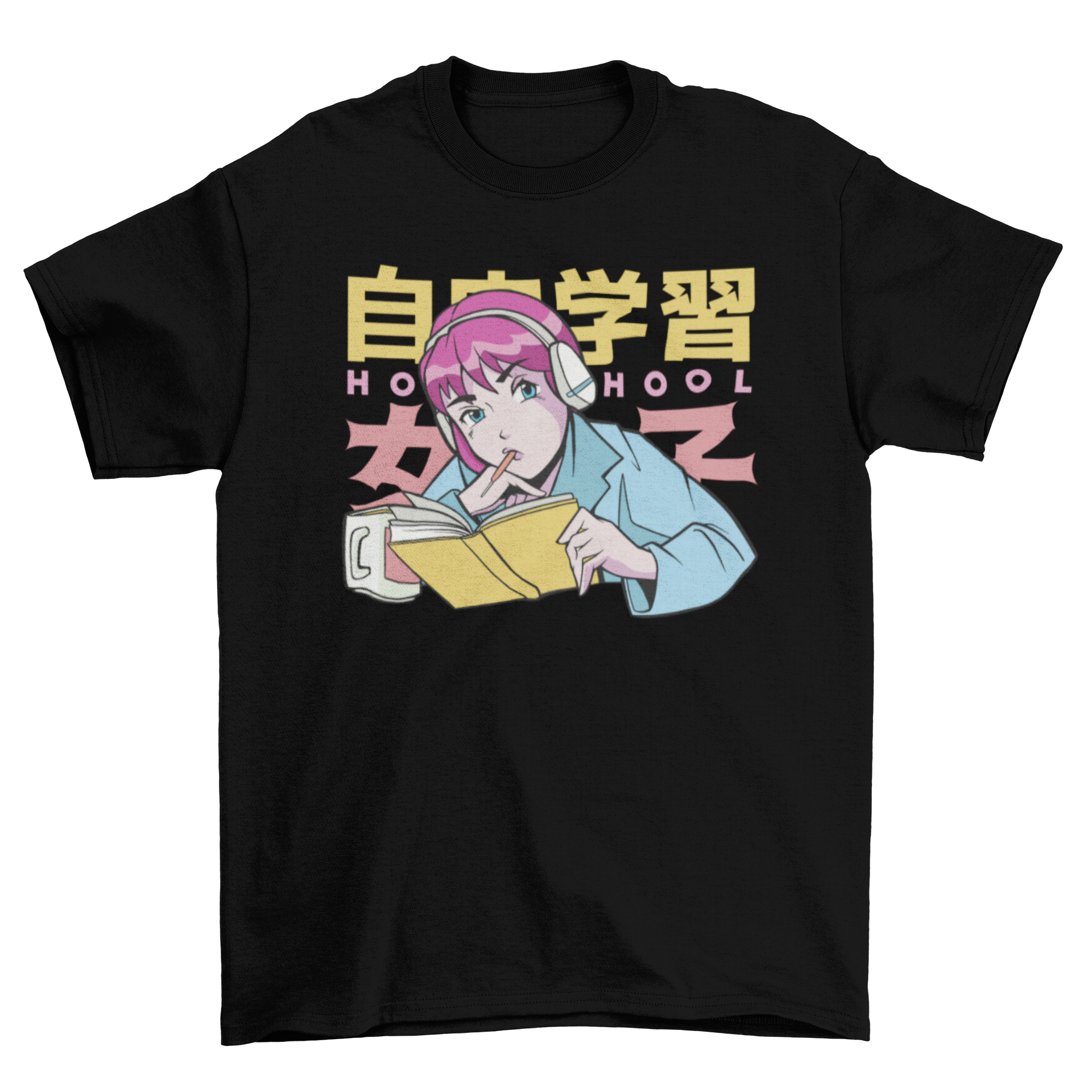 A stylish t-shirt featuring a girl studying at home with headphones, surrounded by Japanese characters, symbolizing education and culture.