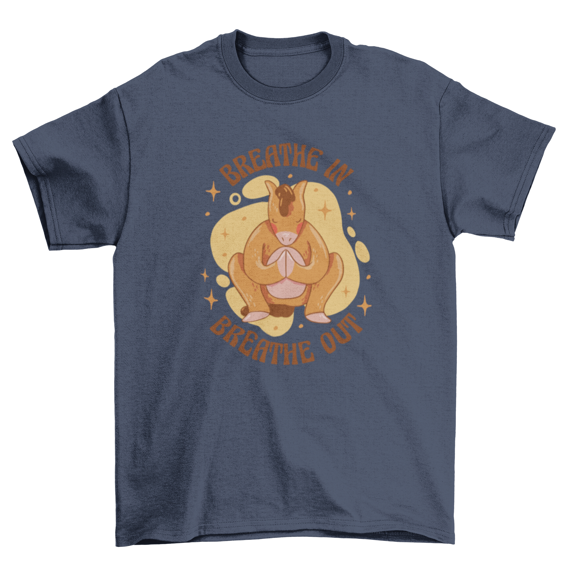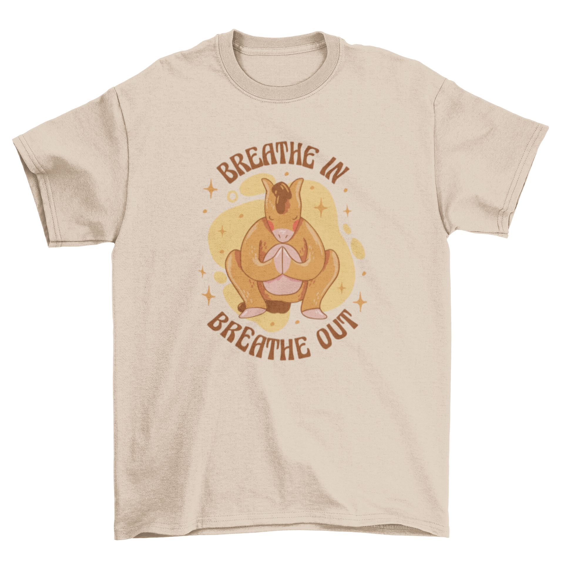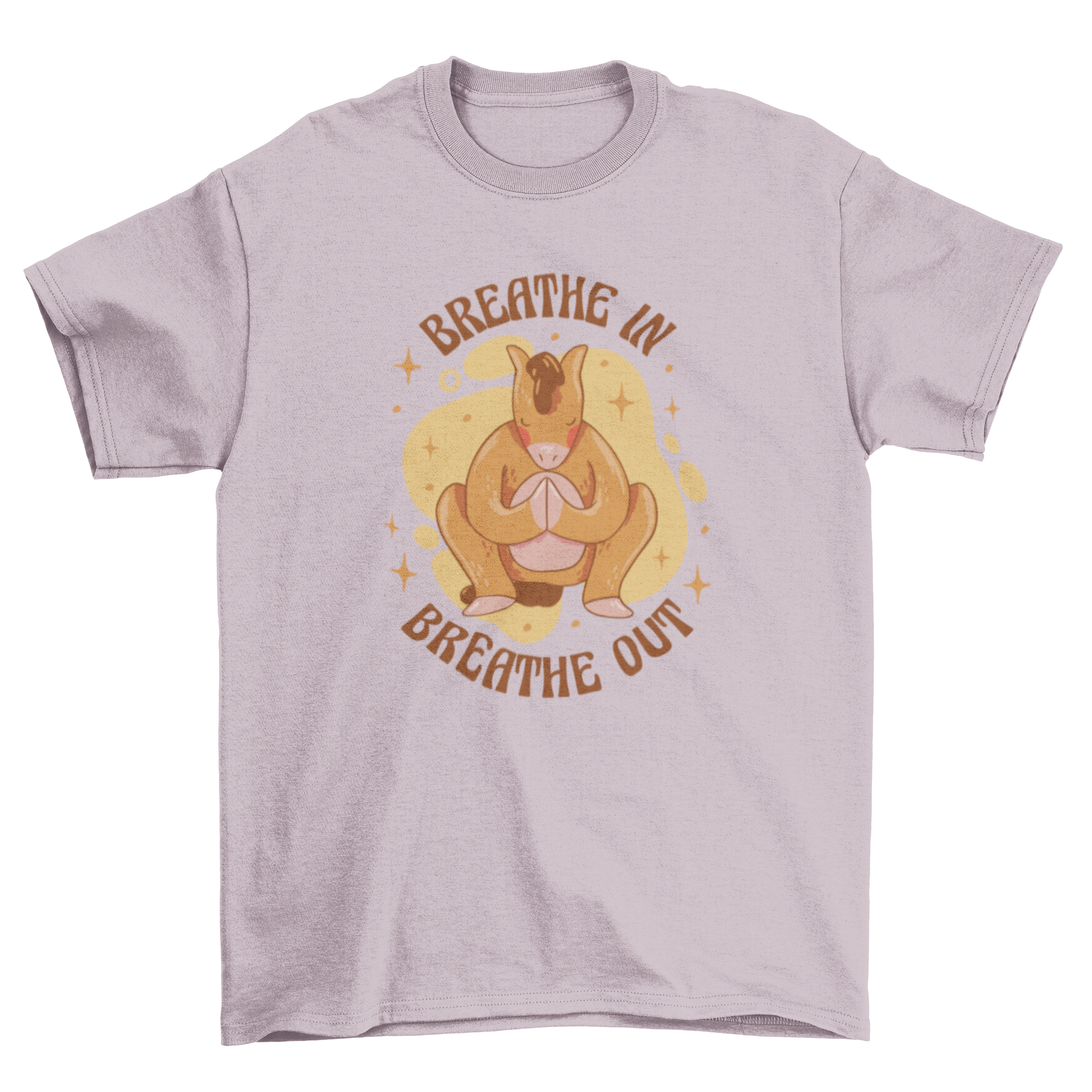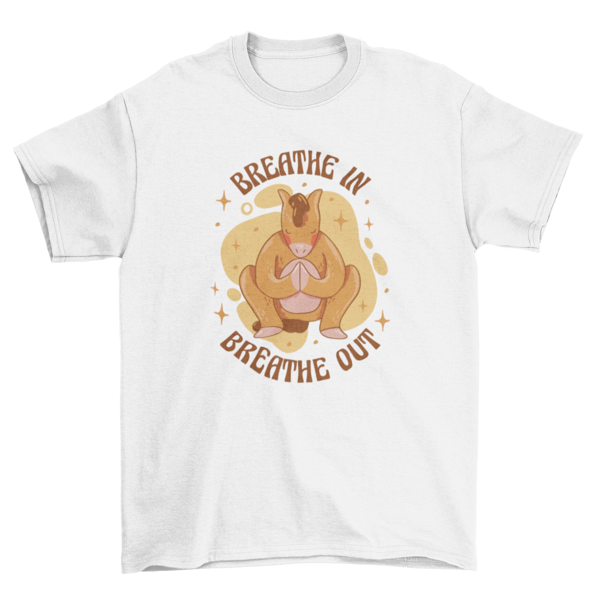 Introducing our Horse in Yoga Pose T-shirt, a perfect blend of fitness and animal love. This unique design features a horse gracefully performing a yoga pose, accompanied by the inspiring quote, "Breathe in, breathe out." This shirt is not just a piece of clothing; it's a statement of your passion for both yoga and the majestic beauty of horses.