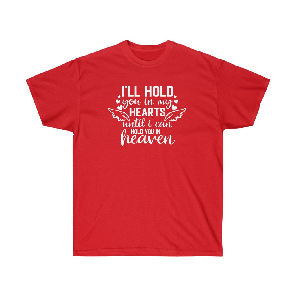 Introducing our heartfelt t-shirt, 'I will hold you in my Heart til I can hold you in Heaven'. This unique piece is not just a clothing item; it’s a beautiful expression of love and remembrance. Crafted from 100% soft cotton, this t-shirt ensures comfort while making a poignant statement. Whether you’re looking to honor a loved one or simply want to wear a message that resonates with your heart, this t-shirt is the perfect choice.