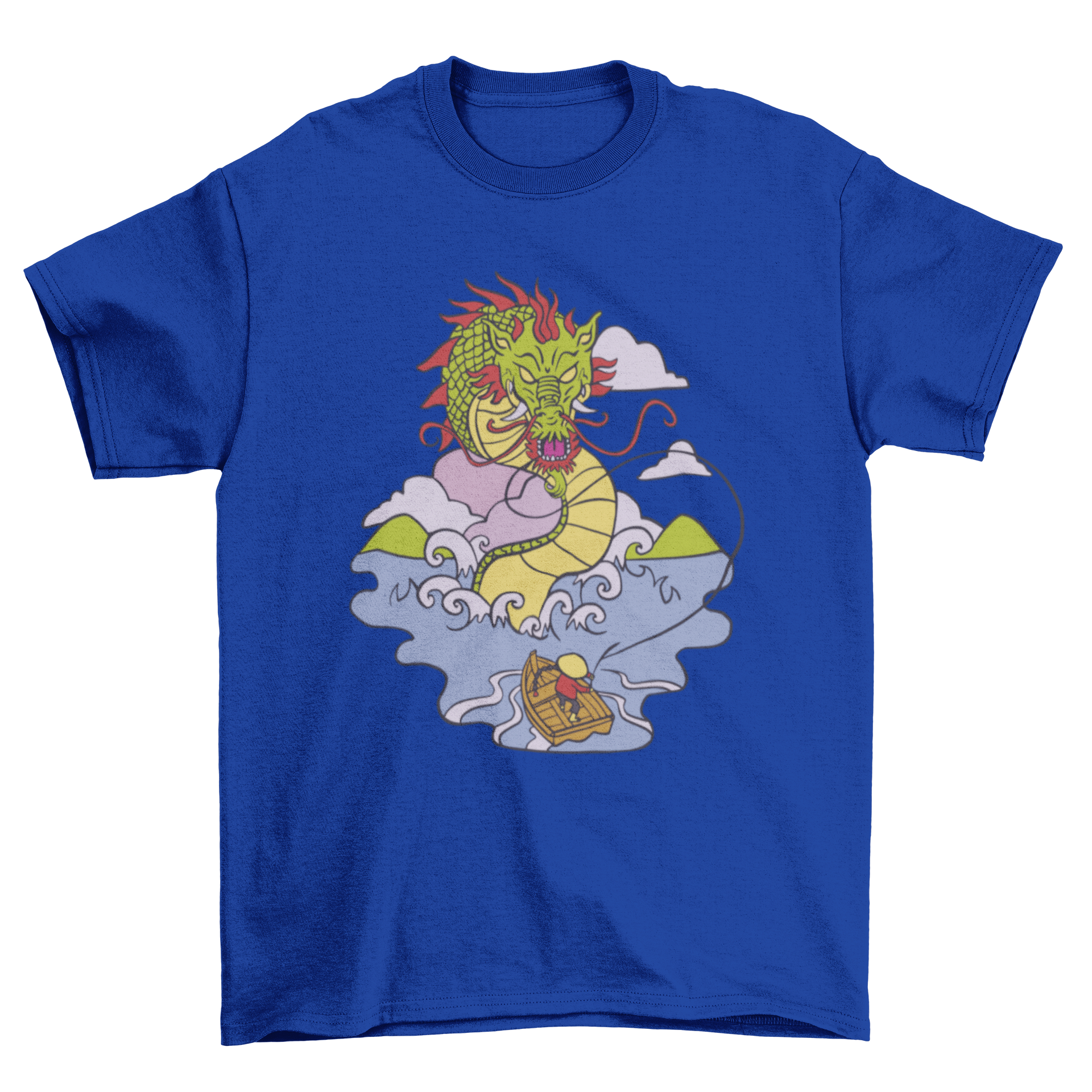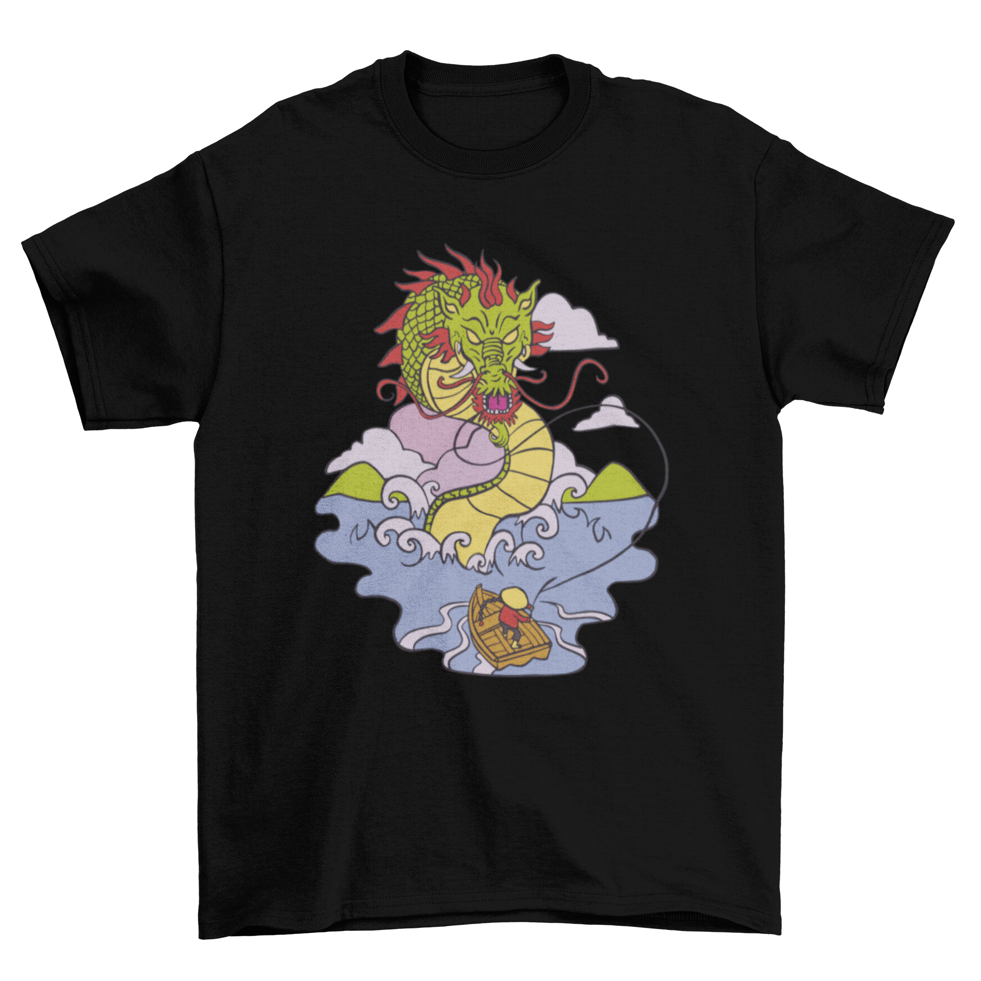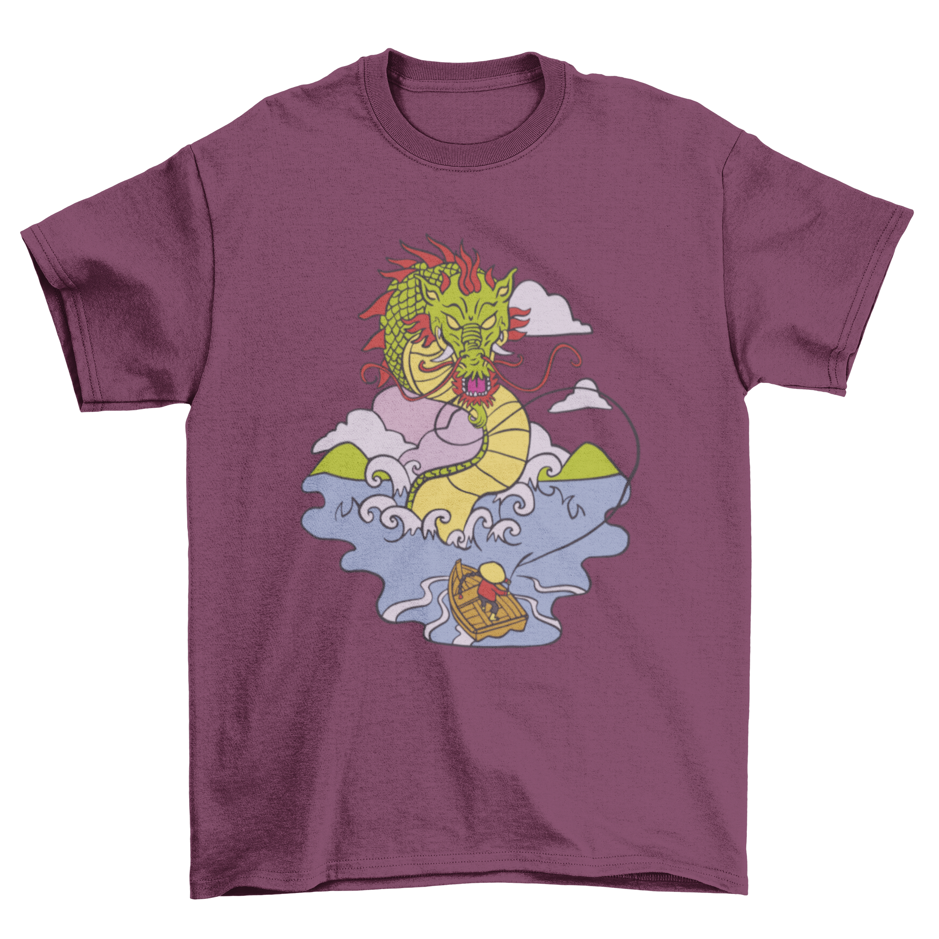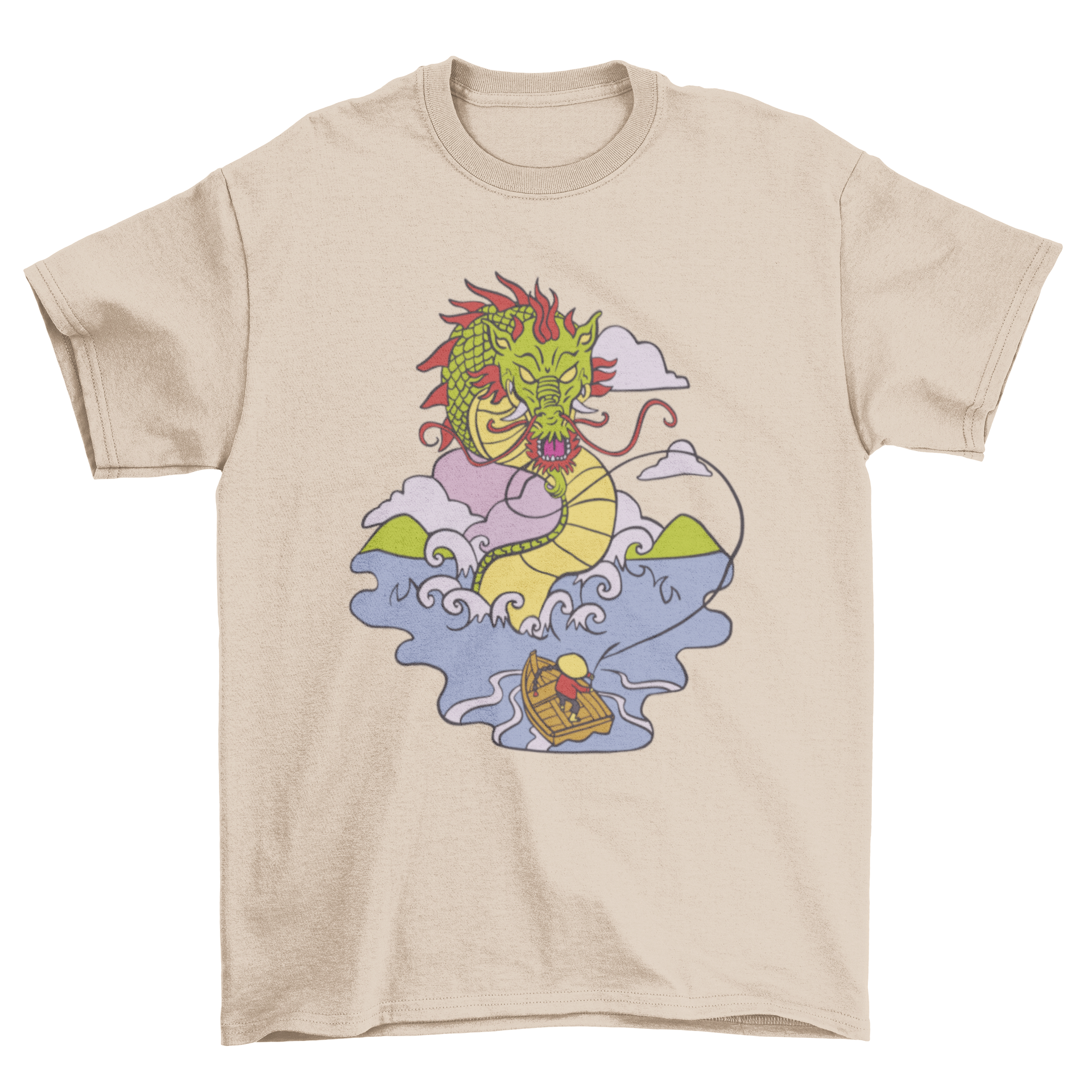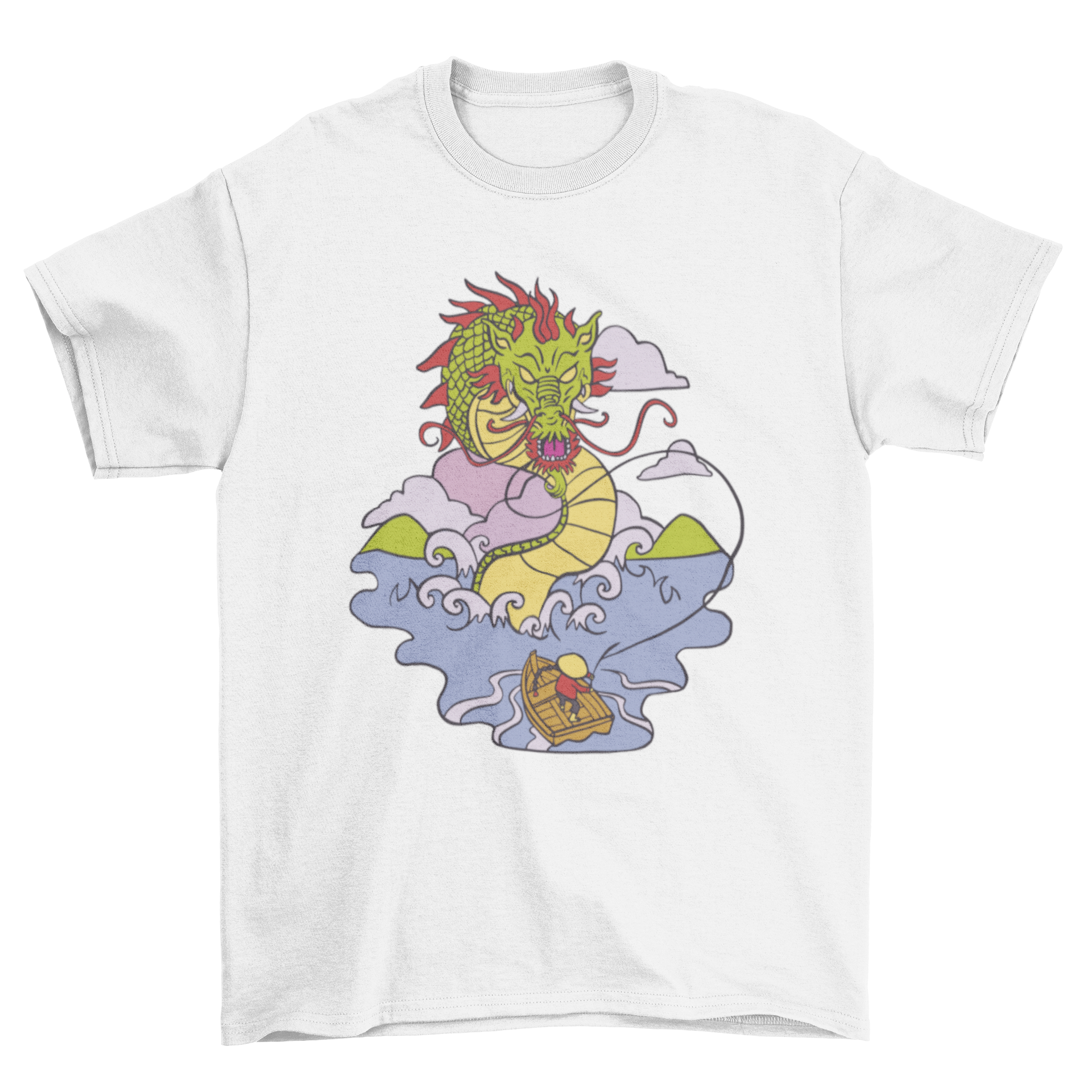 A vibrant t-shirt featuring a water dragon emerging from a lake with a man fishing in a boat, showcasing a unique and artistic design.