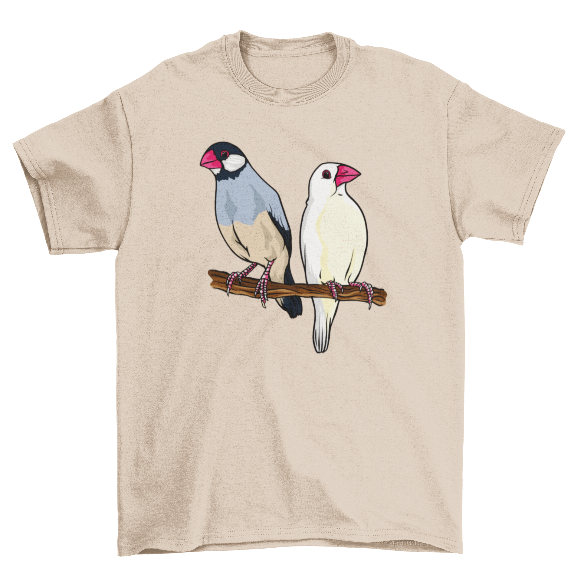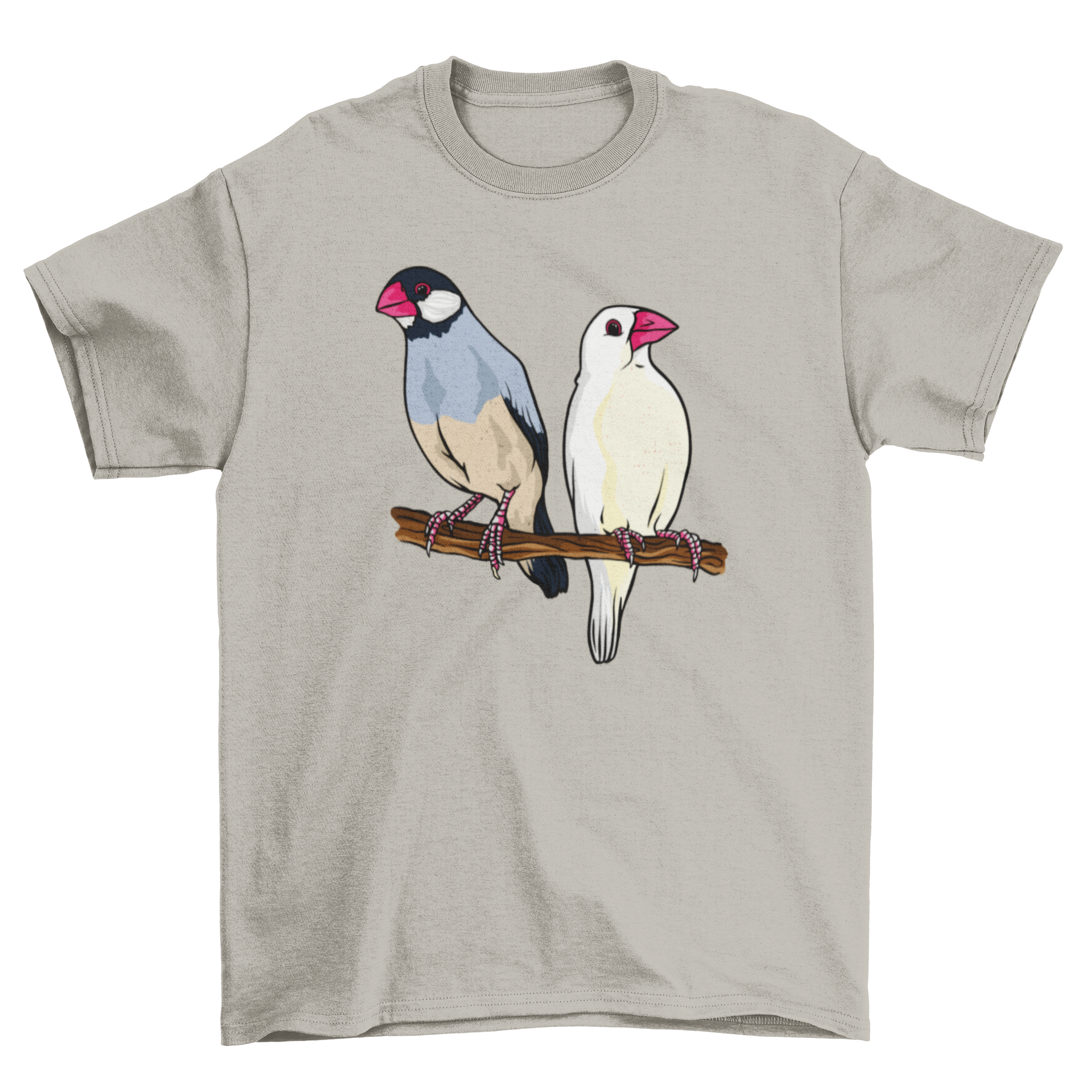Introducing our exclusive Java sparrow t-shirt, a must-have for bird enthusiasts and fashion lovers alike. This stylish t-shirt showcases a stunning design featuring two Java sparrow birds, one adorned with a striking white body and a vibrant red beak, while the other boasts a captivating black and white head. The intricate details of these beautiful birds are sure to catch the eye and spark conversations wherever you go.