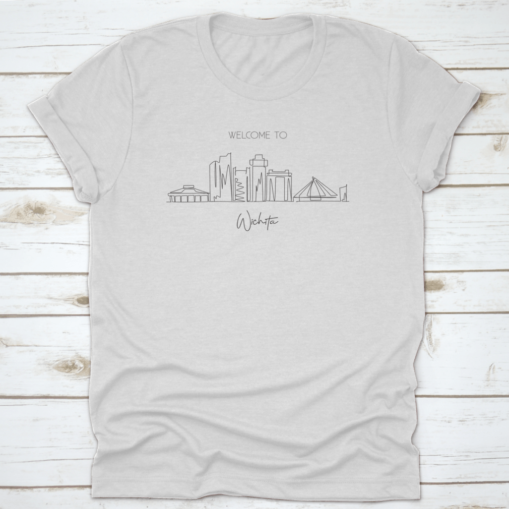 A stylish t-shirt featuring a line drawing of the Wichita City Skyline, showcasing iconic buildings and landmarks in Kansas.