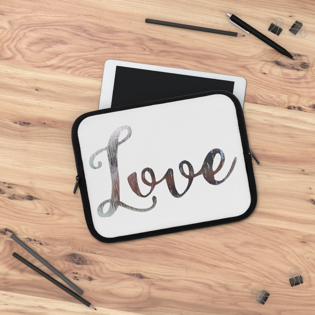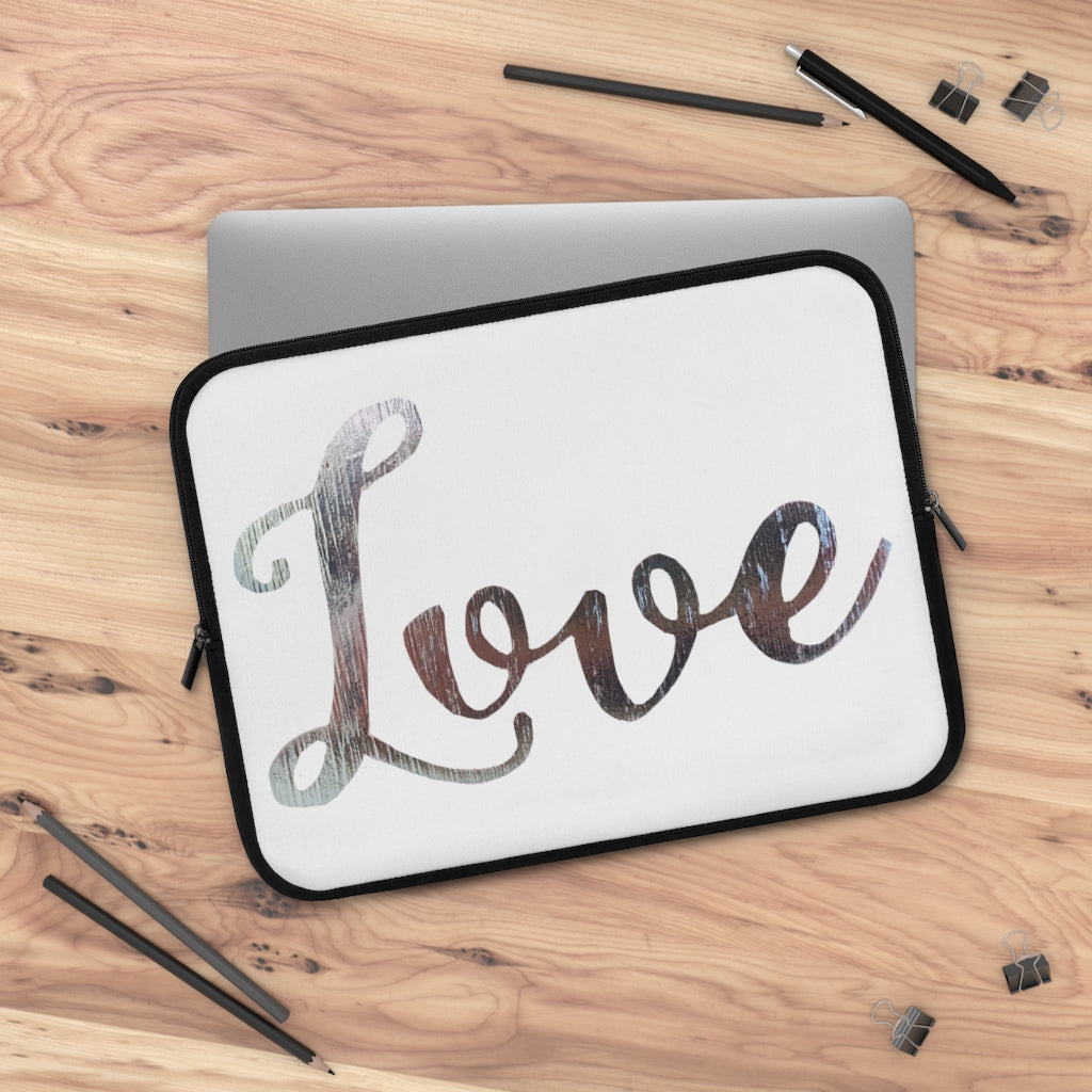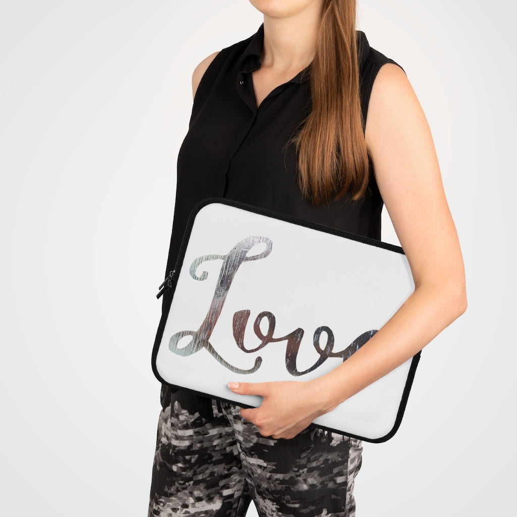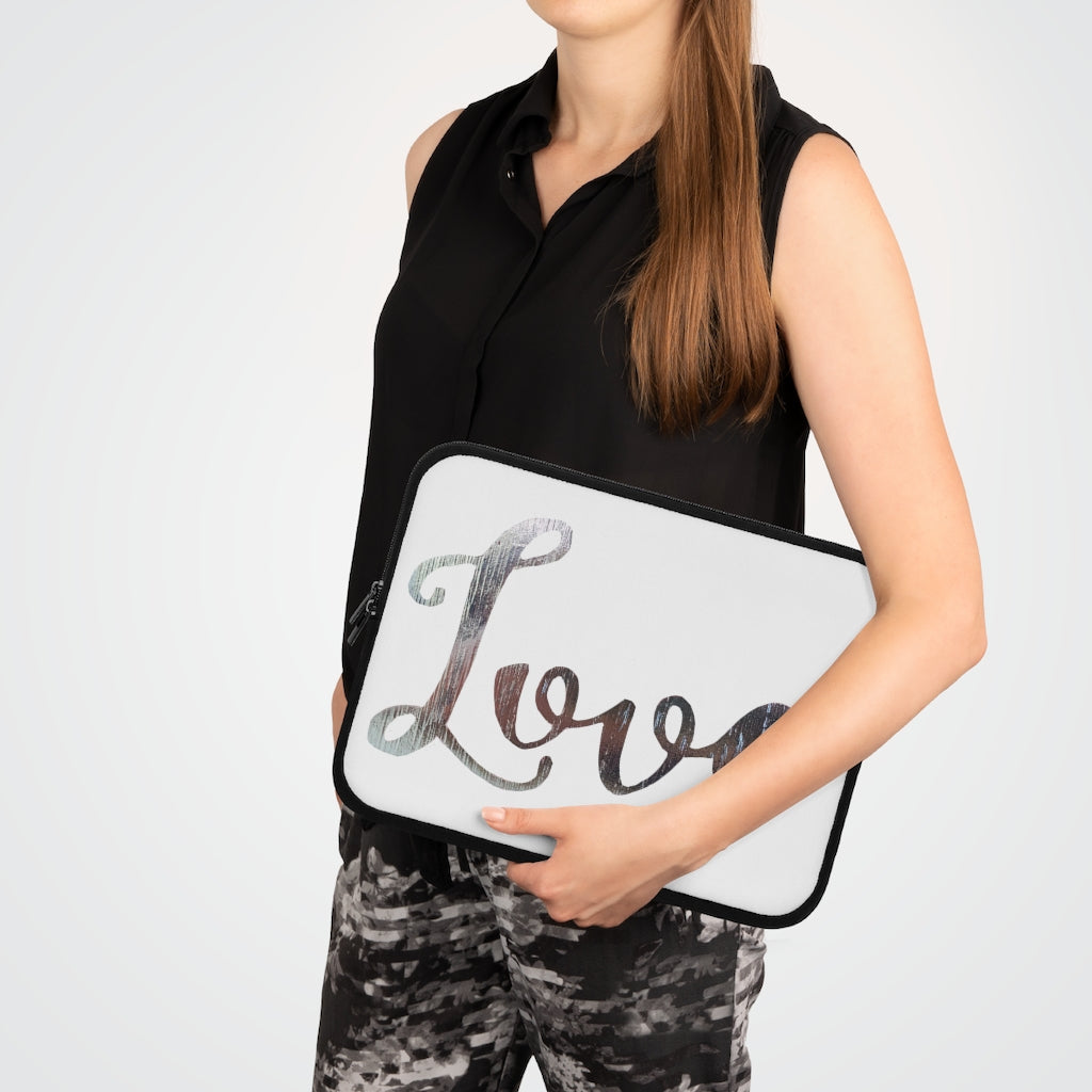 A stylish Love Laptop Sleeve made of smooth neoprene, featuring a customizable front and a solid black back, designed for laptops of various sizes.