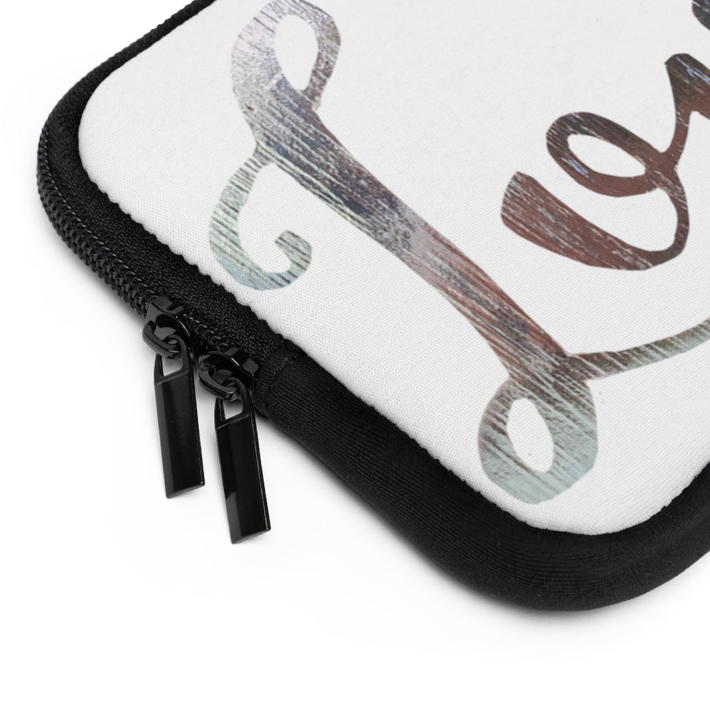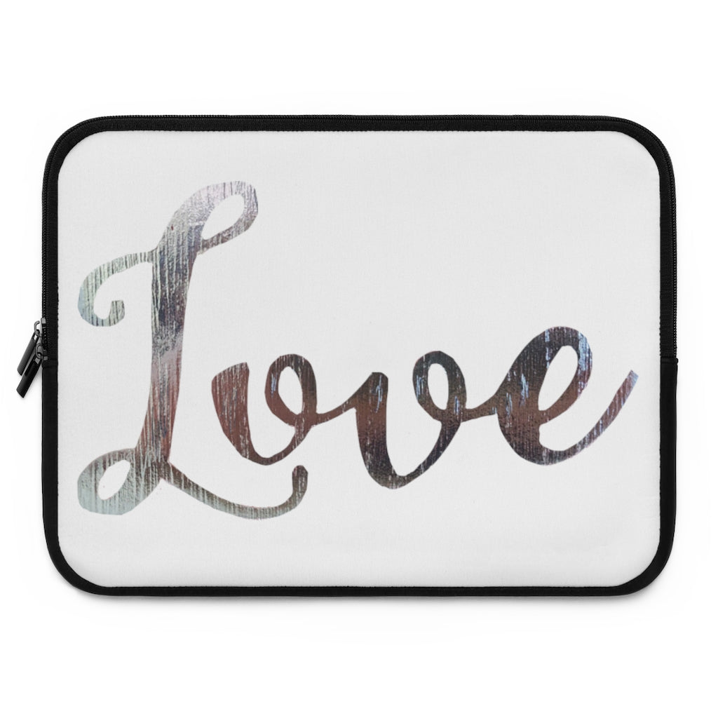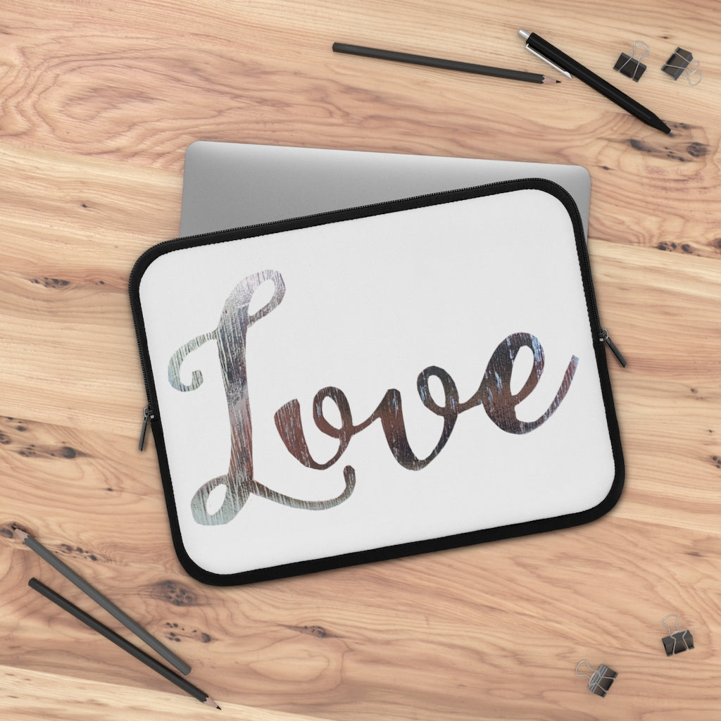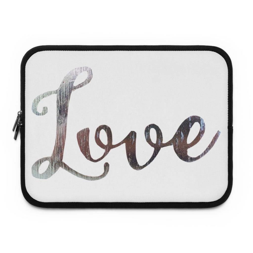 A stylish Love Laptop Sleeve made of smooth neoprene, featuring a customizable front and a solid black back, designed for laptops of various sizes.