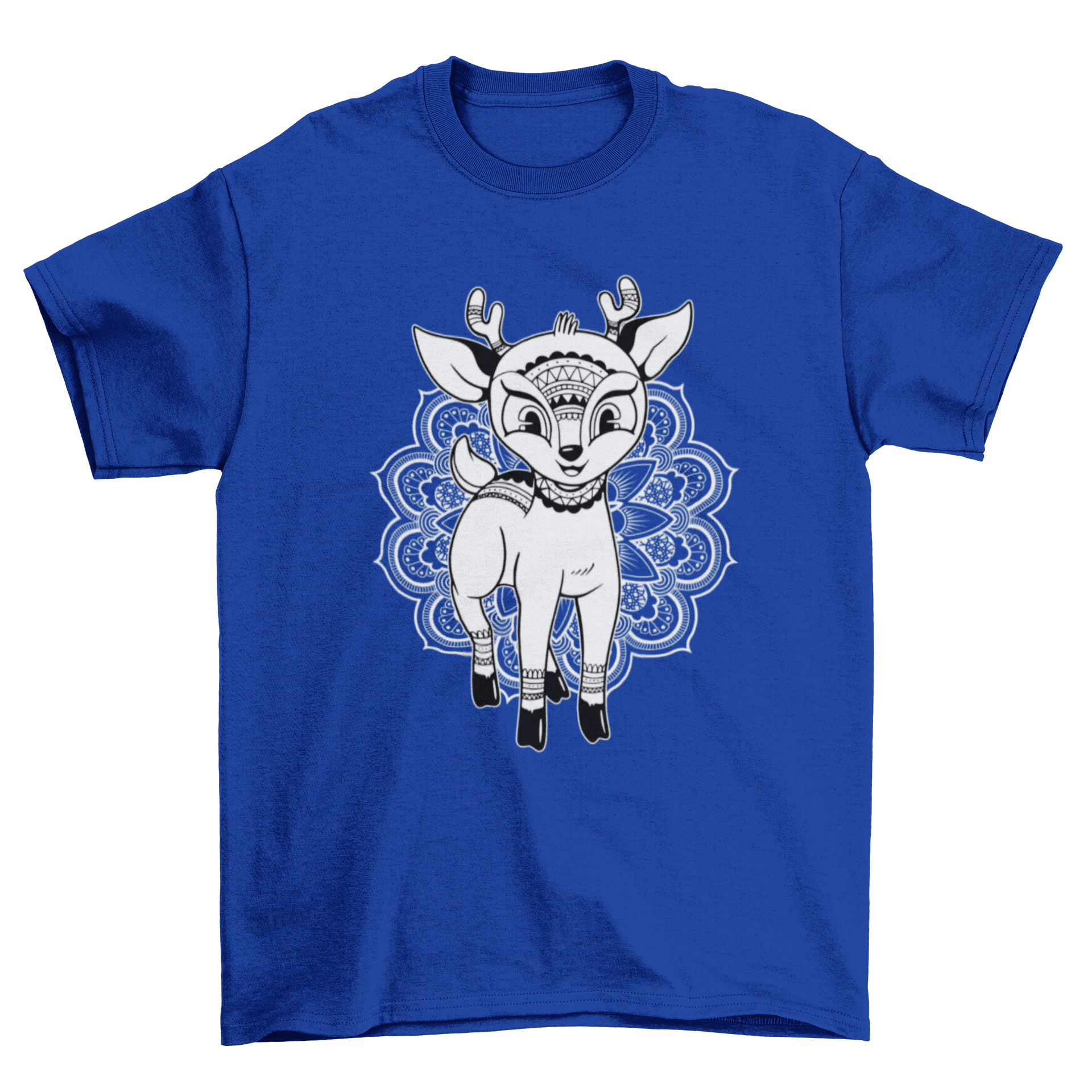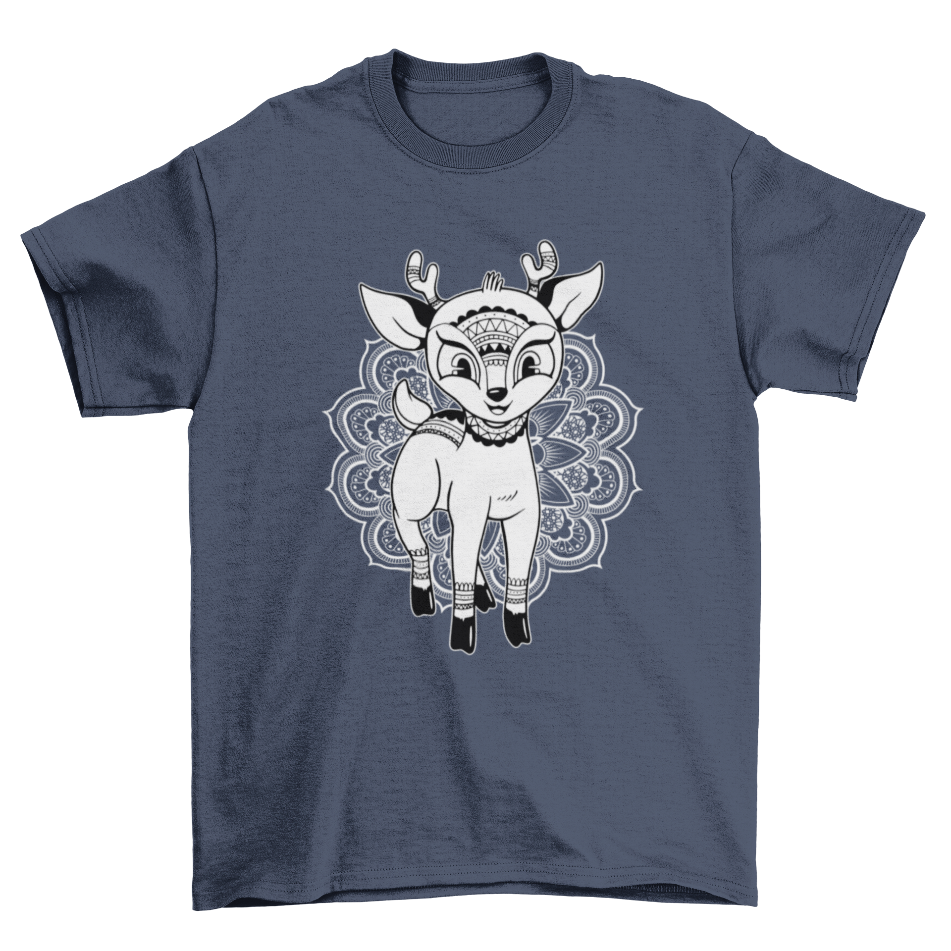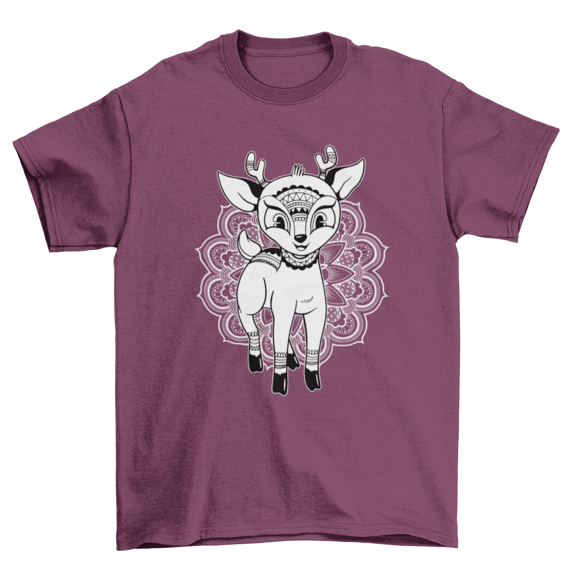 The standout feature of this T-shirt is undoubtedly the captivating illustration of the baby deer. The deer, often seen as a symbol of gentleness and grace, is depicted in a charming and whimsical manner. The intricate mandala design behind the deer adds depth and character, making this T-shirt a true work of art. Whether you're wearing it for a casual outing or a nature-themed event, this design is sure to turn heads.