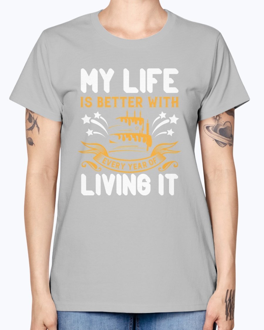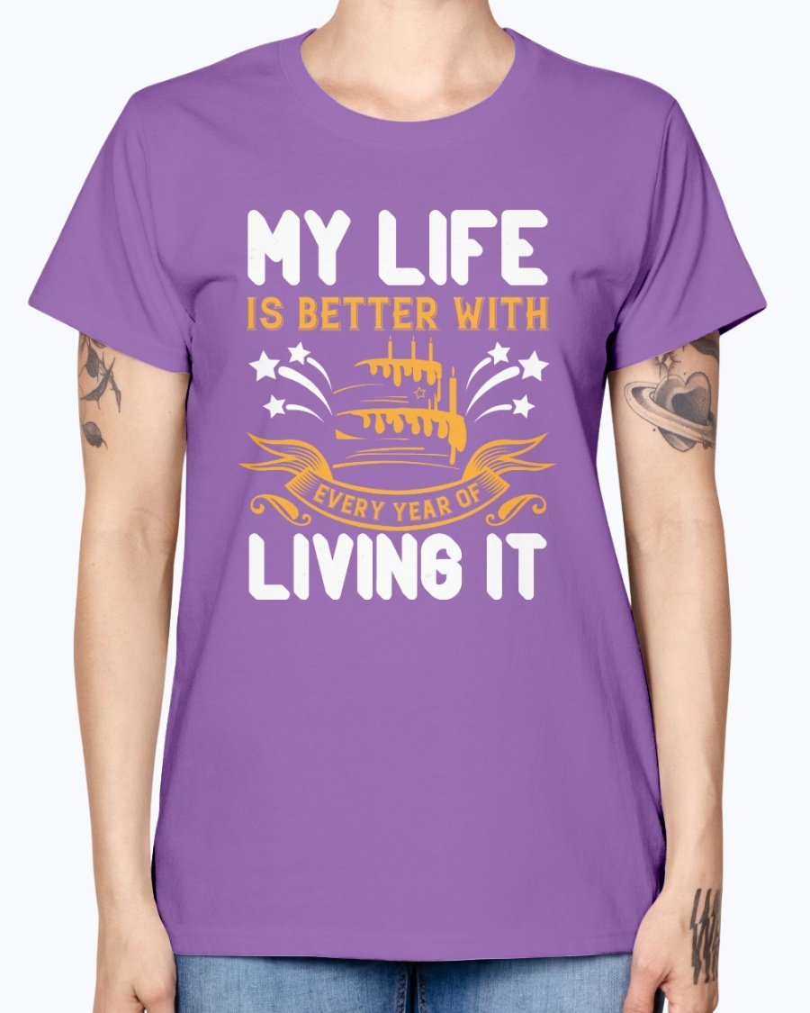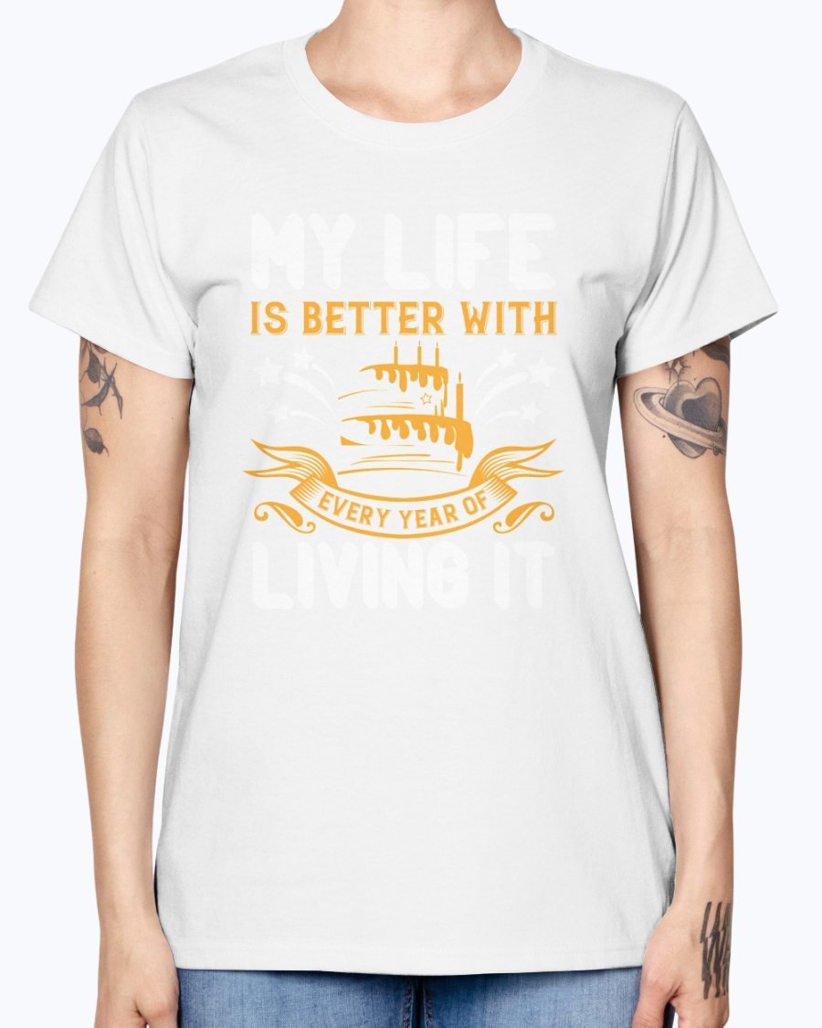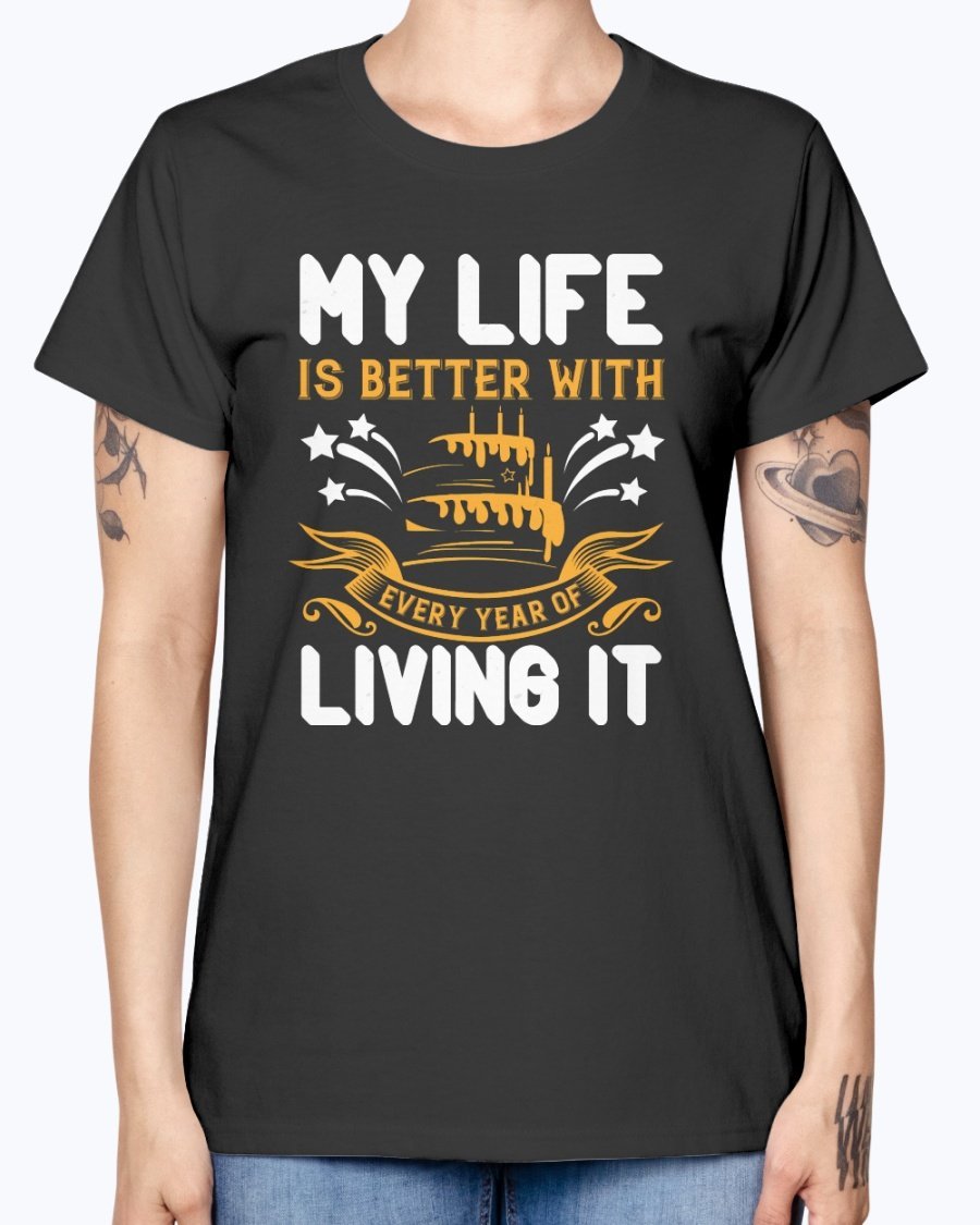 In summary, the 'My life is better with every year of living it' Birthday T-shirt is not just a piece of clothing; it's a celebration of life and all the wonderful moments that come with it. With its comfortable fit, stylish design, and quality material, this T-shirt is a must-have for anyone looking to celebrate their birthday in style.
